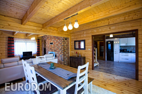Dom parterowy z bali. Duży salon z aneksem kuchennym, kominkiem i wyjściem na taras. Dwa pokoje, łazienka, kotłownia, korytarz i wiatrołap. Wyjście na poddasze schodami strychowymi rozkładanymi. Instalacja solarna.