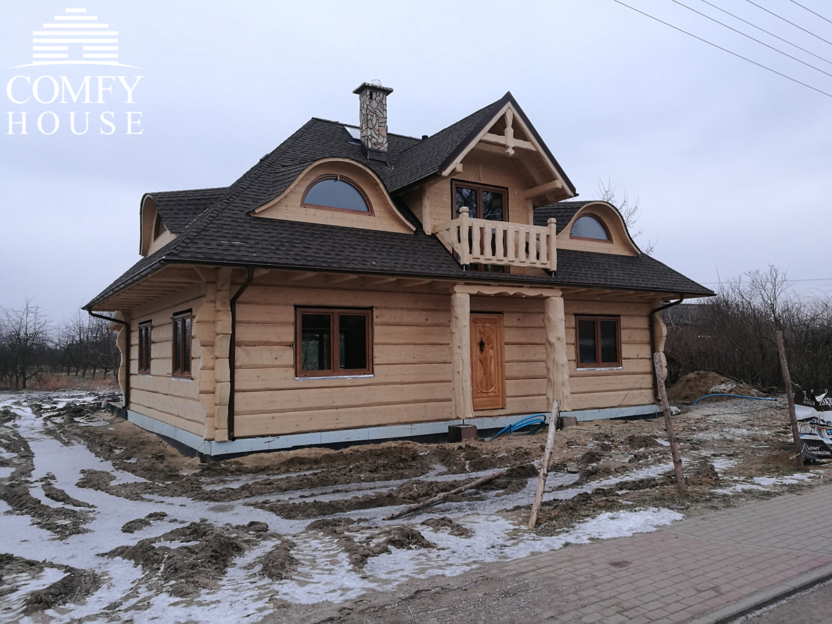 Dom z bali drewnianych. Duży salon z aneksem kuchennym, kominkiem i wyjściem na taras. Pokój, wc, wiatrołap, garderoba, spiżarka i komunikacja. Na poddaszu cztery pokoje, łazienka i komunikacja. Częściowe podpiwniczenie (kotłownia, pralnia i komunikacja).