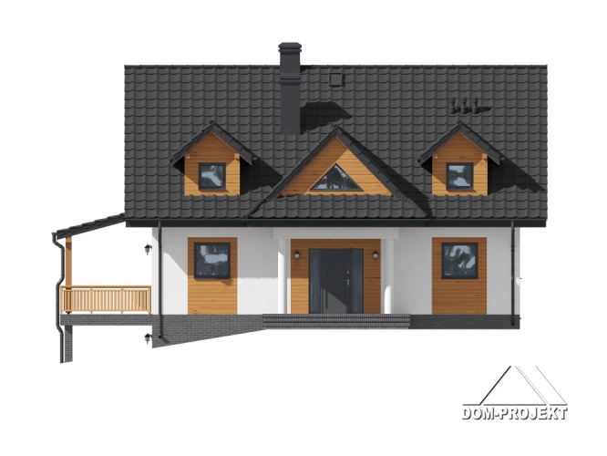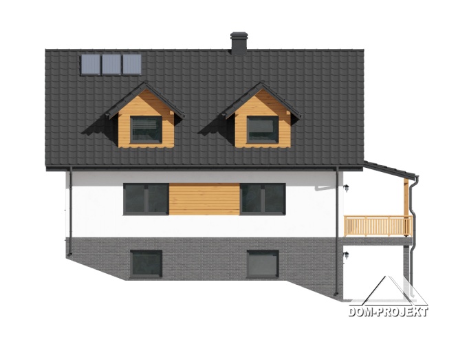Funkcjonalny dom, doskonały dla osób szukających projektu na działkę ze spadkiem terenu. Na parterze do dyspozycji salon z wygodną kuchnią i spiżarką, dodatkowy pokój , oraz łazienka. Na poddaszu przewidziano cztery dobrze doświetlone sypialnie i łazienkę. Zaplecze gospodarcze domu zlokalizowano w piwnicy.