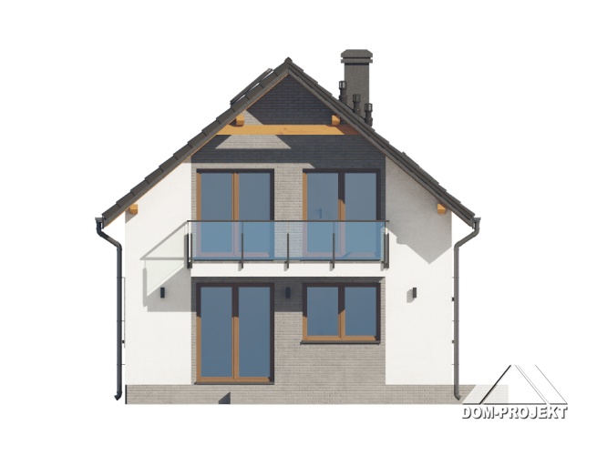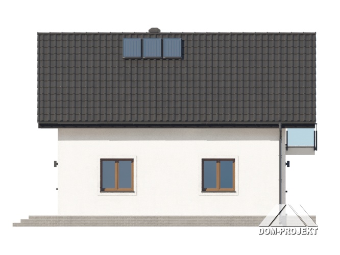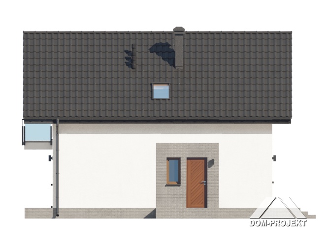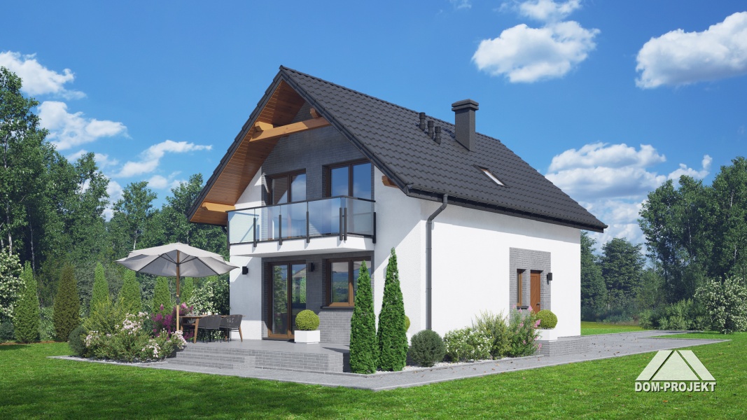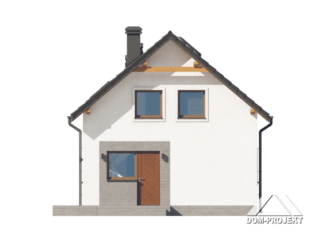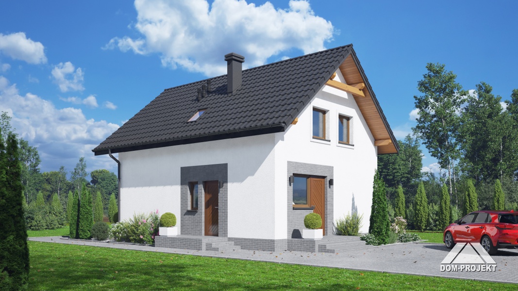 Dom z poddaszem użytkowym. Na parterze salon z aneksem kuchennym oraz wyjściem na taras. Pokój, łazienka, kotłownia, komunikacja, wiatrołap. Na poddaszu trzy pokoje, łazienka, komunikacja. Zwarta bryła budynku oraz dach dwuspadowy sprzyjają szybkiej i taniej budowie oraz niskim kosztom eksploatacji.