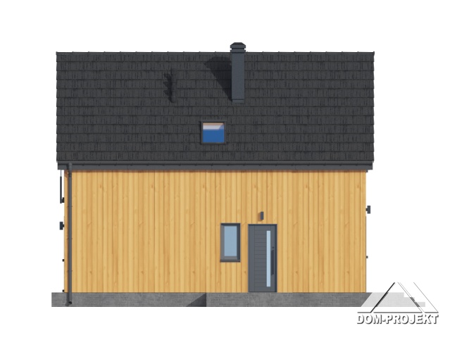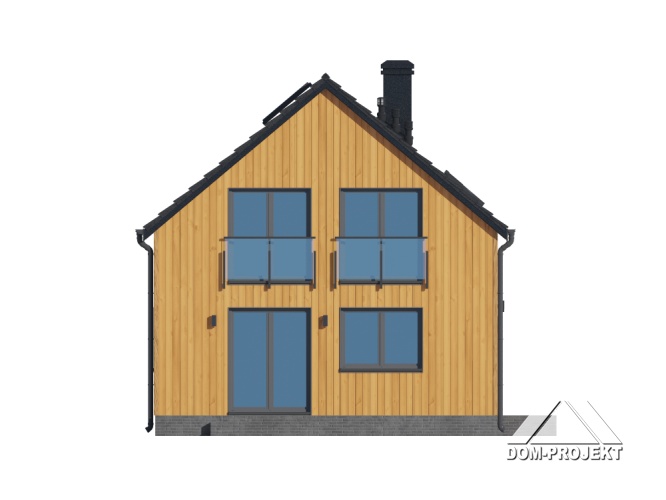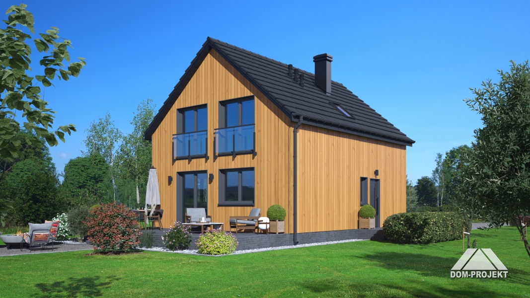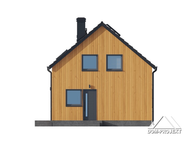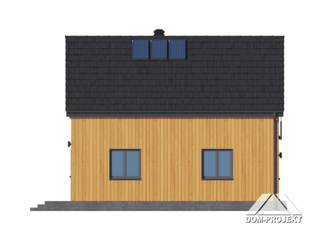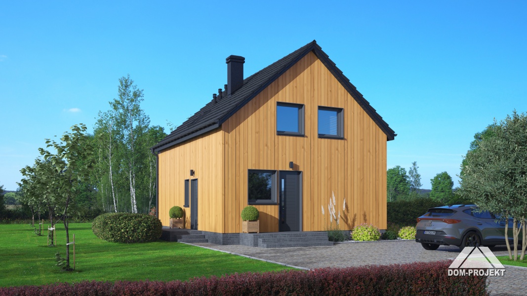 Dom z poddaszem użytkowym. Na parterze salon z kuchnią oraz wyjściem na taras. Pokój, łazienka, kotłownia, komunikacja, wiatrołap. Na poddaszu trzy pokoje, łazienka, komunikacja. Zwarta bryła budynku oraz dach dwuspadowy sprzyjają szybkiej i taniej budowie oraz niskim kosztom eksploatacji.