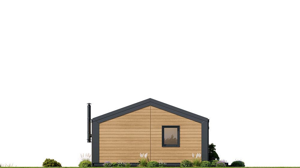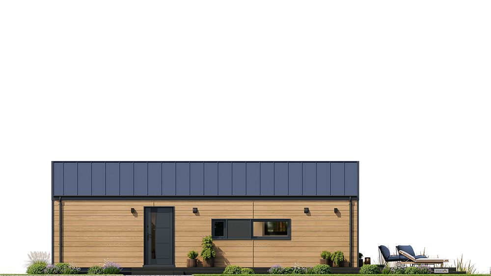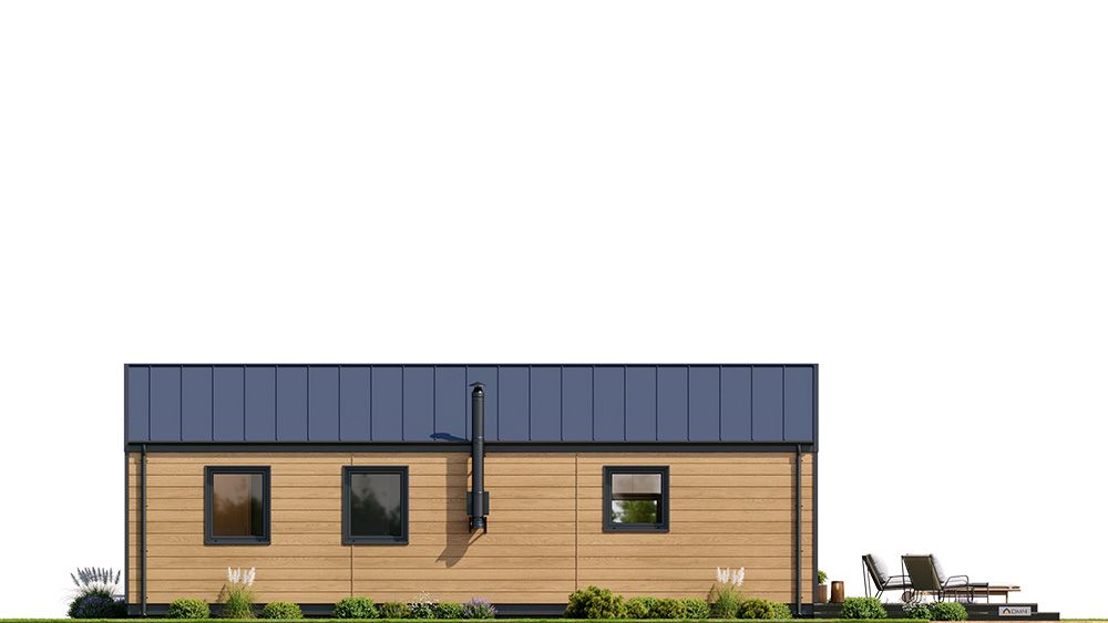 Projekt domu MG 2 wariant 15 – w wersji drewnianej szkieletowej. MG2 wariant 15 drewniany to projekt niedużego parterowego domu jednorodzinnego, przeznaczonego dla 3-4 osobowej rodziny. Budynek ma prostokątną bryłę, przykrytą dwuspadowym dachem. Dach bazowo ma kąt nachylenia 20 stopni, ale można w łatwy sposób zmienić go na wyższy kąt – na przykład 30 lub 35 stopni, jeśli jest taka konieczność. Konstrukcję domu przewidziano jako szkieletową drewnianą, wykonaną z drewna konstrukcyjnego C24 i KVH. Konstrukcja dachu została zaprojektowana w układzie krokwiowym. Krokwie wsparte są na środkowej ścianie konstrukcyjnej i drewnianym podciągu w salonie. Zarówno pokój dzienny jak i pokoje sypialne mają sufity otwarte aż do wysokości kalenicy, dzięki czemu zyskujemy we wnętrzu większą wysokość pomieszczeń i większą przestrzeń. Główną atrakcją wnętrza domu jest oczywiście przeszklona ściana szczytowa, łącząca salon z tarasem i otaczającym ogrodem. Dzięki tak ukształtowanemu wnętrzu ten nieduży 80-metrowy dom sprawia wrażenie znacznie większego. Poza częścią dzienną, pozostałe pomieszczenia we wnętrzu to trzy wygodne sypialnie, łazienka, oddzielna toaleta i przedsionek z szafami. Instalacje grzewcze w budynku przewidziano zasilane kotłem gazowym dwufunkcyjnym, umieszczonym w pomieszczeniu łazienki, lub zamiennie niedużą pompą ciepła powietrze-woda, również umieszczoną w łazience. Posiadamy też wariant ogrzewania elektrycznego, z grzejnikami elektrycznymi i klimatyzatorami z funkcją grzania. Dodatkowe źródło ciepła może stanowić kominek typu koza umieszczony w salonie. Wentylacja w budynku zaprojektowana jest jako mechaniczna z rekuperacją. Można też zastosować tradycyjną wentylację grawitacyjną. Wszystkie przegrody zewnętrzne : ściany, dach – zaprojektowano jako bardzo dobrze ocieplone, izolacją z wełny mineralnej o wysokiej lambdzie. Dodatkowo można zwiększyć izolację ścian o warstwę wełny drzewnej – zapobiegającej przegrzewaniu wnętrza. . Budynek ma zwartą bryłę i niedużą kubaturę. Jest to budynek energooszczędny – tani i prosty w budowie eksploatacji. Elewacje zewnętrzne domu bazowo zaproponowano z okładziny drewnianej. Dom można również wykończyć tynkiem cienkowarstwowym – dowolnie, wedle gustu przyszłych właścicieli. MG2 wariant 15 drewniany – to doskonała propozycja dla osób planujących budowę prostego, niedużego domu, funkcjonalnego w użytkowaniu i ekonomicznego w eksploatacji. Dom MG2 należy do serii projektów z naszej firmy produkującej gotowe domy modułowe : DMH – Dream Mobil House / Dream Wood House. Projekt typowy w wersji szkieletowej drewnianej, kierujemy do osób, które chcą samodzielnie wybudować swój przyszły dom z lokalnym wykonawcą, według tego projektu. Natomiast dla osób chcących zamówić kompleksowo gotowy dom w jednaj firmie, zapraszamy do współpracy z nami w ramach naszej firmy DMH. Zapraszamy !