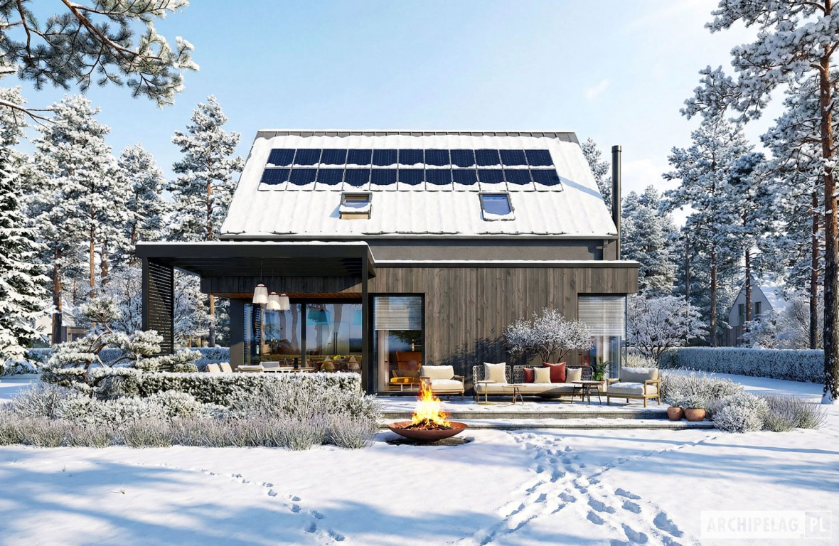 Mini 13 – dom z pergolą od strony ogrodu, standardowe instalacje: