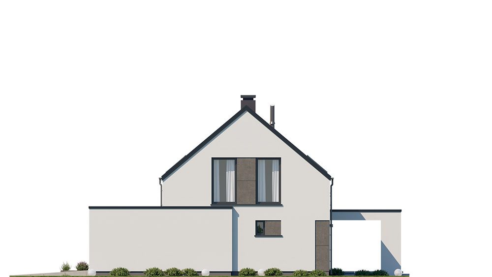 Projekt domu Przyjemny 6, przeznaczony dla 3-5 osobowej rodziny. Projekt domu parterowego z poddaszem użytkowym, zbudowany na prostokątnym rzucie, przykryty dwuspadowym dachem, z jednostanowiskowym garażem. Architektura budynku łączy w sobie tradycyjną bryłę z nowoczesnymi detalami. Dwuspadowy dach koresponduje tutaj z nowoczesnym detalami wykończenia ścian. Przyjemny 6 jest funkcjonalny, ma spokojną stonowaną, ponadczasową stylistykę. W budynku, mimo niewielkiej powierzchni, udało się uzyskać wygodne i funkcjonalne wnętrze pozwalające komfortowe mieszkać minimum czteroosobowej rodzinie. Na parterze zaprojektowano przestrzeń dzienną salonu, holu i kuchni, dodatkowy pokój oraz garaż jednostanowiskowy. Pod schodami przewidziano schowek. Na poddaszu zaprojektowano wariantowo : cztery sypialnie. Na parterze w pokoju dziennym – szerokie przeszklenie balkonowe otwiera wnętrze na taras i ogród. Zaproponowaliśmy tam drzwi przesuwne, ale można je oczywiście zastąpić tańszymi drzwiami balkonowymi z szerokim oknem do ziemi. Daszek nad tarasem to pergola przykryta poliwęglanowymi płytami. Konstrukcja może być drewniana lub aluminiowa. Można też zastąpić pergolę markizą lub żaglem – dowolnie. Nie jest to element stały budynku. „Przyjemnego 6” zaprojektowaliśmy jako dom maksymalnie prosty i łatwy w budowie. Jego prosta konstrukcja będzie łatwym zadaniem dla dowolnej ekipy. Nie ma tutaj dużych podciągów, podrażających konstrukcję elementów stalowych. Prosta bryła bez udziwnień i dobre izolacje termiczne przegród dają w efekcie dom energooszczędny. Instalacja c.o. bazowo zasilana jest z kotła gazowego, ale można też zastosować tutaj kocioł na paliwo stałe, albo pompę ciepła. „Przyjemny 6” to doskonała propozycja dla osób planujących budowę niedużego, funkcjonalnego domu, za skończoną określoną kwotę -bez przesady i bujania w obłokach. Dla Inwestorów wolących mieć dom mniejszy, za to lepiej i do końca wykończony. To projekt dla osób pragnących architektury ponadczasowej, osadzonej w tradycji, w nowoczesnym ujęciu, która nie zestarzeje się wraz z odchodzącymi chwilowymi modami. Zapraszamy !