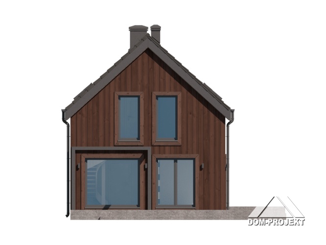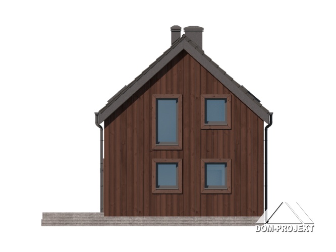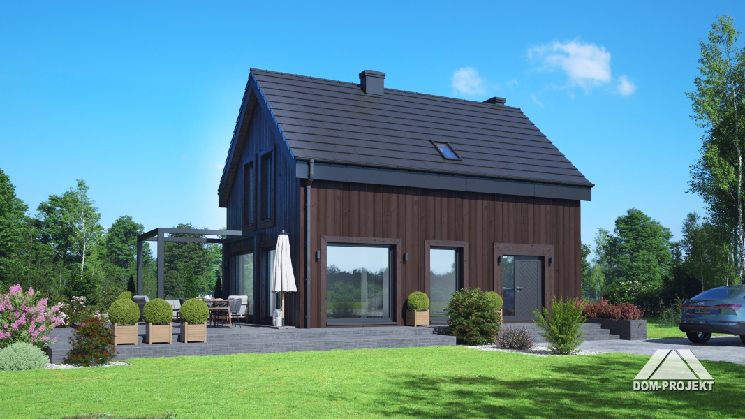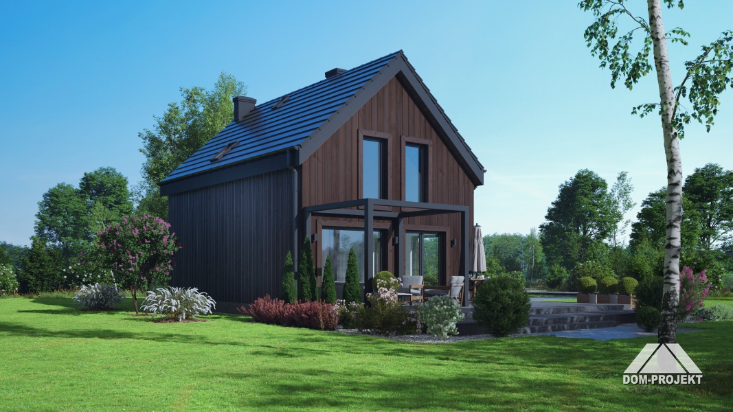 Dom w konstrukcji szkieletu drewnianego. Na parterze salon z kuchnią, kominkiem, wyjściem na taras i schodami na poddasze. Łazienka, kotłownia, wiatrołap. Na poddaszu trzy pokoje, garderoba, łazienka, komunikacja. Zwarta bryła budynku oraz dach dwuspadowy sprzyjają szybkiej i taniej budowie oraz niskim kosztom eksploatacji.