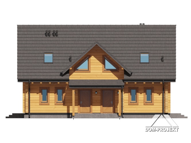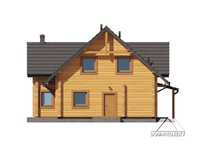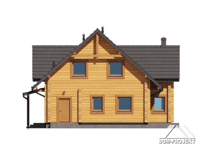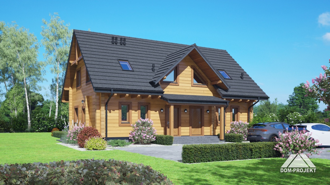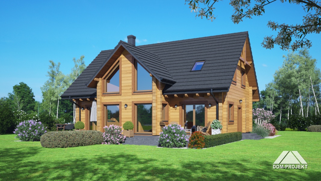 projekt nowoczesnego, ekologicznego, wygodnego domu z bali, z poddaszem użytkowym. Na parterze przestronny, dobrze doświetlony salon, otwarta kuchnia z wyspą i spiżarnią, wygodna łazienka i pomieszczenie gospodarcze. Ponadto wydzielone mini mieszkanie z własnym wejściem, aneksem kuchennym i łazienką. Na poddaszu bardzo dużo przestrzeni dla całej rodziny – trzy pokoje i wspólna łazienka.