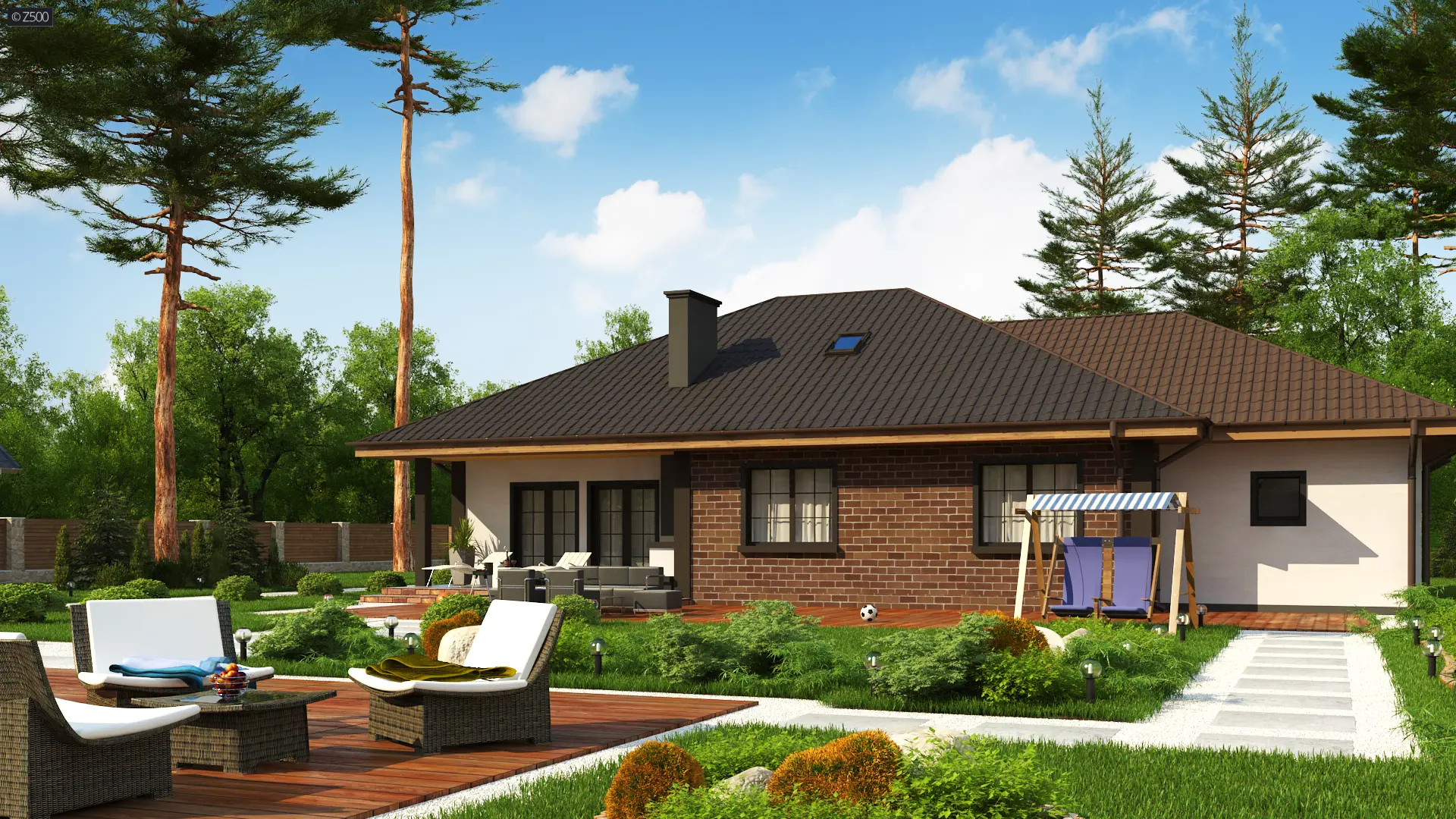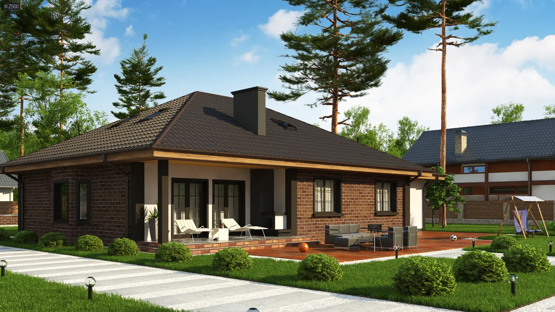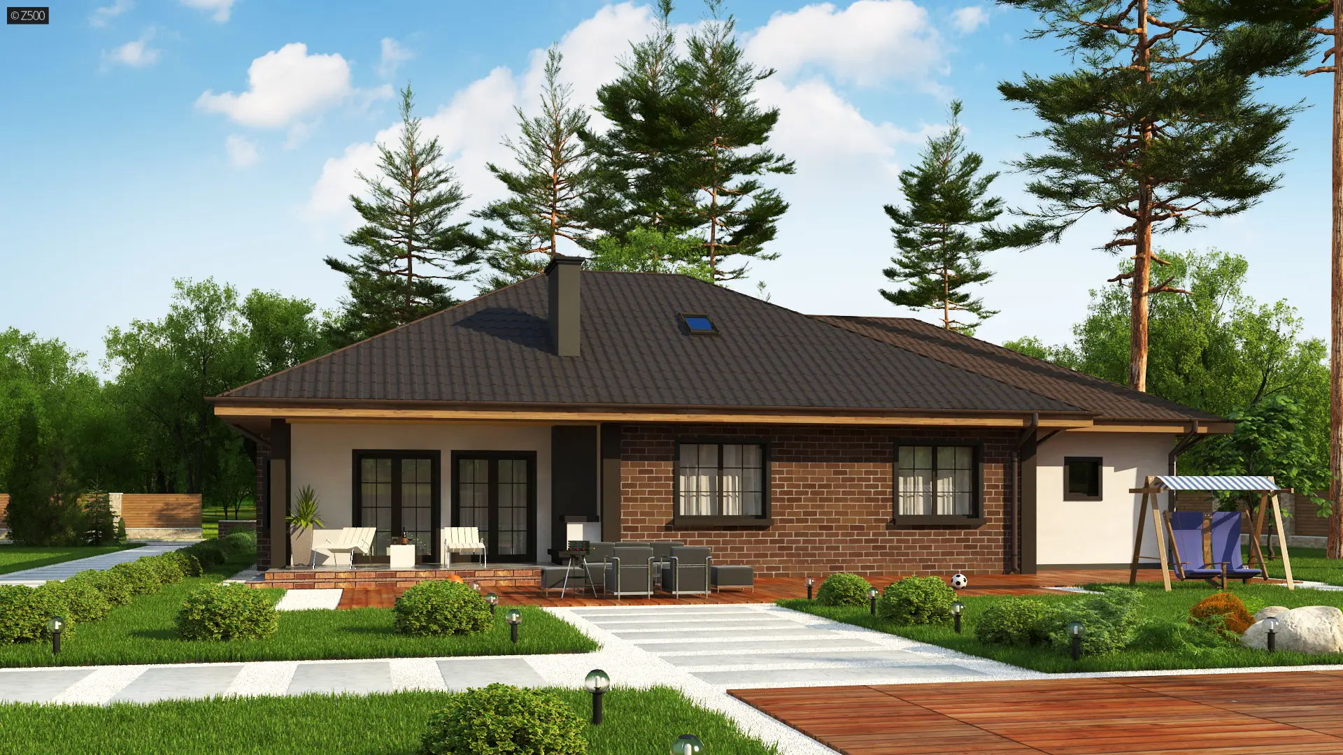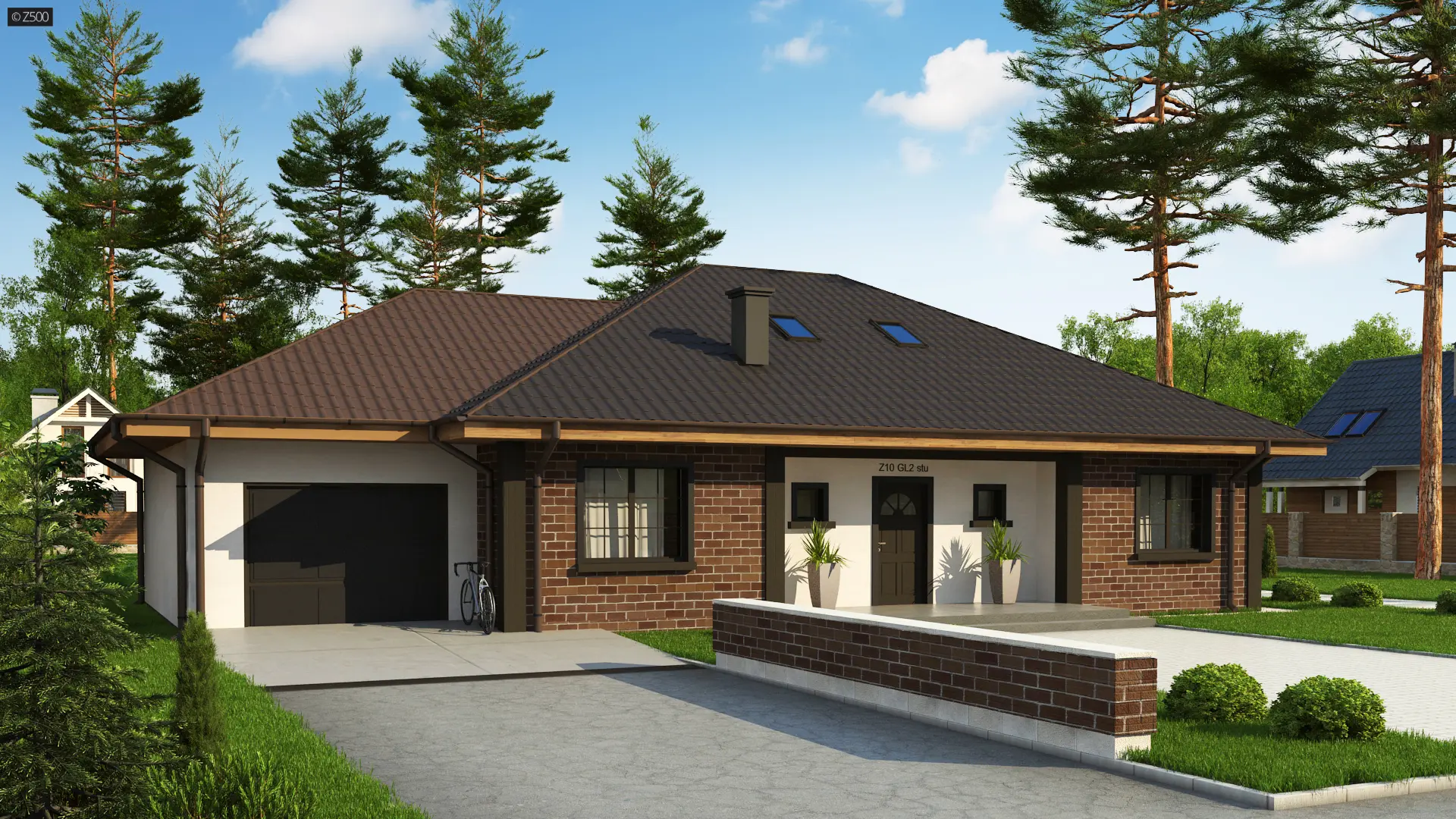 Wariant ze stropem Teriva, o kącie nachylenia dachu 28 stopni. Po lewej stronie garaż dwustanowiskowy z wydzielonym pomieszczeniem gospodarczym na tyle garażu. Poddasze użytkowe.
