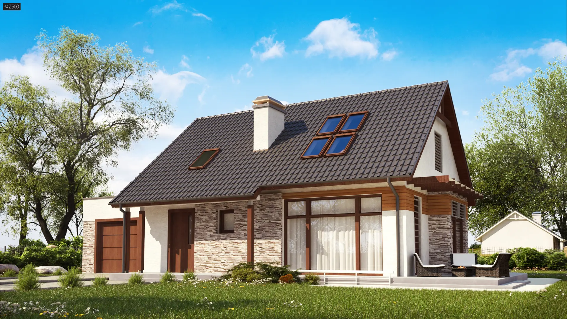 Tradycyjny dom z poddaszem, garażem z dachem pulpitowym, 4 pokojami i wykuszem