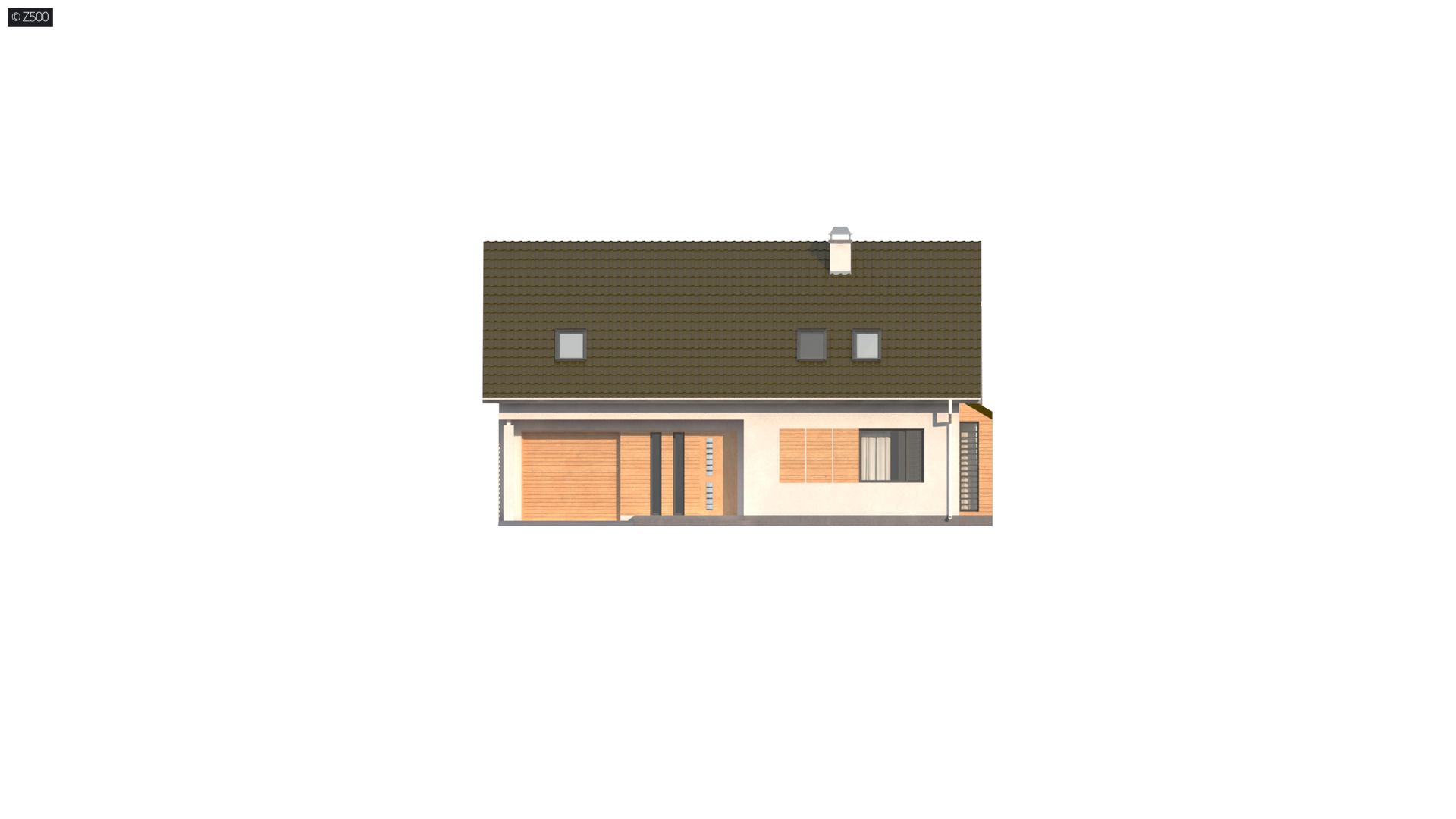 W lewej części zaprojektowano garaż jednostanowiskowy z dużym pomieszczeniem gospodarczym.