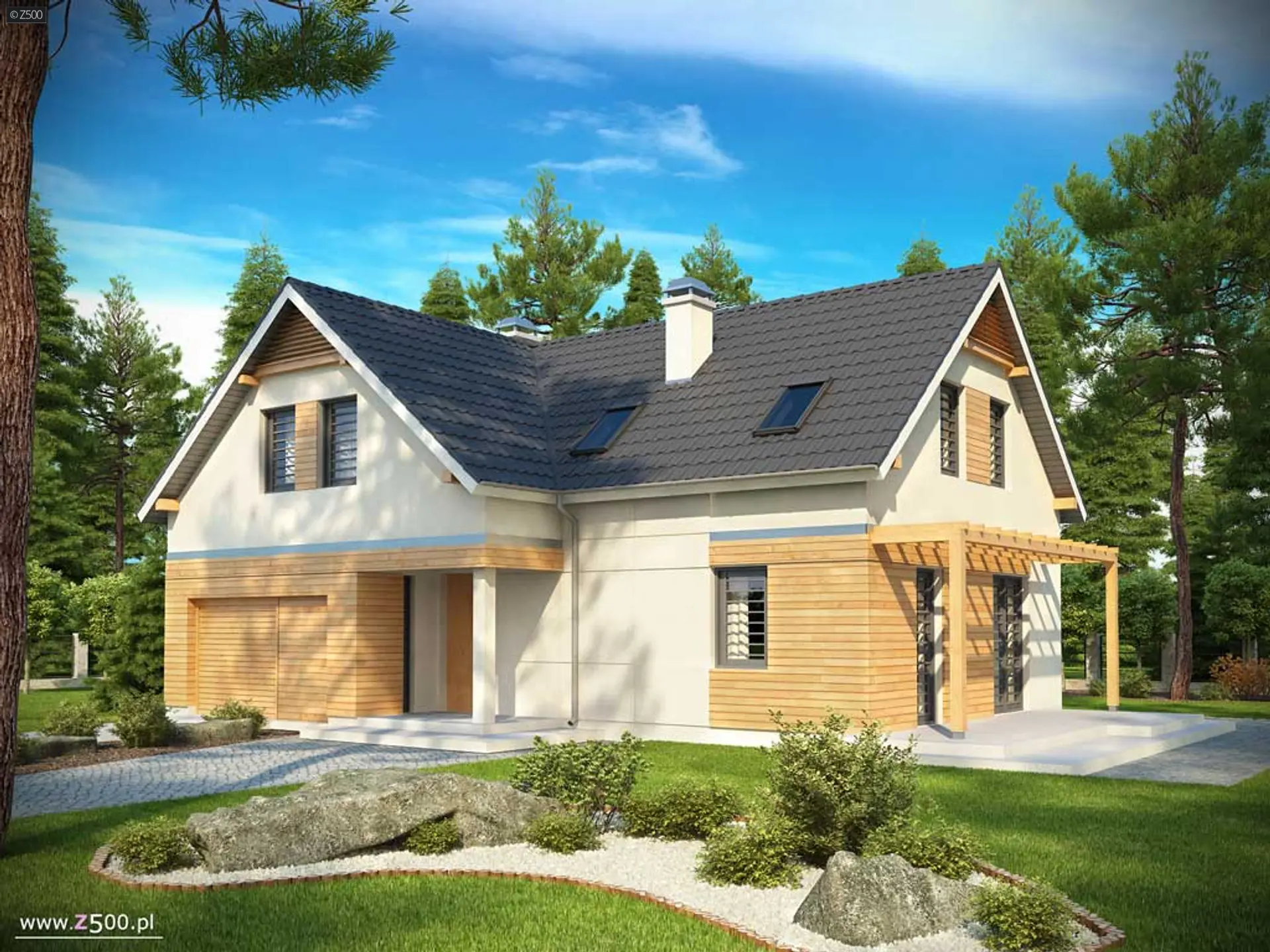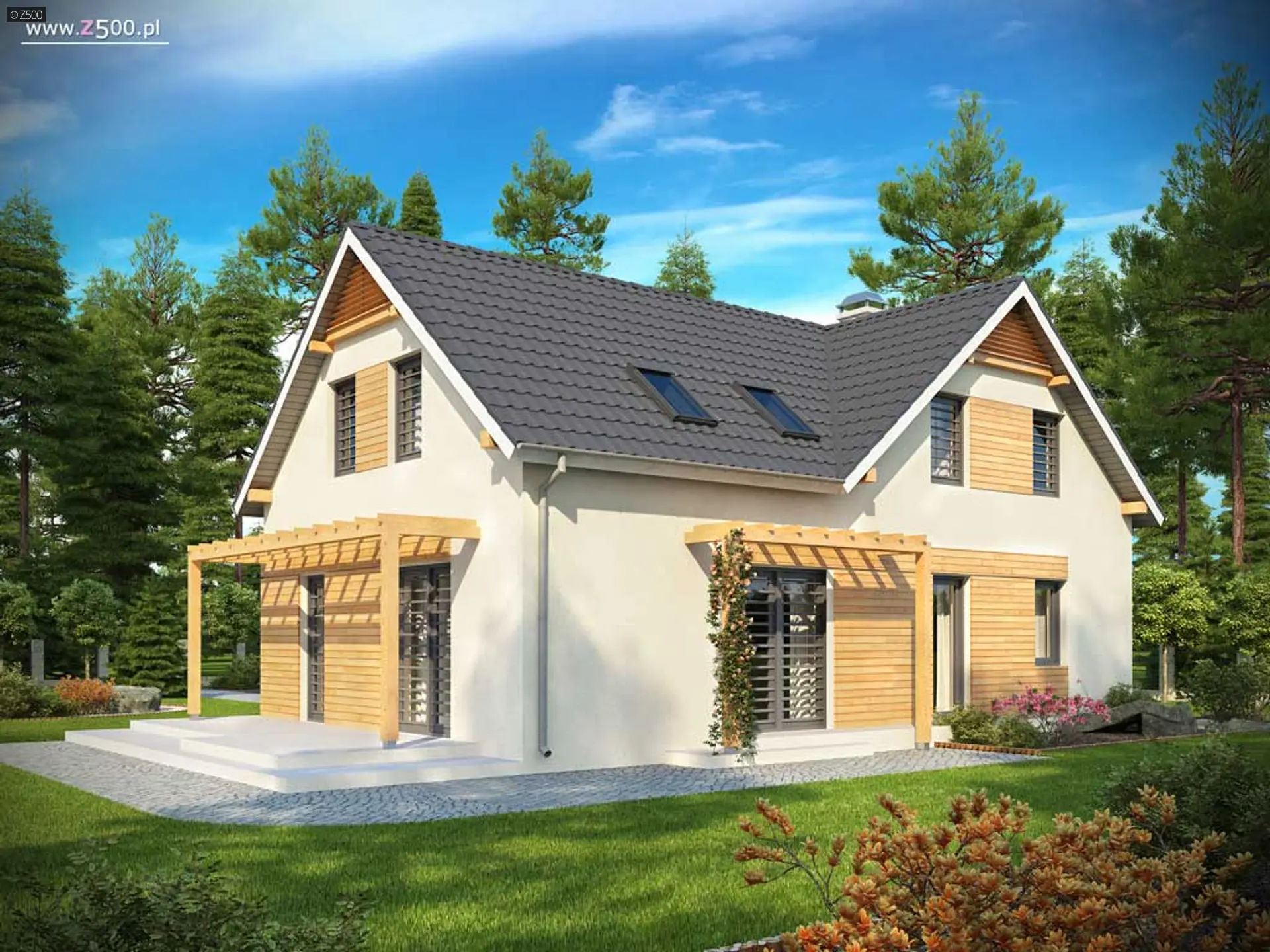 Projekt Z125D to dom z poddaszem użytkowym dla lubiących duże przestrzenie.Jasne palety barw oraz drewniane elementy elewacji dodają mu uroku i przyjemnego wyglądu. Dzięki fajnej okładzinie z drewna, szarej stolarce okiennej oraz dopasowanej pergoli, dom jest wyjątkowy i jedyny w swoim rodzaju.