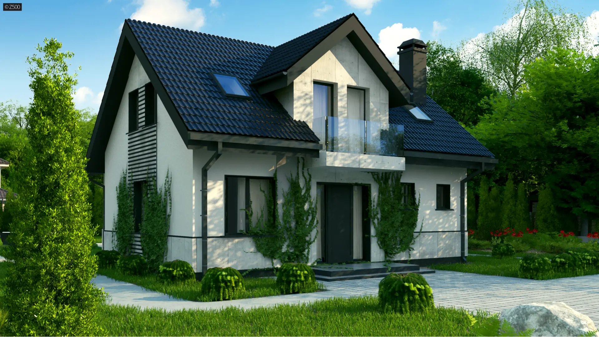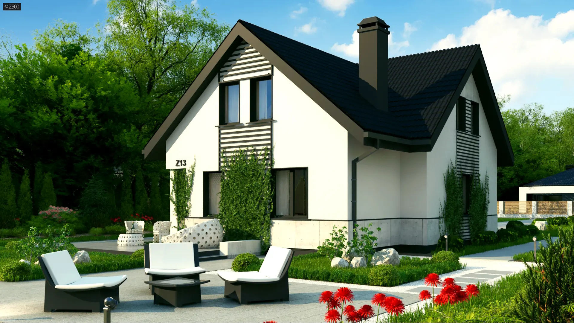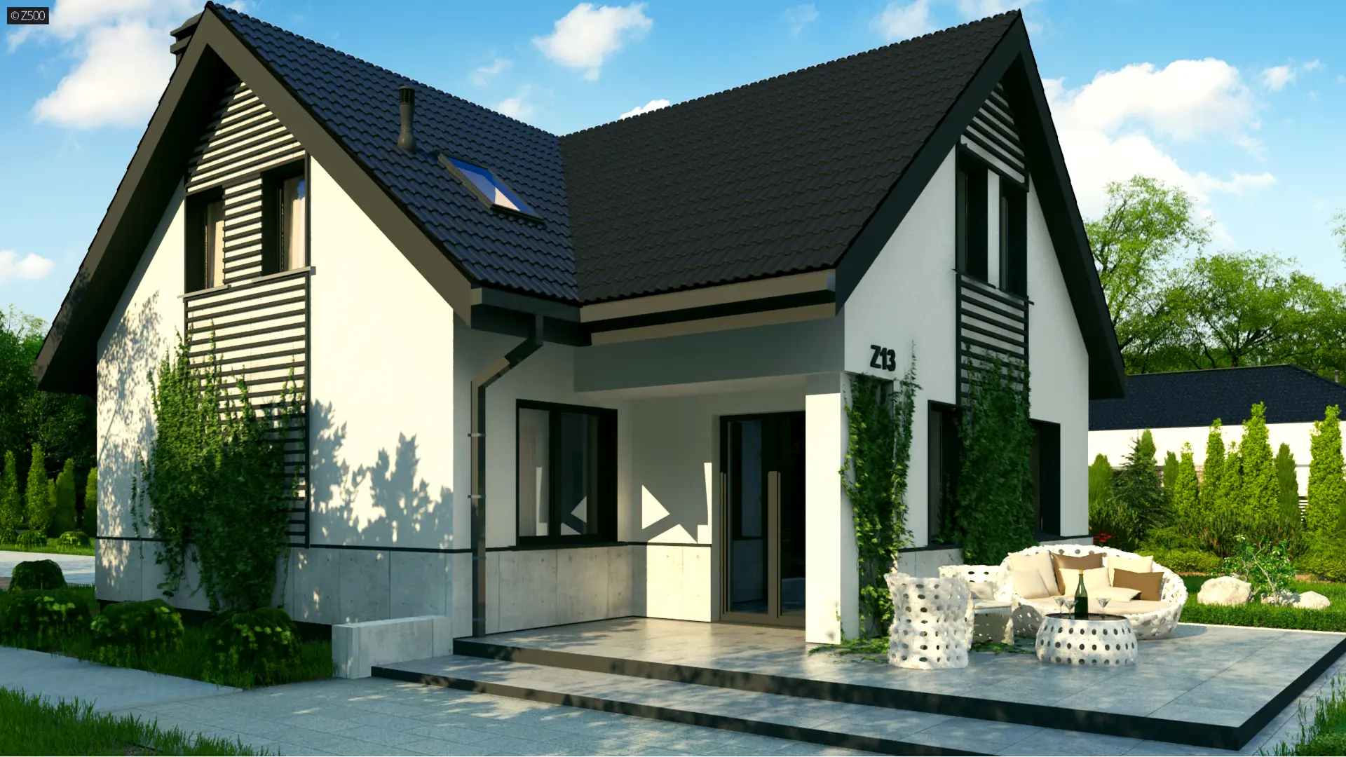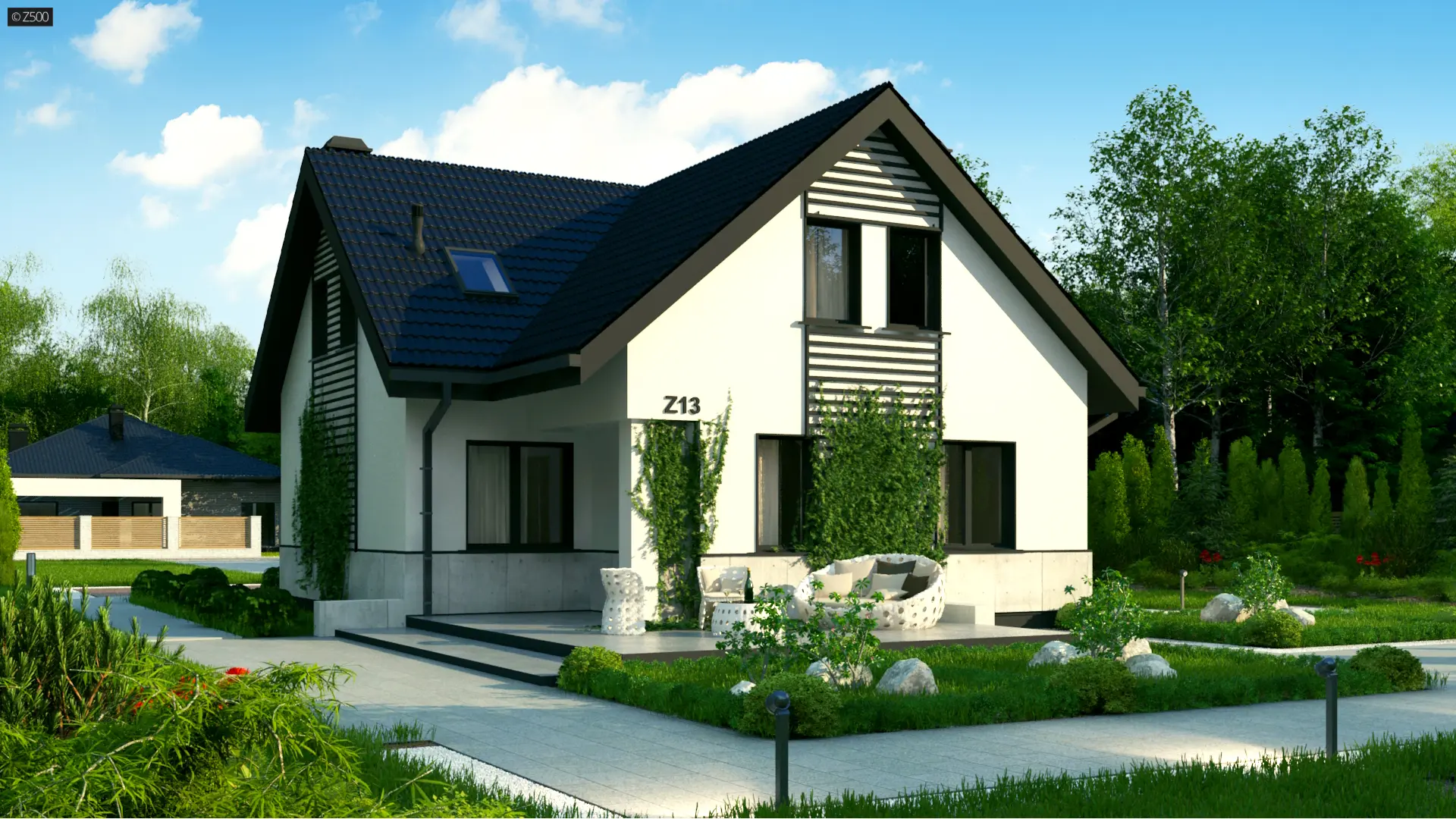 Z13 to wygodny i funkcjonalnym dom o przyjemnym wyglądzie zewnętrznym. Zgrabna bryła dobrze komponuje się zarówno w zwartej zabudowie jak i otwartej przestrzeni. Strefę wejściową podkreśla balkon chroniący jednocześnie przed wpływami atmosferycznymi.