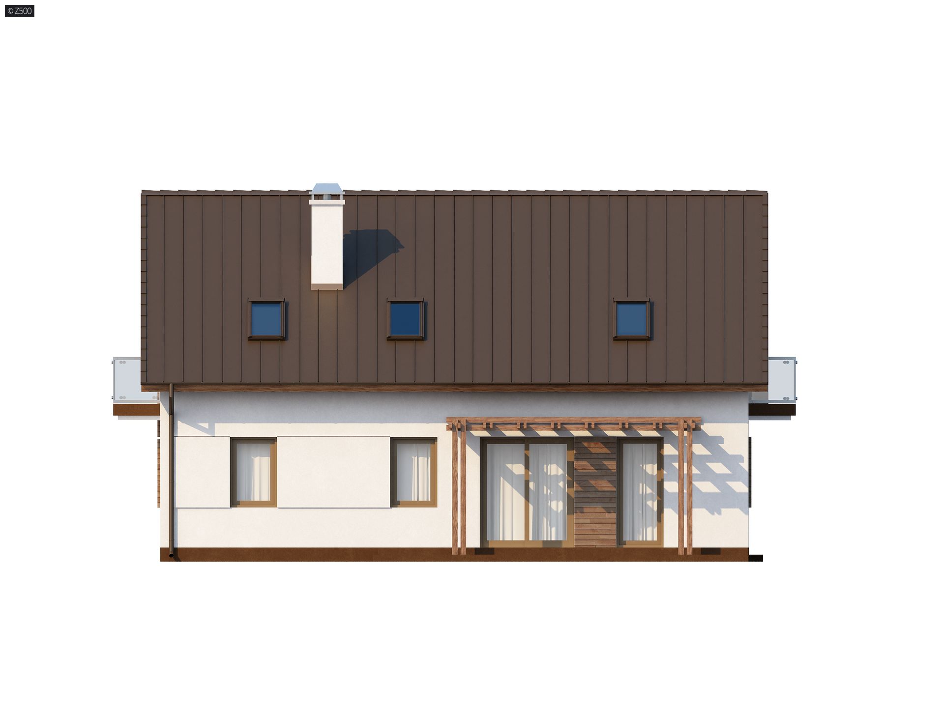 Zwarta bryła oraz dwuspadowy dach warunkują niewielkie koszty budowy. Zastosowane z umiarem na elewacjach okładziny z naturalnego drewna nadają mu subtelnego charakteru i wdzięku. Wnętrze domu jest jasne i przestronne. Kuchnia w kompozycji otwartej z salonem tworzy komfortową strefę dzienną z widokiem na ogród oraz wyjściem na taras.