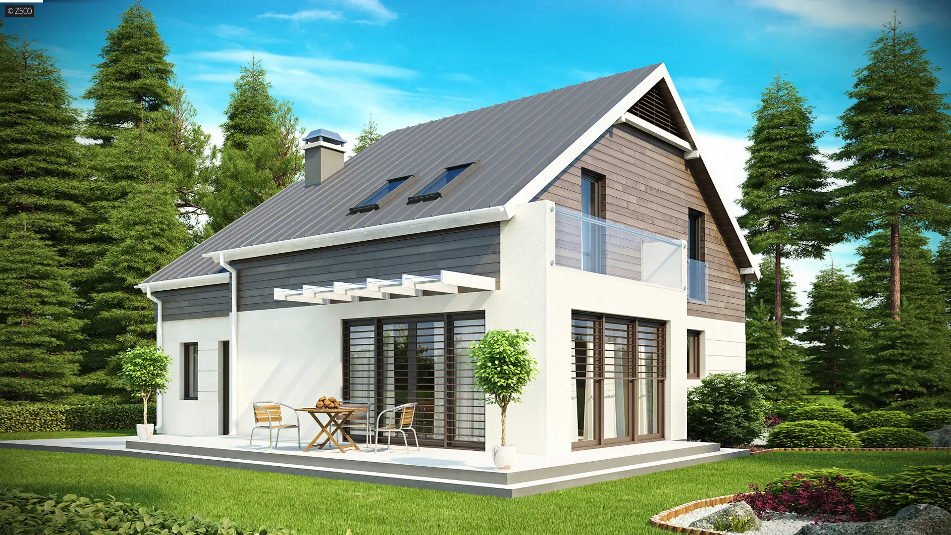 Z147 to funkcjonalny dom zaprojektowany dla czteroosobowej rodziny. Prostą bryłę z wykuszem przekryto dachem dwuspadowym, a elewacje wykończono nowoczesnymi dodatkami.