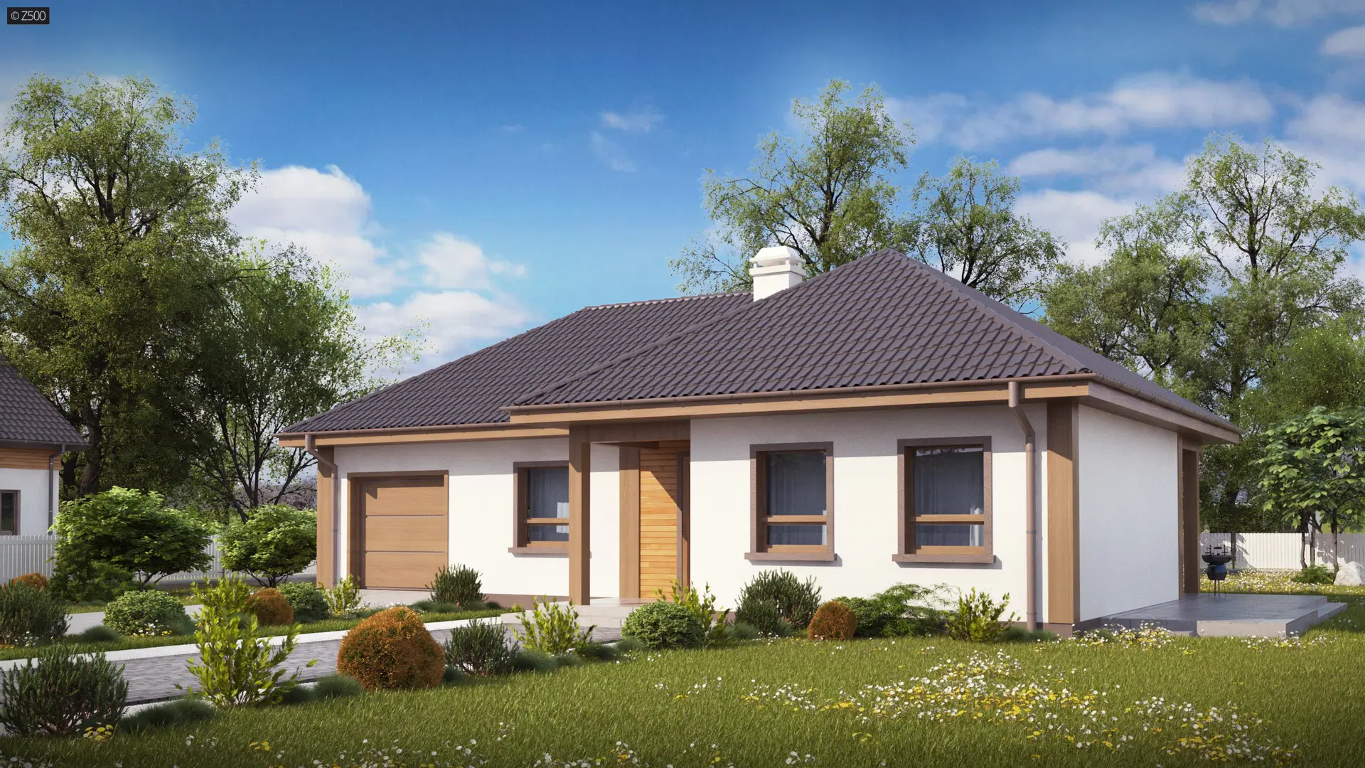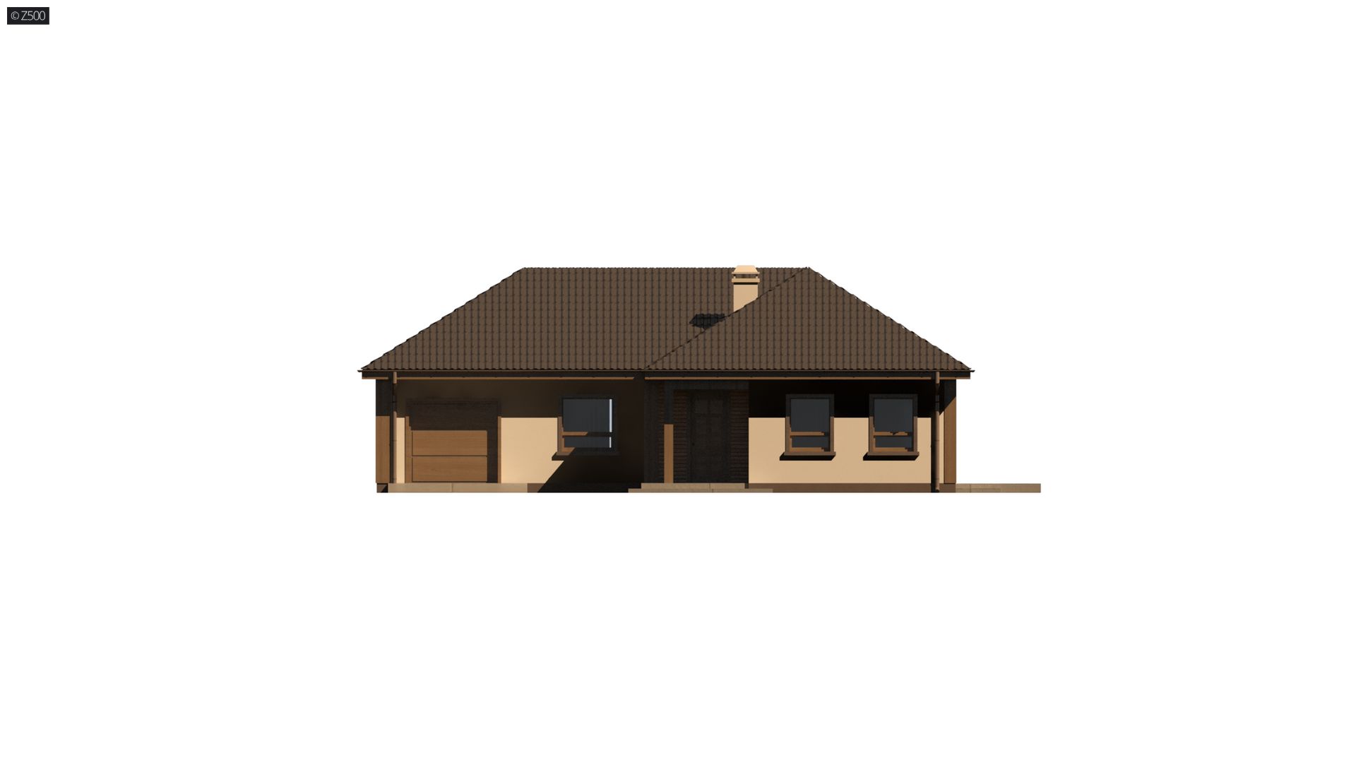 Mały parterowy dom z trzema pokojami, dachem wielospadowym i garażem