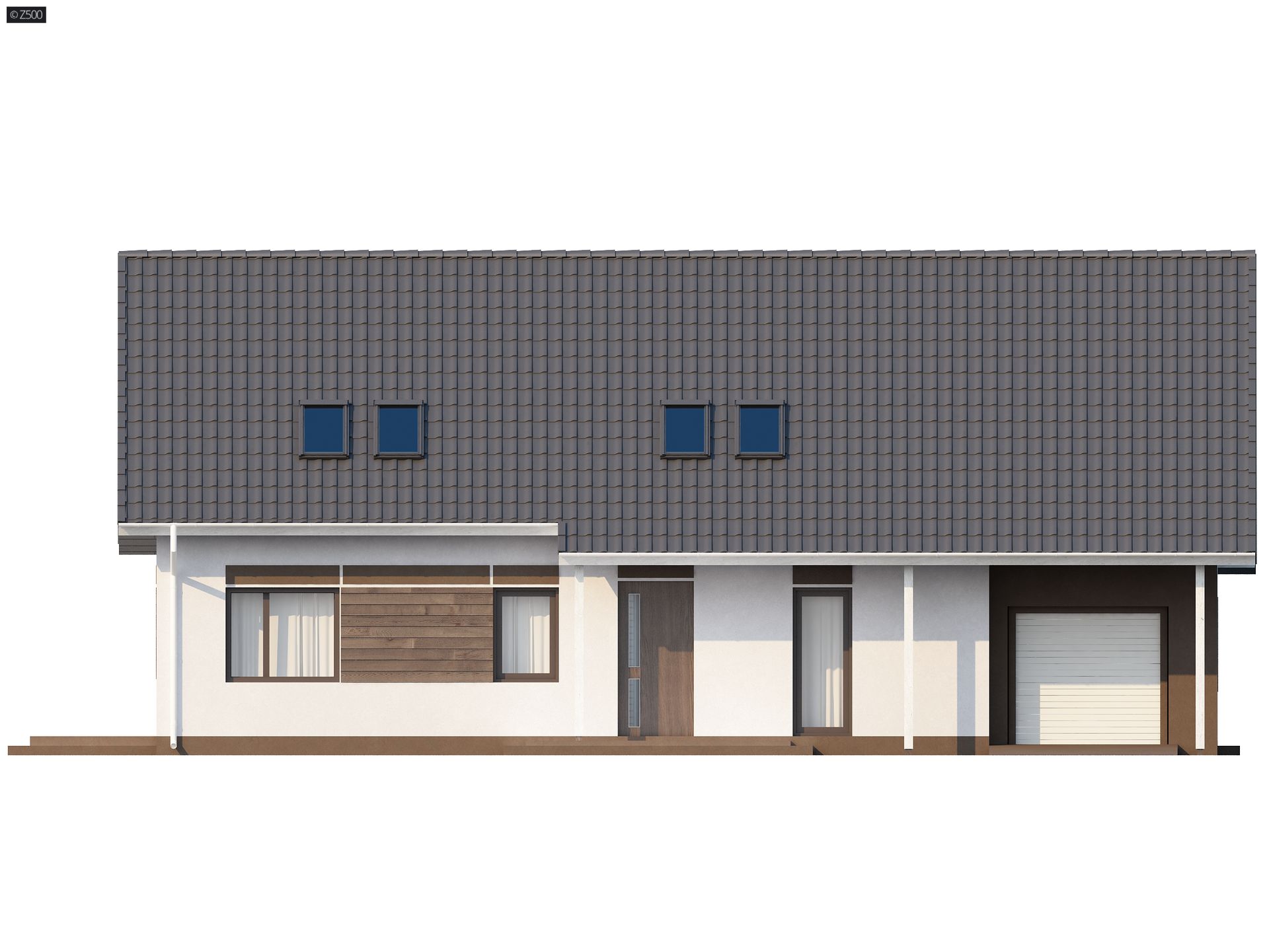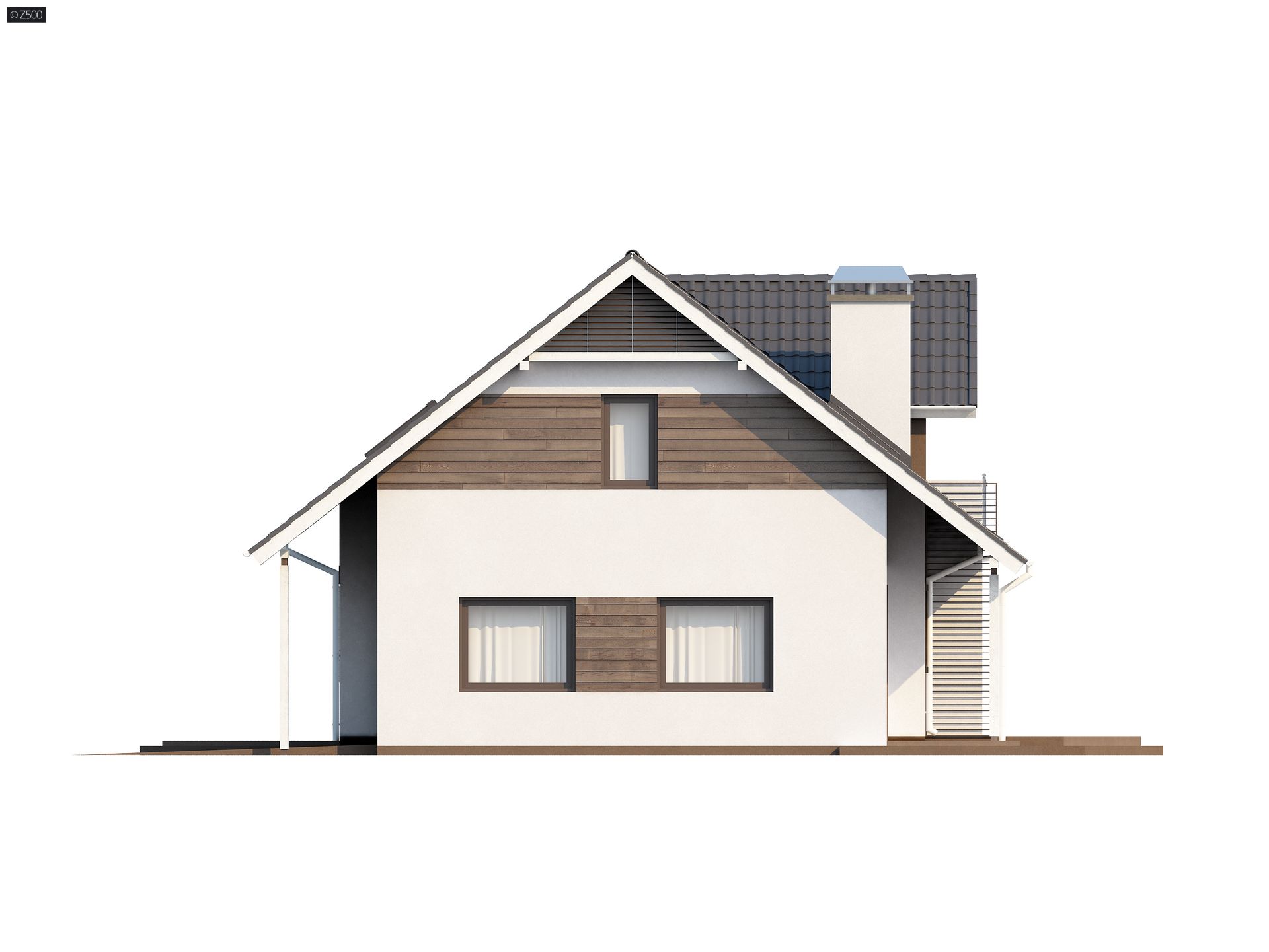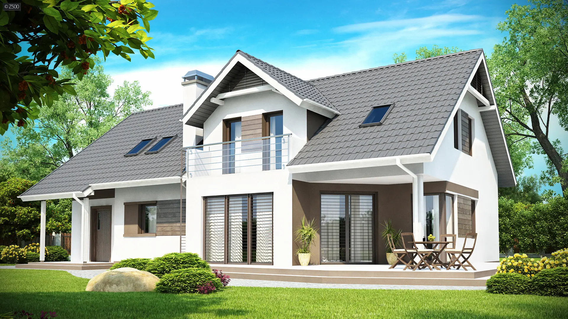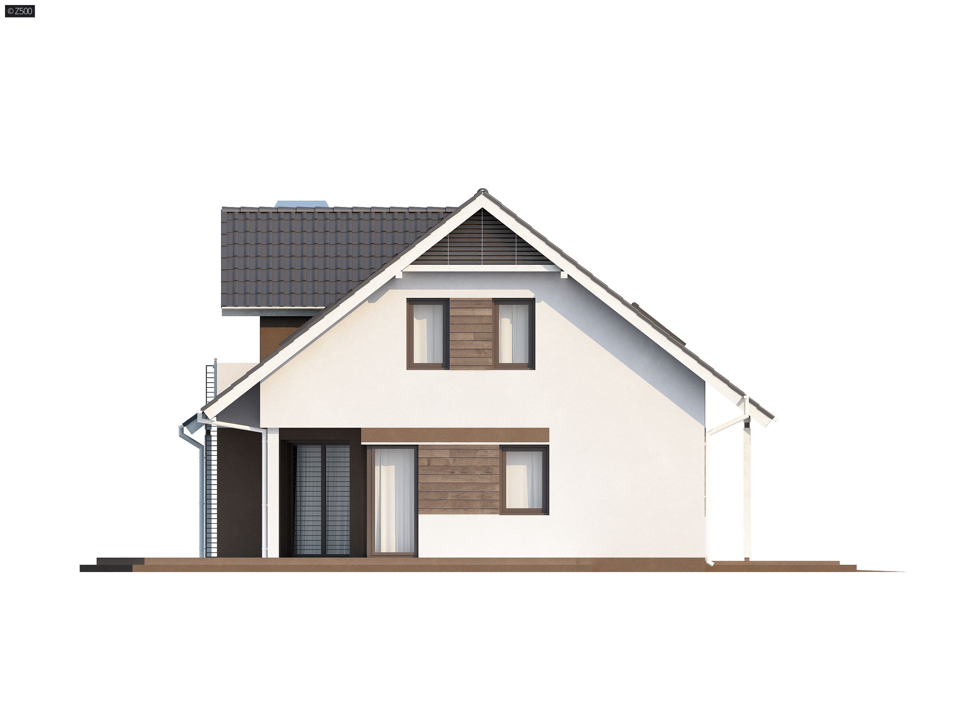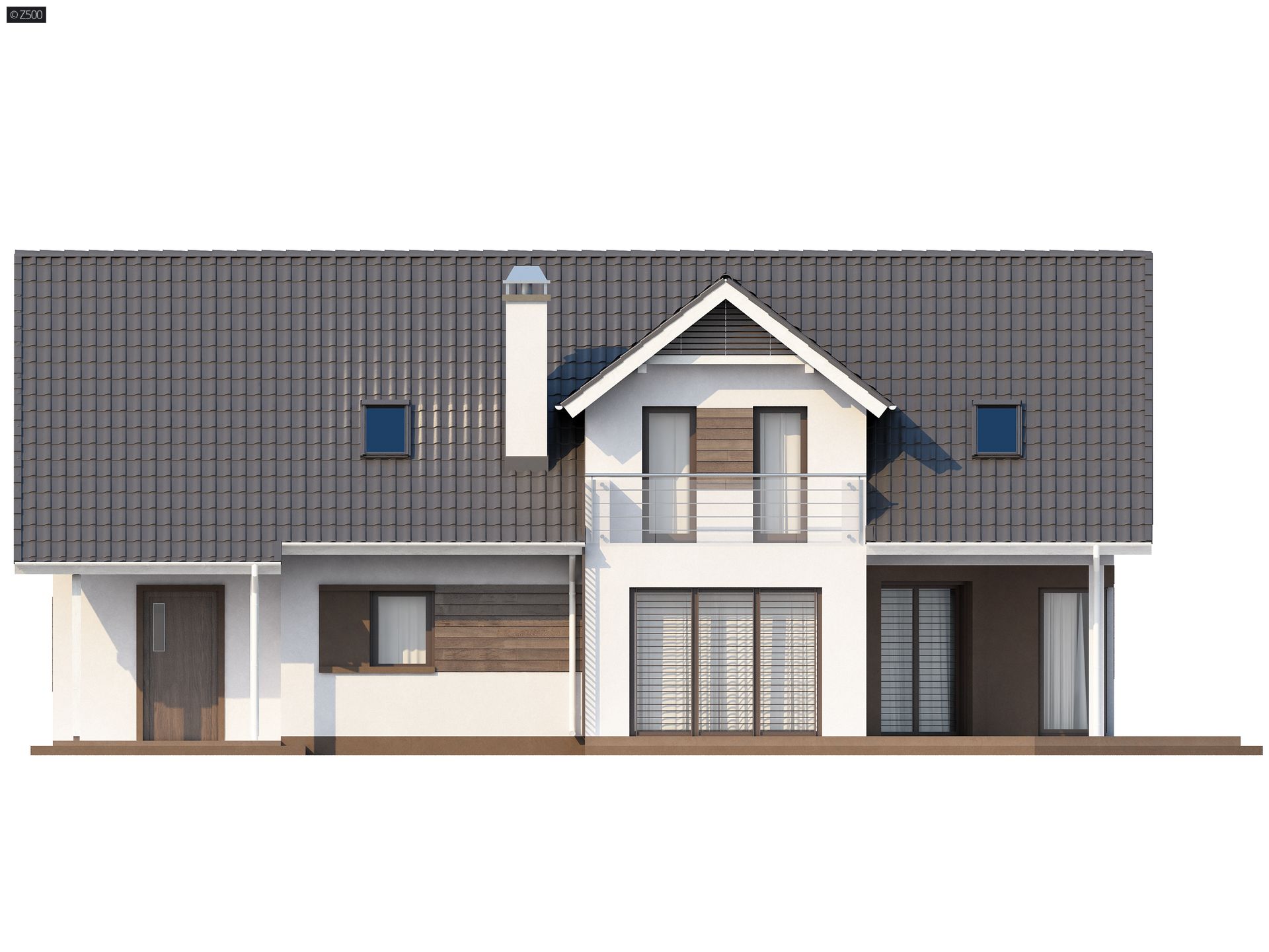 Projekt Z160 to prosty w budowie dom z poddaszem, z 4 pokojami mieszkalnymi i garażem. Dom wyróżnia wykusz przedłużony w lukarnę z balkonikiem od strony ogrodu. Zgrabna konstrukcja bryły pozwala na oszczędności już na etapie budowy.