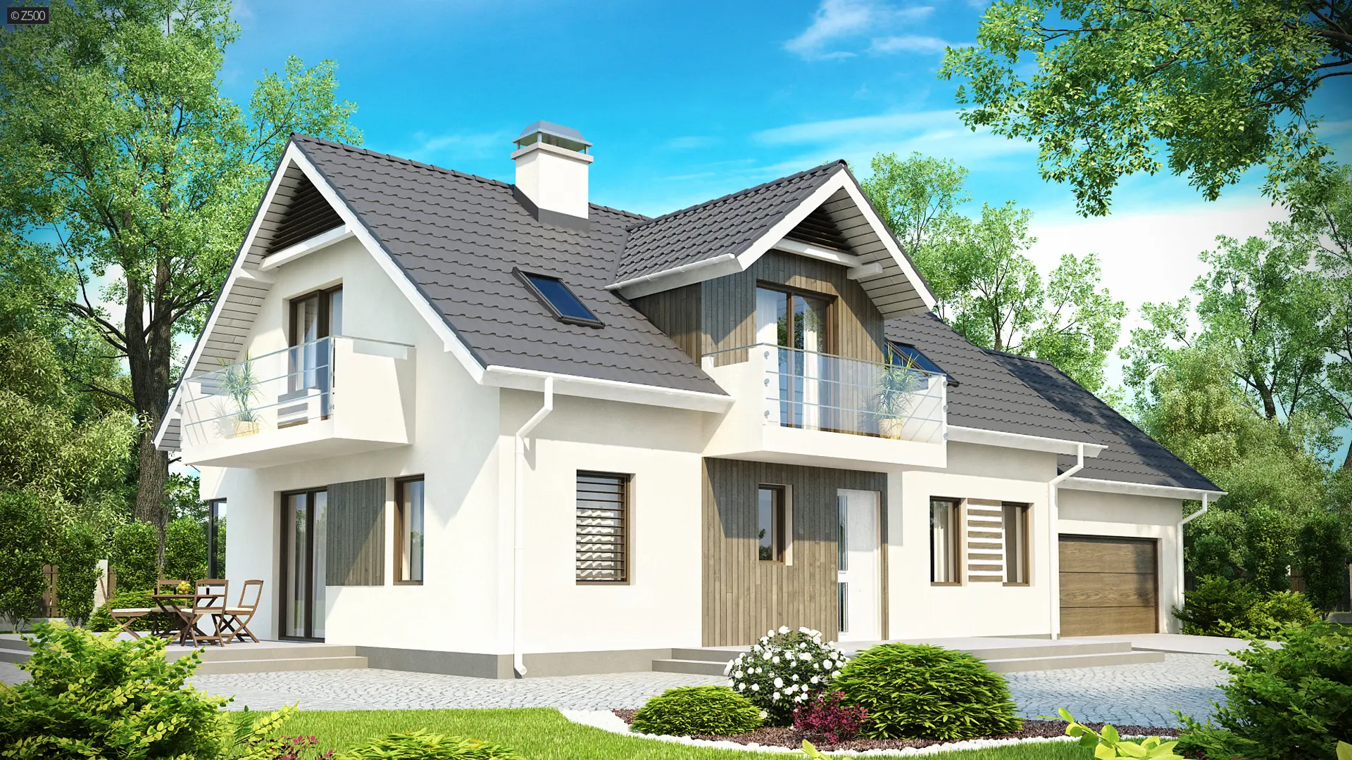 Optymalny dom z poddaszem, gabinetem do pracy, lukarnami i garażem na 2 auta.