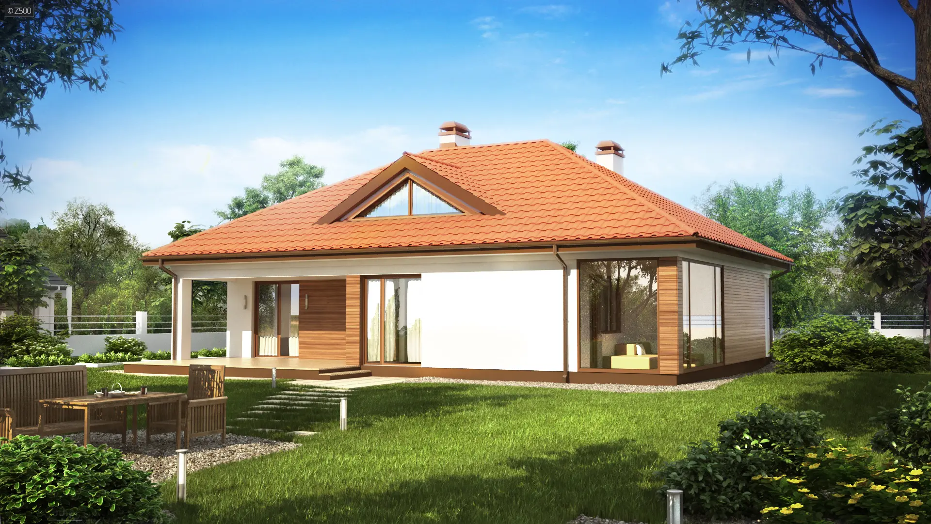 Z185 to prosta i komfortowa propozycja domu parterowego. Bryła domu przekryta jest kopertowym dachem i ubrana w oryginalne dodatki, świetnie podkreśla jego wyjątkowy charakter. Dom zbudowany jest na planie prostokąta dzięki czemu jest tani w budowie oraz ekonomiczny w użytkowaniu.