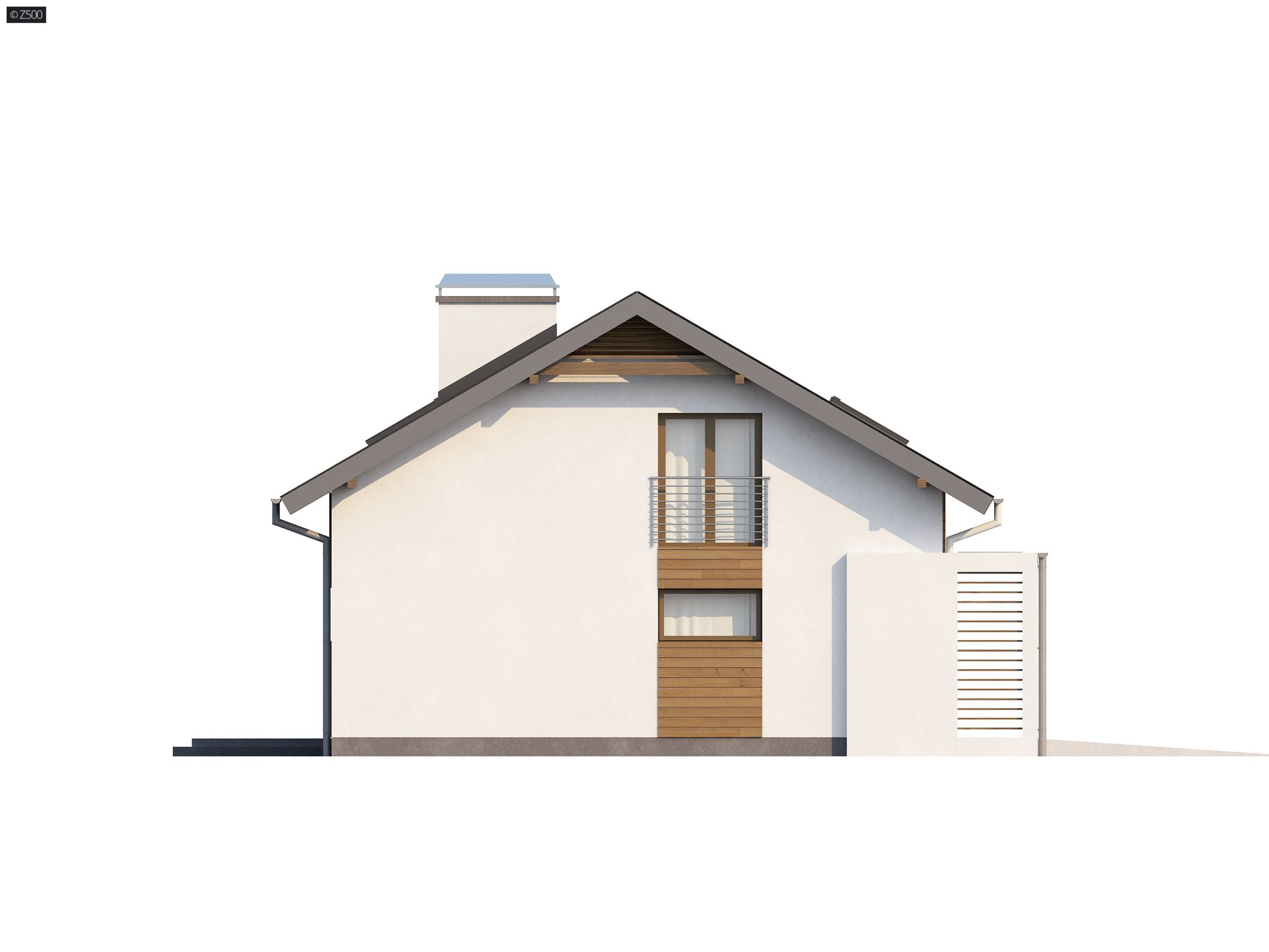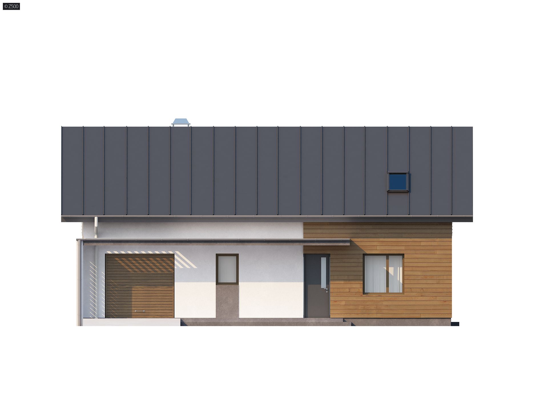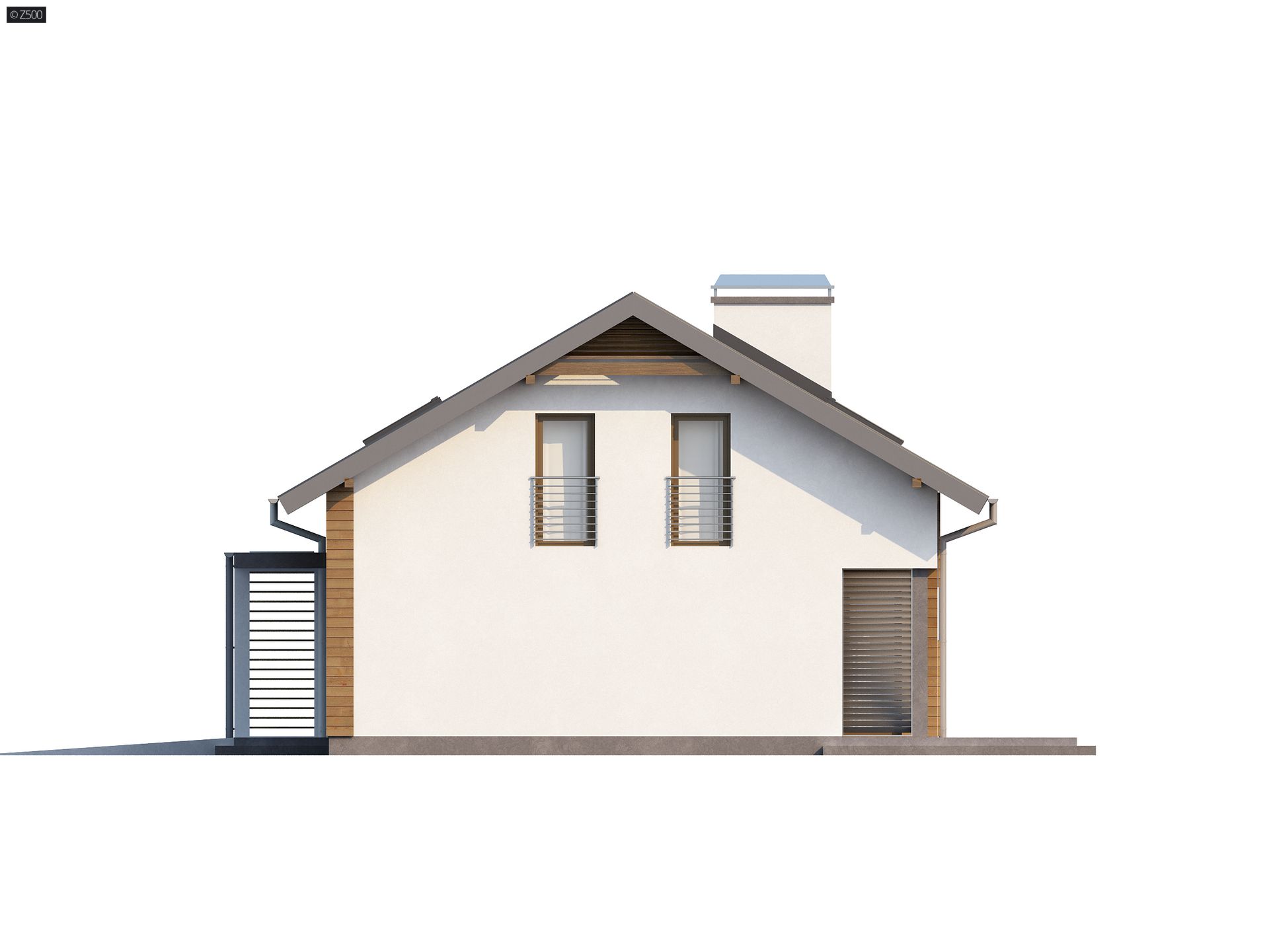 Z188 to niewielki ale funkcjonalny dom z garażem i użytkowym poddaszem. Prostą bryłę urozmaicają ciekawe podziały elewacji uzyskane przez zastosowanie szarego tynku oraz drewna. Nad wejściem zaproponowano nowoczesną formę zadaszenia z pergolą.