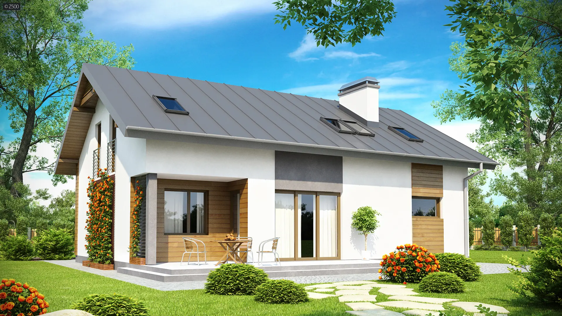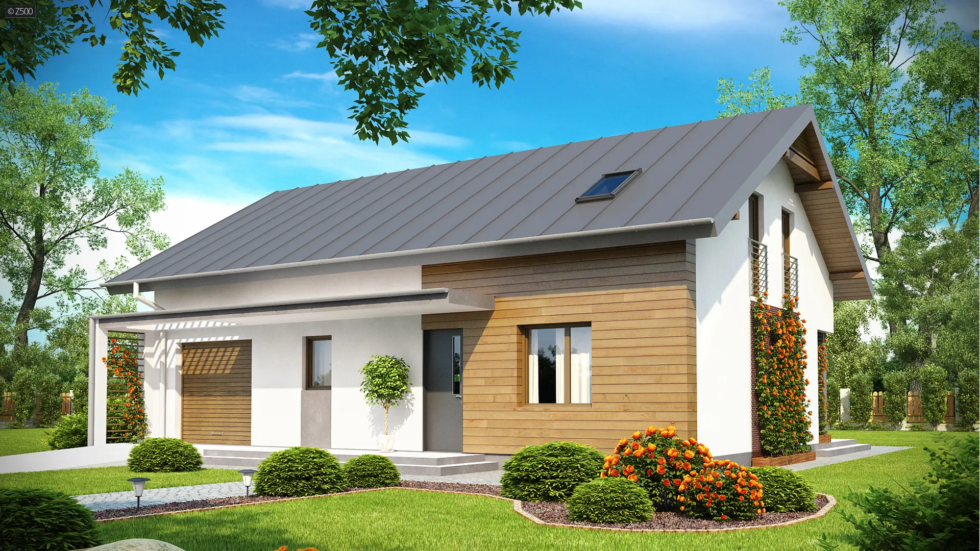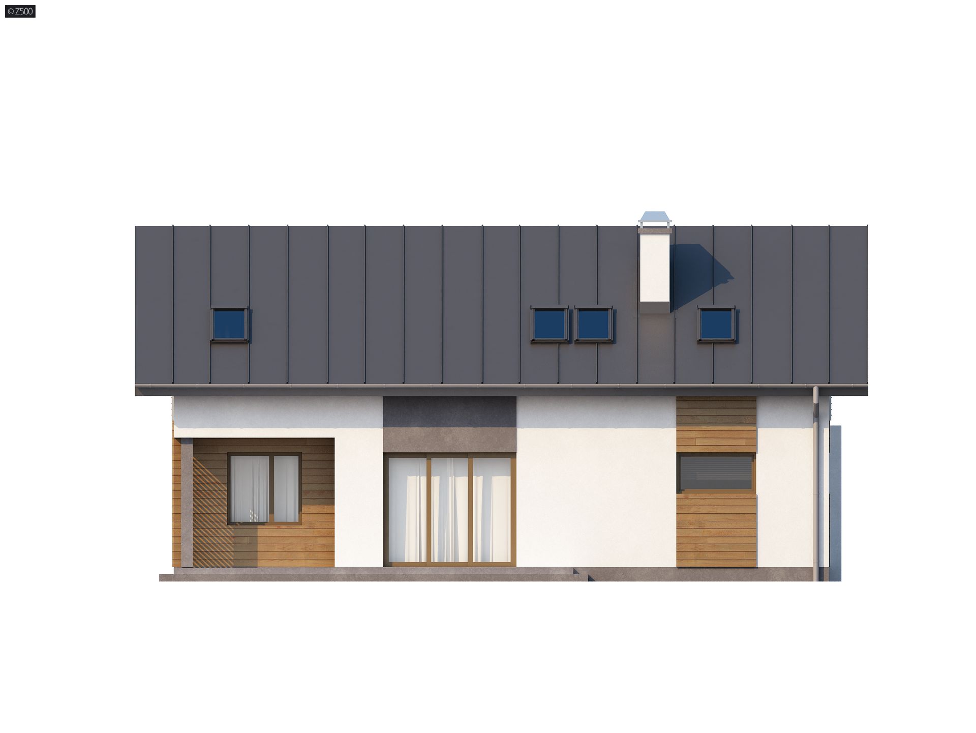 Z188 to niewielki ale funkcjonalny dom z garażem i użytkowym poddaszem. Prostą bryłę urozmaicają ciekawe podziały elewacji uzyskane przez zastosowanie szarego tynku oraz drewna. Nad wejściem zaproponowano nowoczesną formę zadaszenia z pergolą.