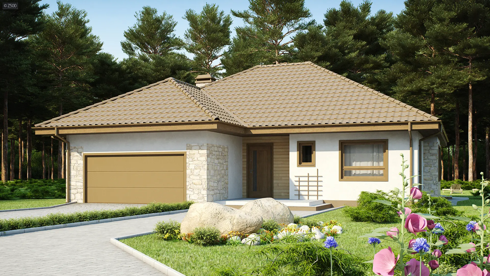 Projekt Z19 to dom parterowy z frontowym garażem na dwa samochody. Prosta bryła wpłynie na szybką oraz ekonomiczną budowę. Konstrukcja stropu pozwala na zagospodarowanie poddasza w miarę rosnących potrzeb. Charakter oraz styl budynku podkreślony jest przez poprzez drewniane i kamienne okładziny na elewacjach.