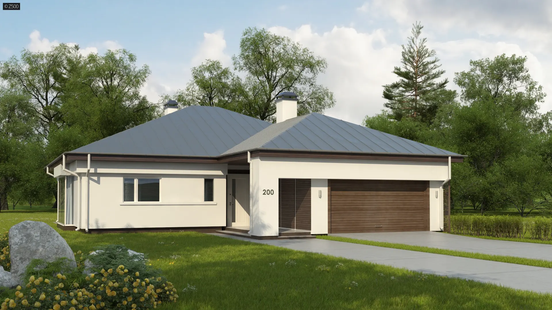 Z200 to komfortowy dom parterowy z garażem dwustanowiskowym dostępnym od frontu budynku. Elewacje i bryła wyróżniają się nowoczesną aczkolwiek spokojną i wyważoną architekturą z oryginalnymi dodatkami.