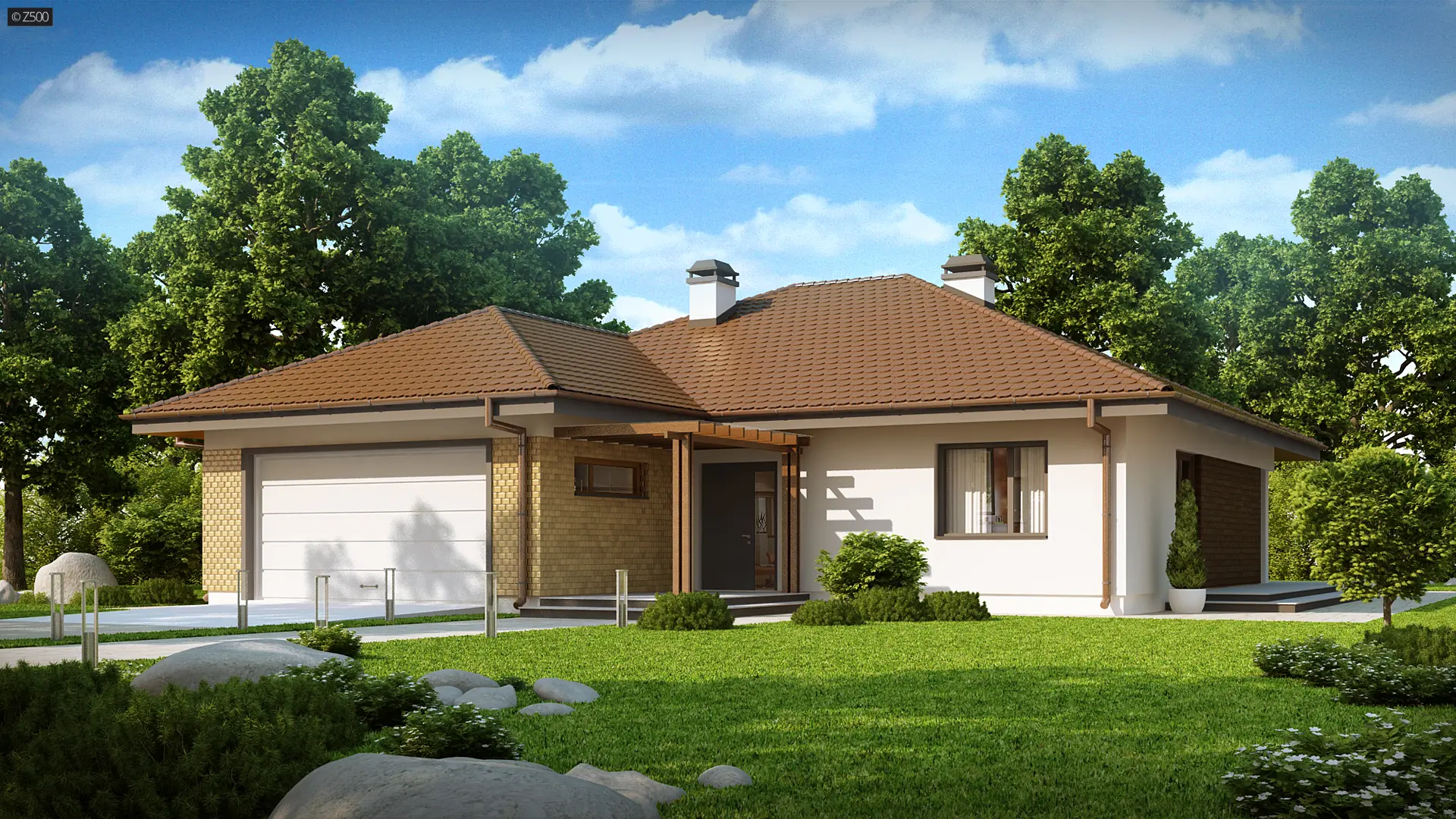 Parterowy dom z dużym garażem od frontu na dwa samochody. Obszerny taras