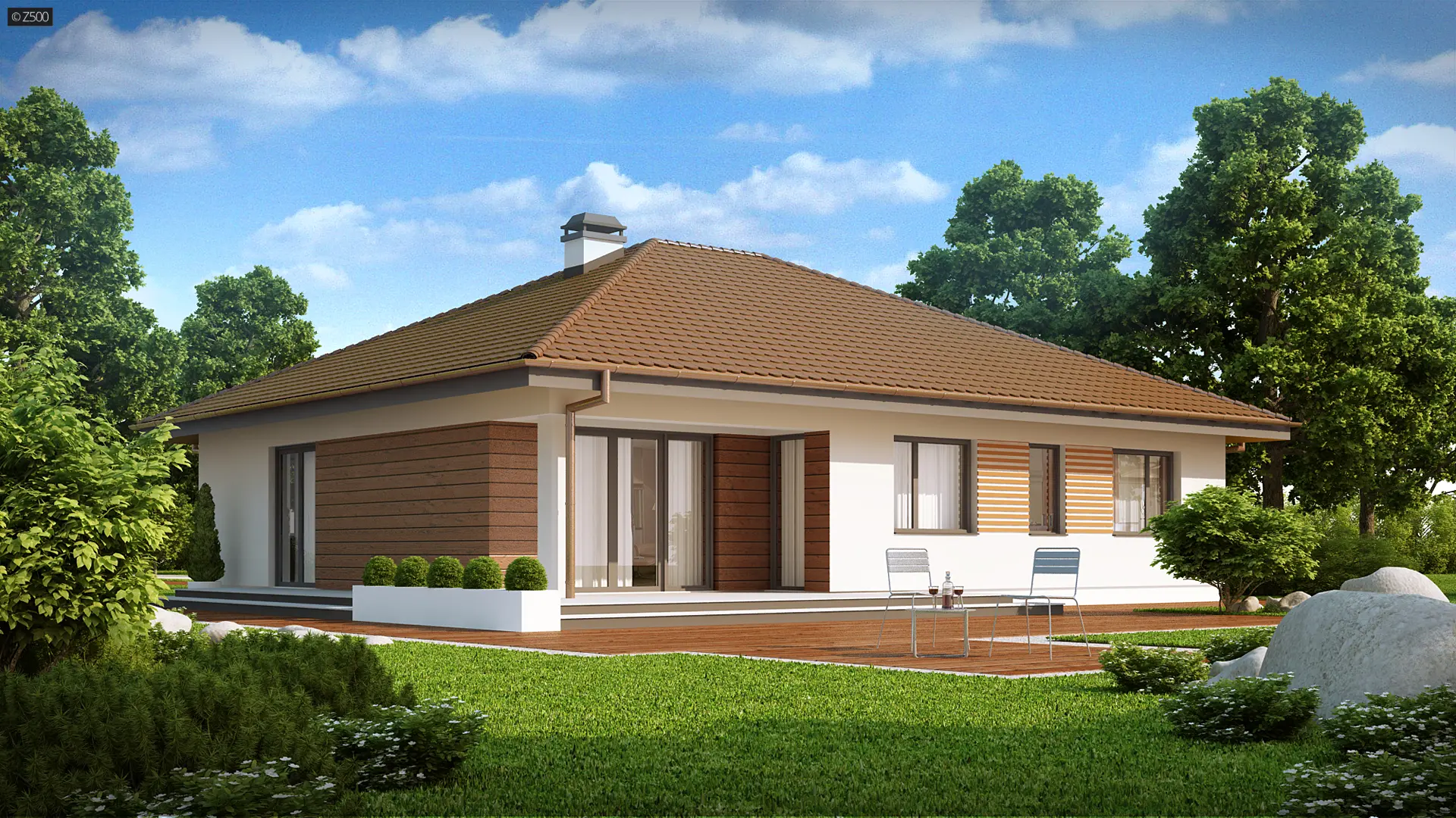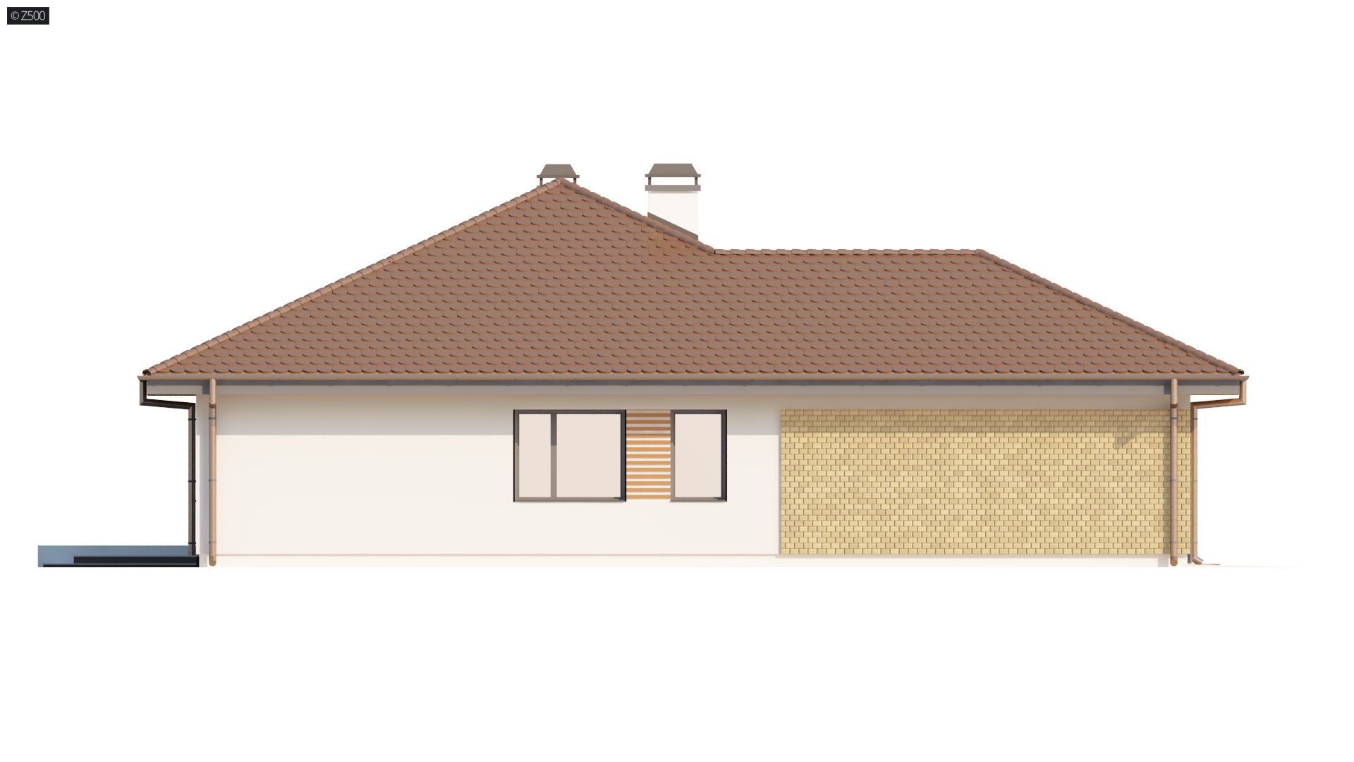 Projekt Z203 to funkcjonalny dom z trzema sypialniami i nieużytkowym poddaszem. Prostą, zgrabna bryłę urozmaica wysunięty od frontu garaż. Ostateczny charakter elewacjom nadaje wykończenie z drewna i okładziny klinkierowej.