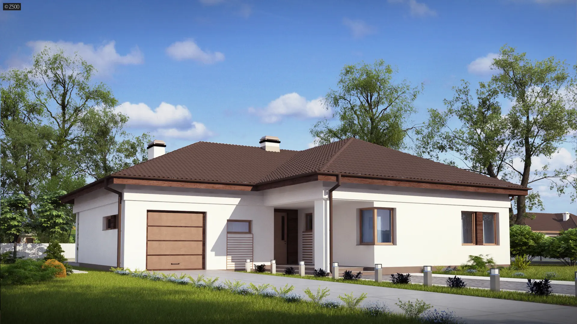 Z204 L v3 to projekt domu parterowego z garażem. Elewacja budynku została wykonana z białego tynku strukturalnego.