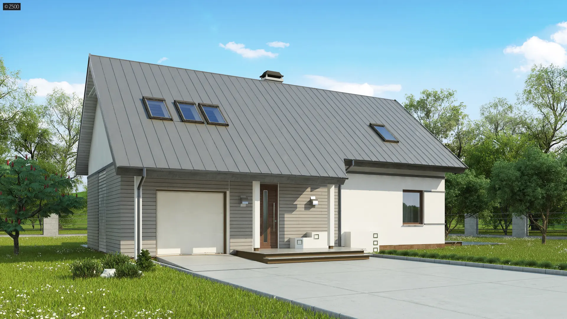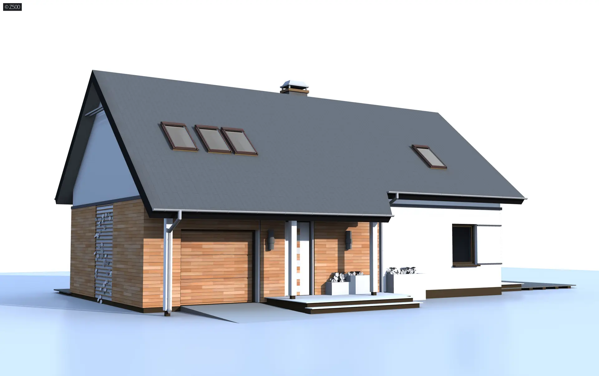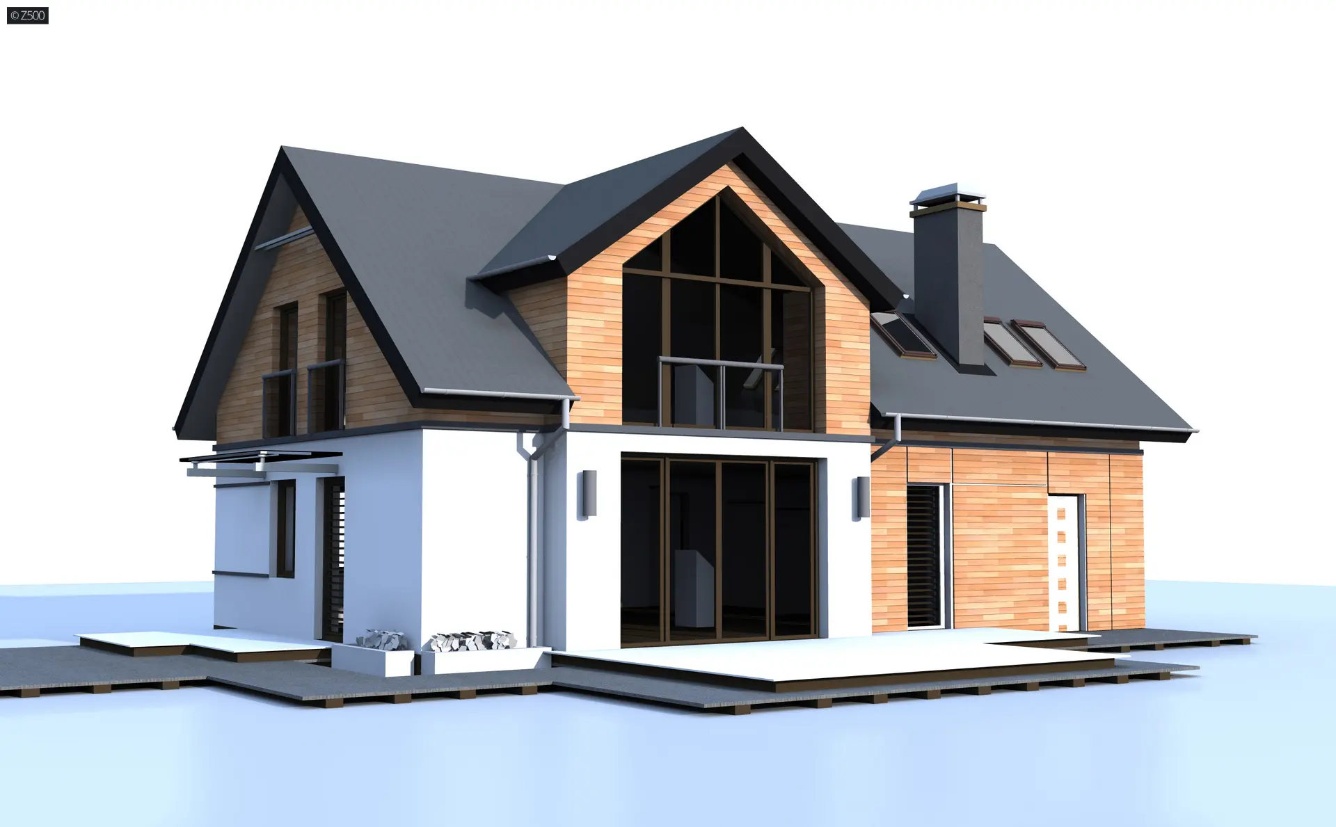Z226 to propozycja domu z poddaszem użytkowym i garażem jednostanowiskowym. Nowoczesny wygląd zawdzięcza dużym przeszkleniom, oryginalnej lukarnie oraz starannie dobranym dodatkom.