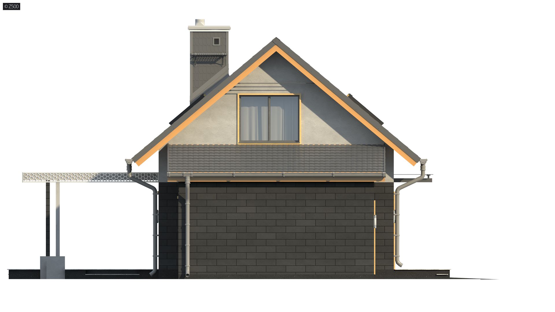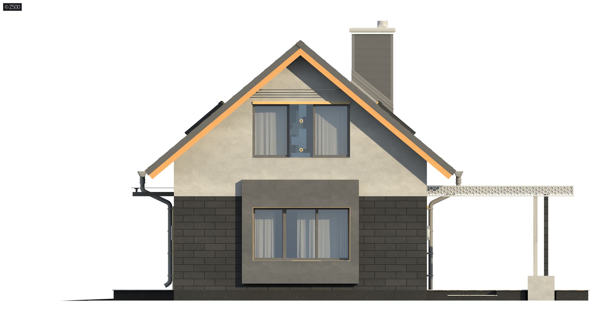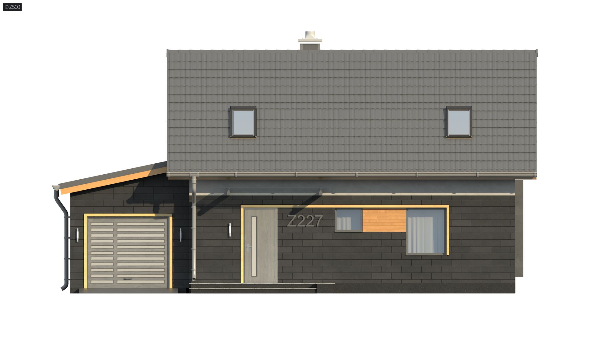 Projekt Z227 to dom z poddaszem z dwuspadowym dachem i jednostanowiskowym garażem, którego zaletą jest bezpośrednie przejście do domu. Efektowne wykończenie elewacji, poprzez wkomponowanie drewnianych elementów oraz zastosowanie okładziny z płytek, podkreśla jego wyjątkowy charakter.