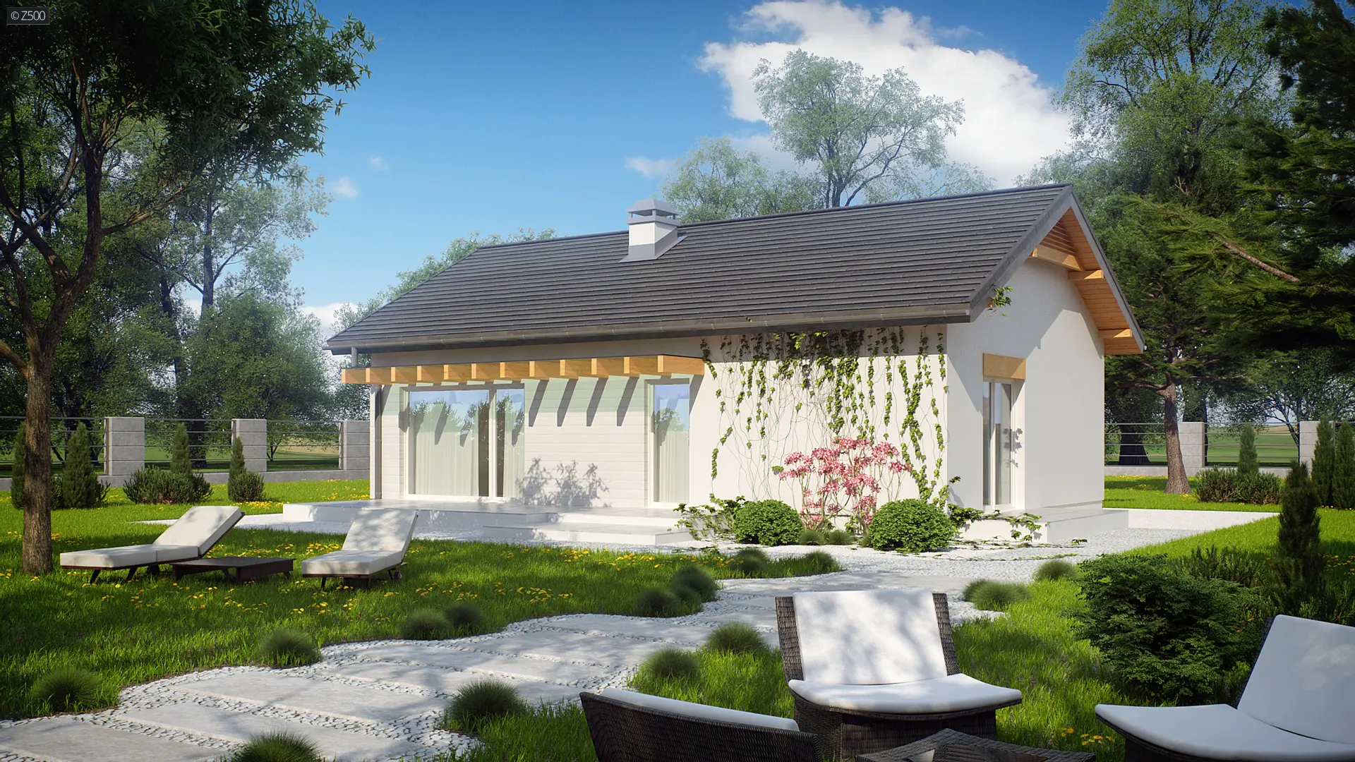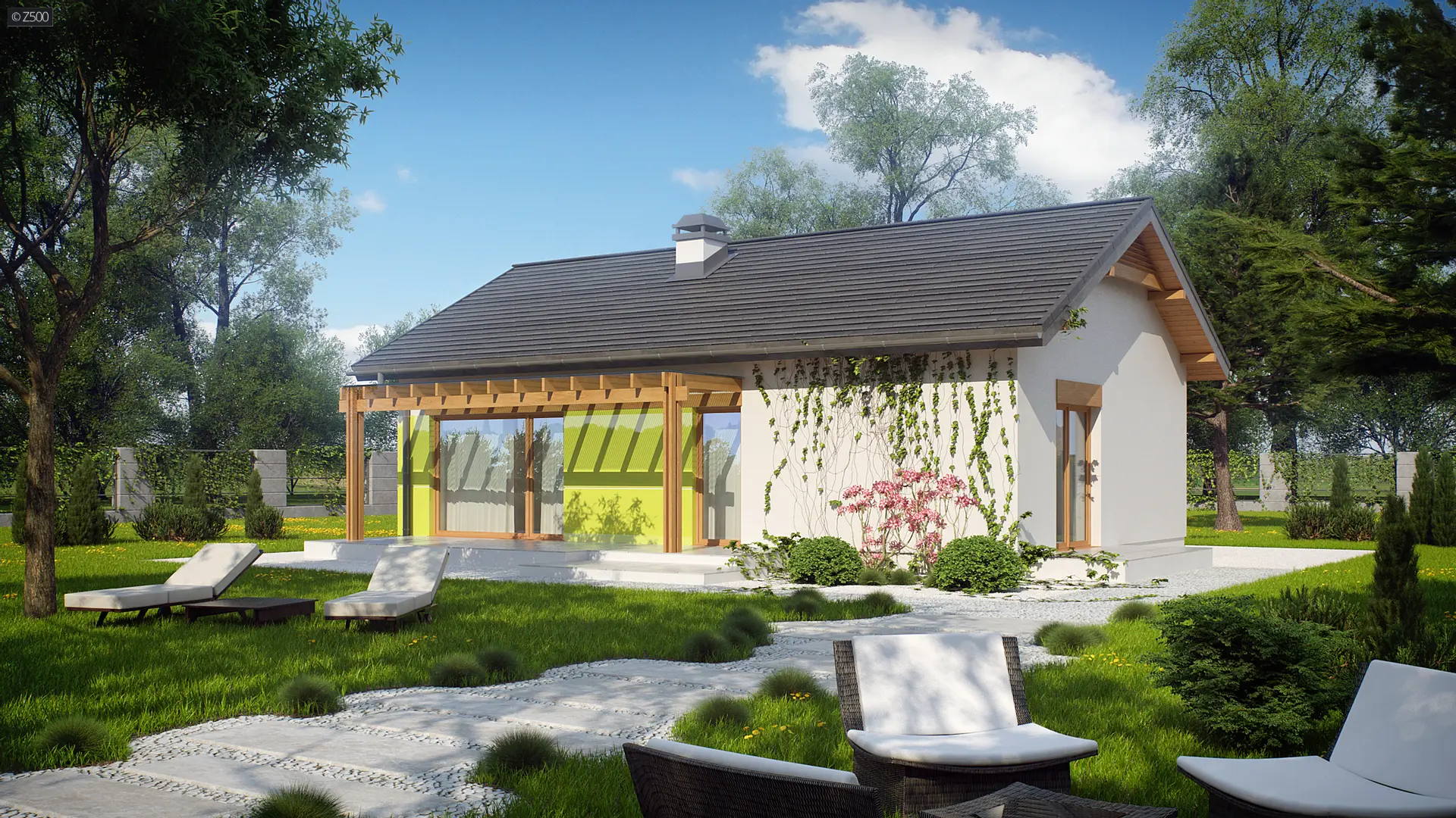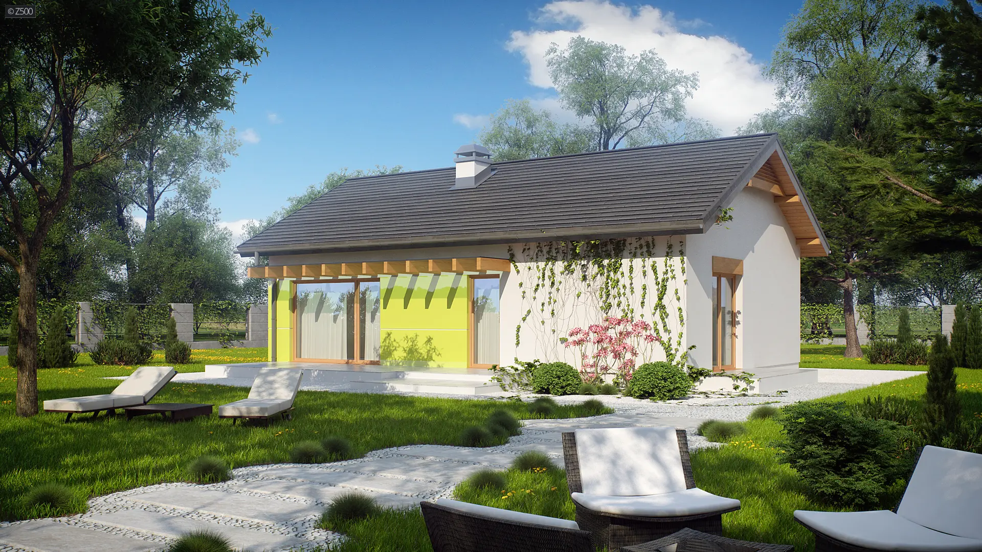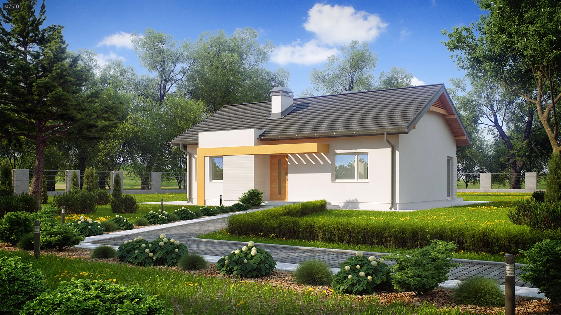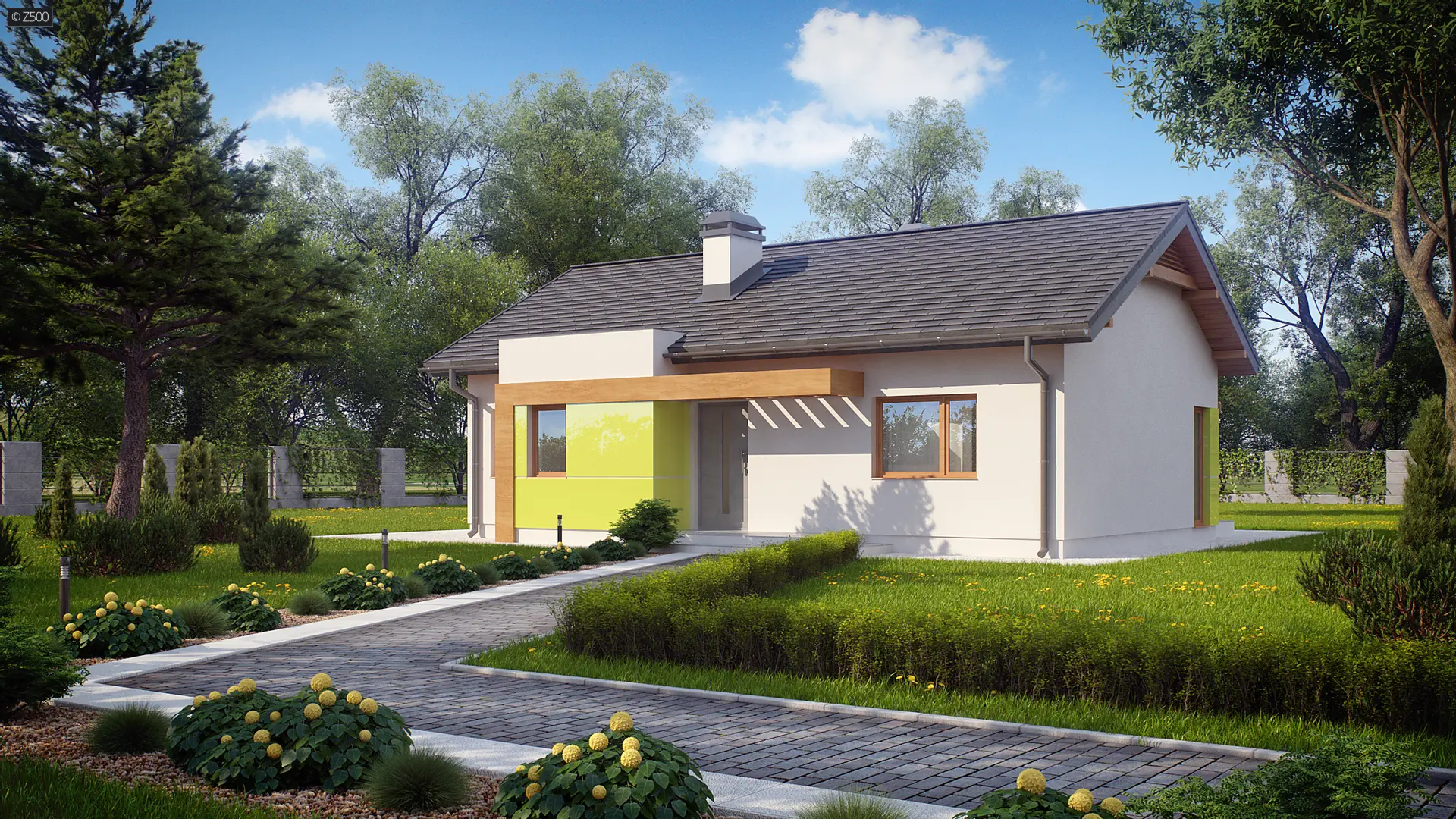 Z249 to zgrabny, kompaktowy dom parterowy z kolekcji LEO. Prostą bryłę przekrytą dwuspadowym dachem urozmaica wykusz od frontu z  ciekawa formą zadaszenia.