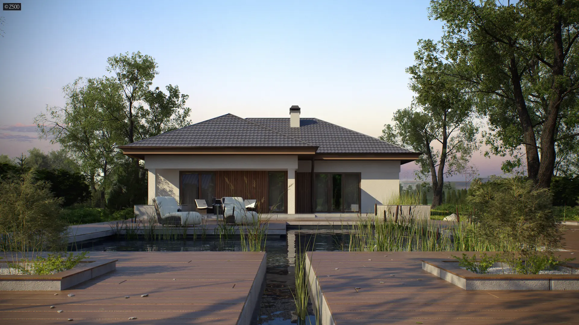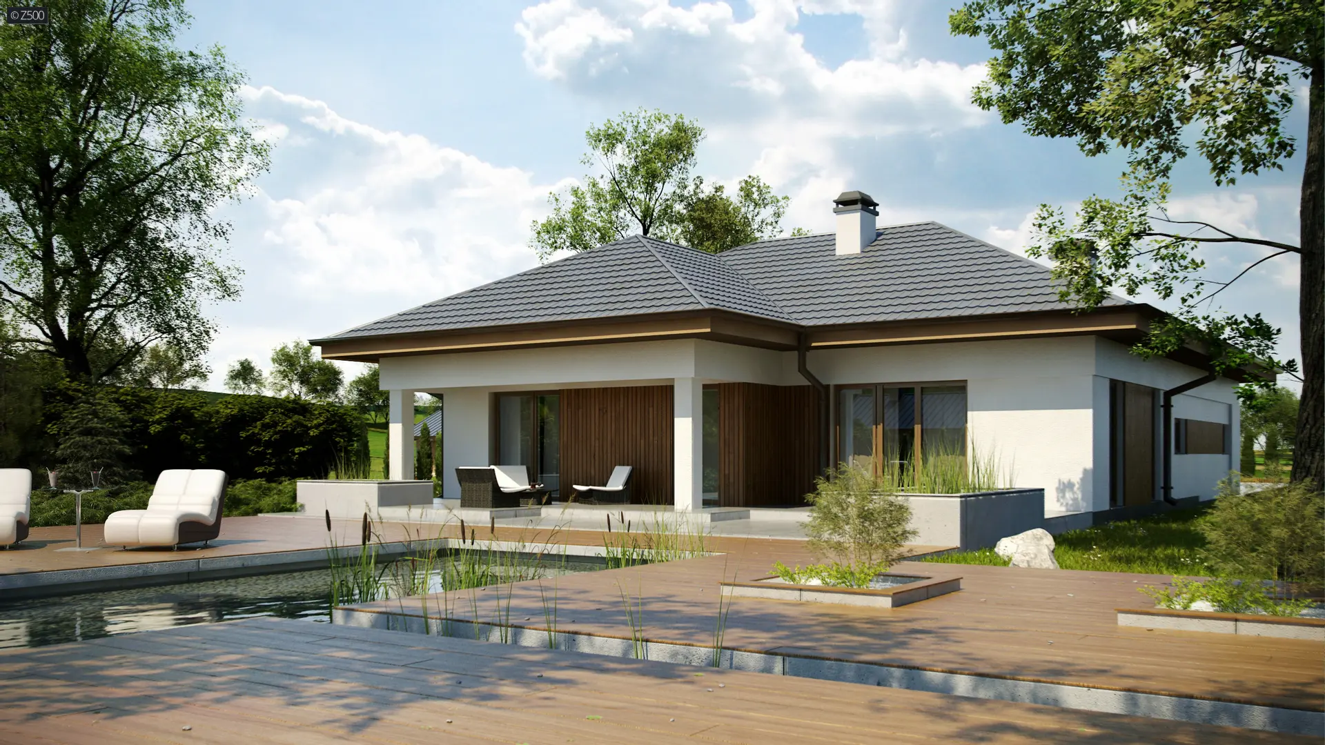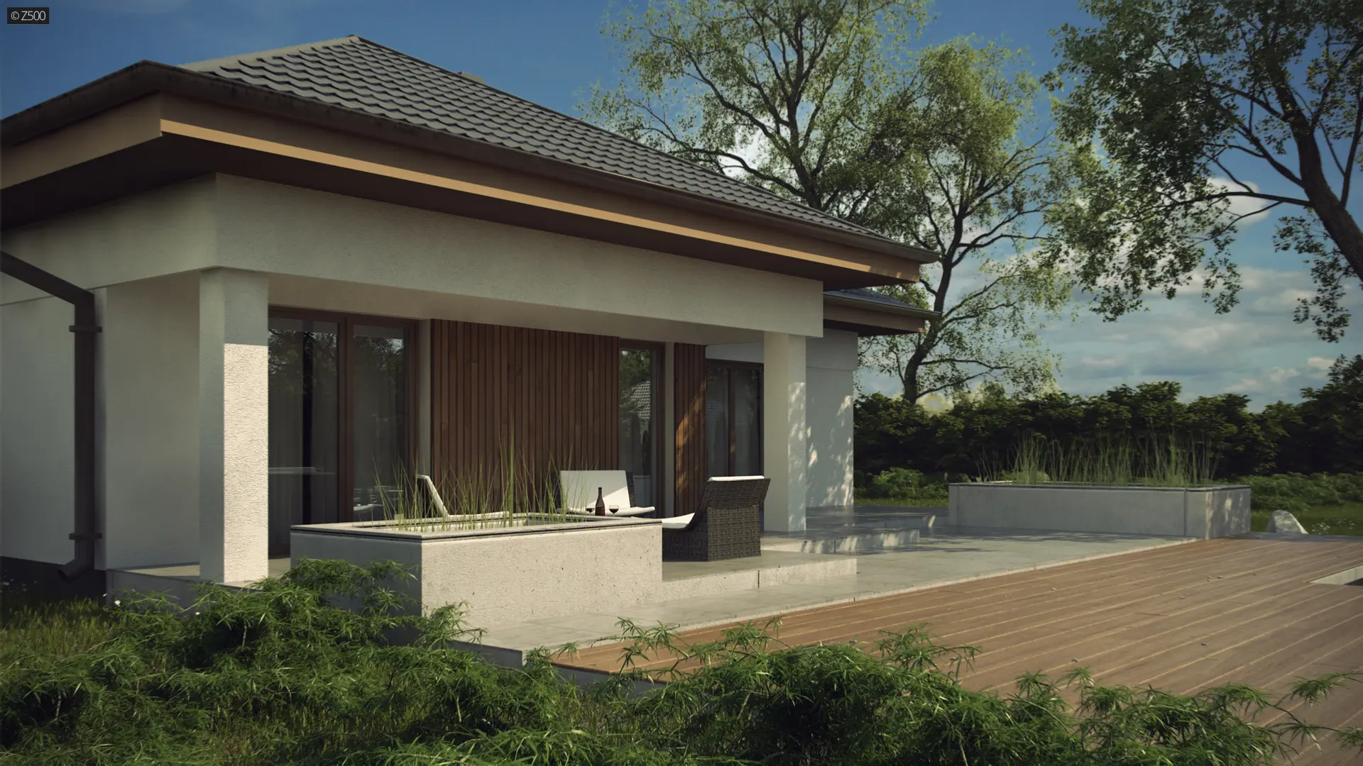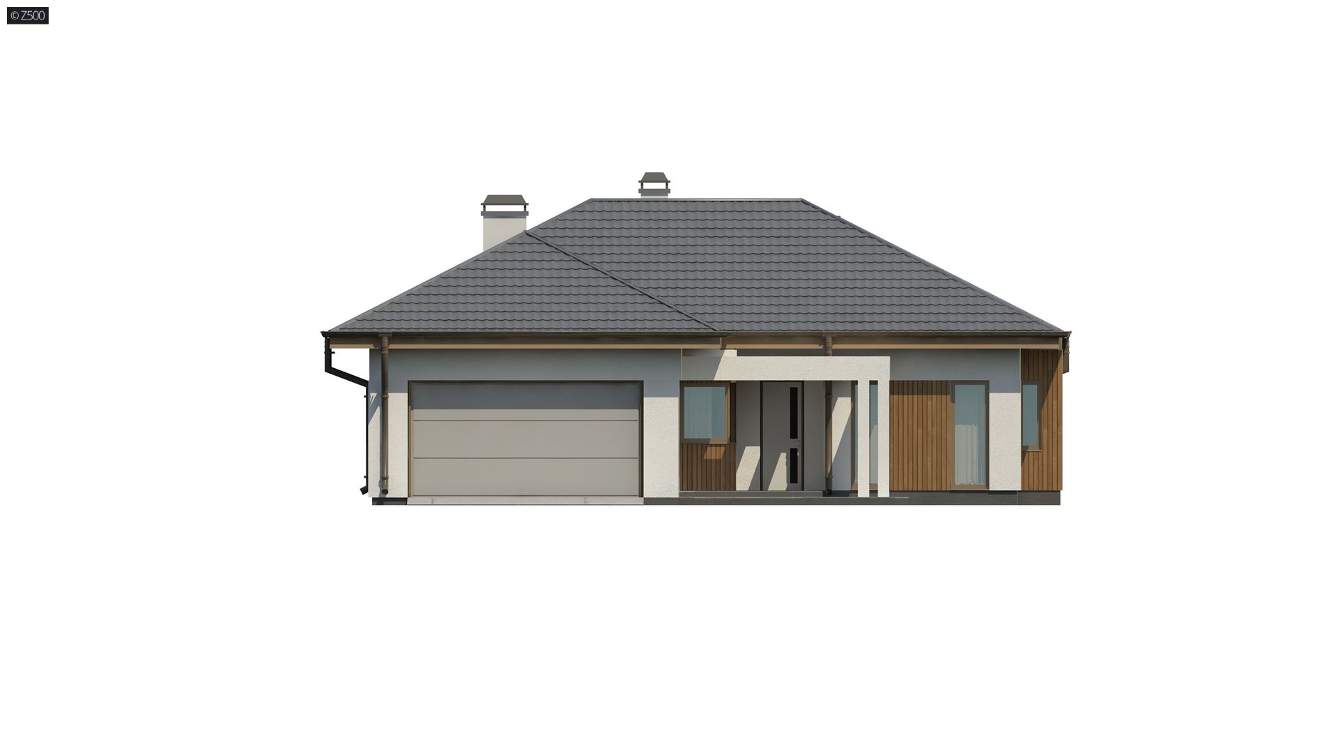 Projekt Z289 to propozycja domu parterowego z garażem dwustanowiskowym od frontu. Fragmentaryczne wykończenie ścian drewnem dodaje ciepła i wzbogaca formę.