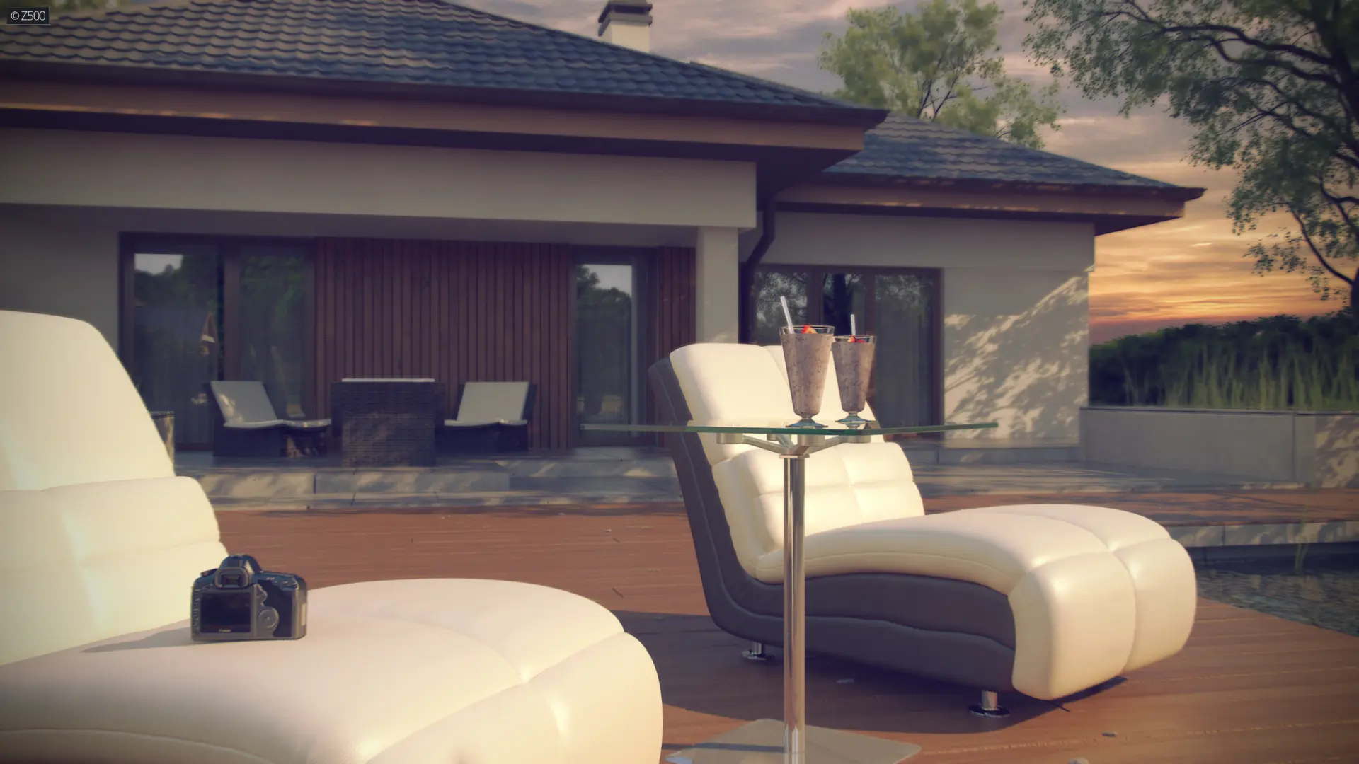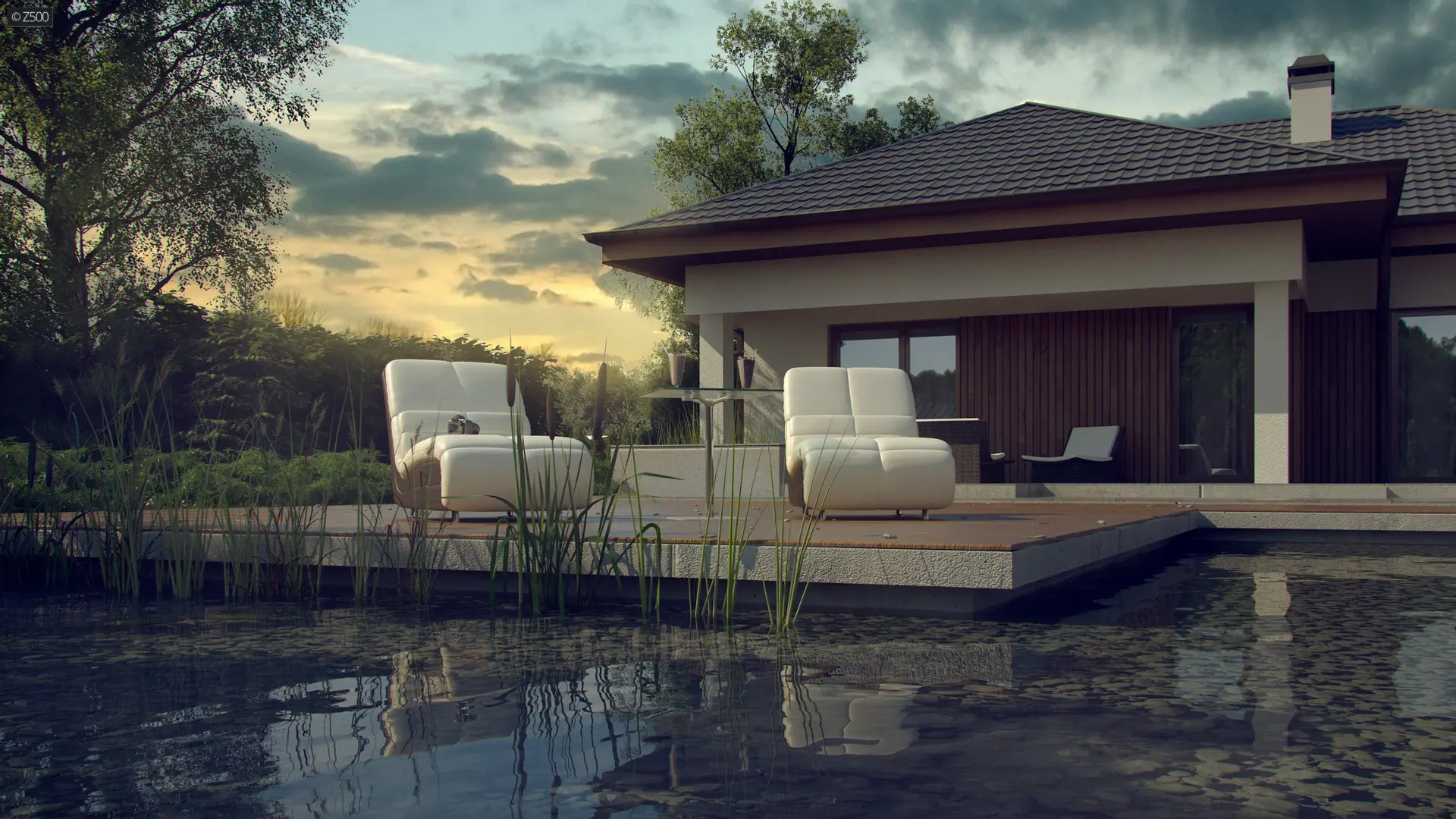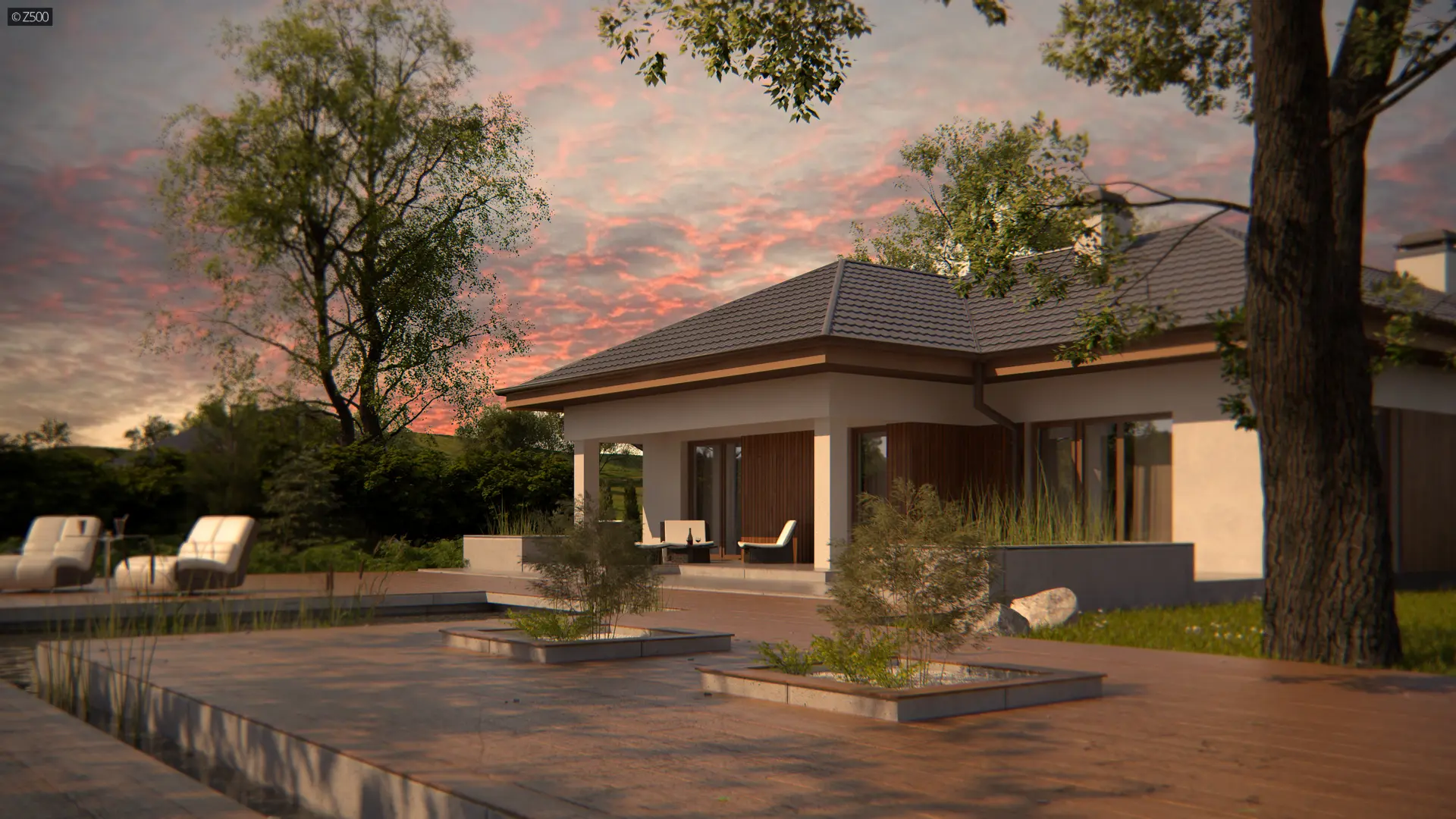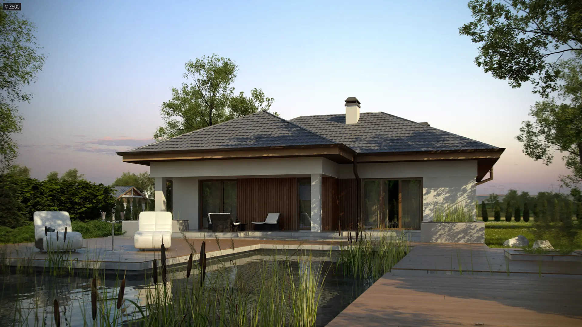 Projekt Z289 to propozycja domu parterowego z garażem dwustanowiskowym od frontu. Fragmentaryczne wykończenie ścian drewnem dodaje ciepła i wzbogaca formę.