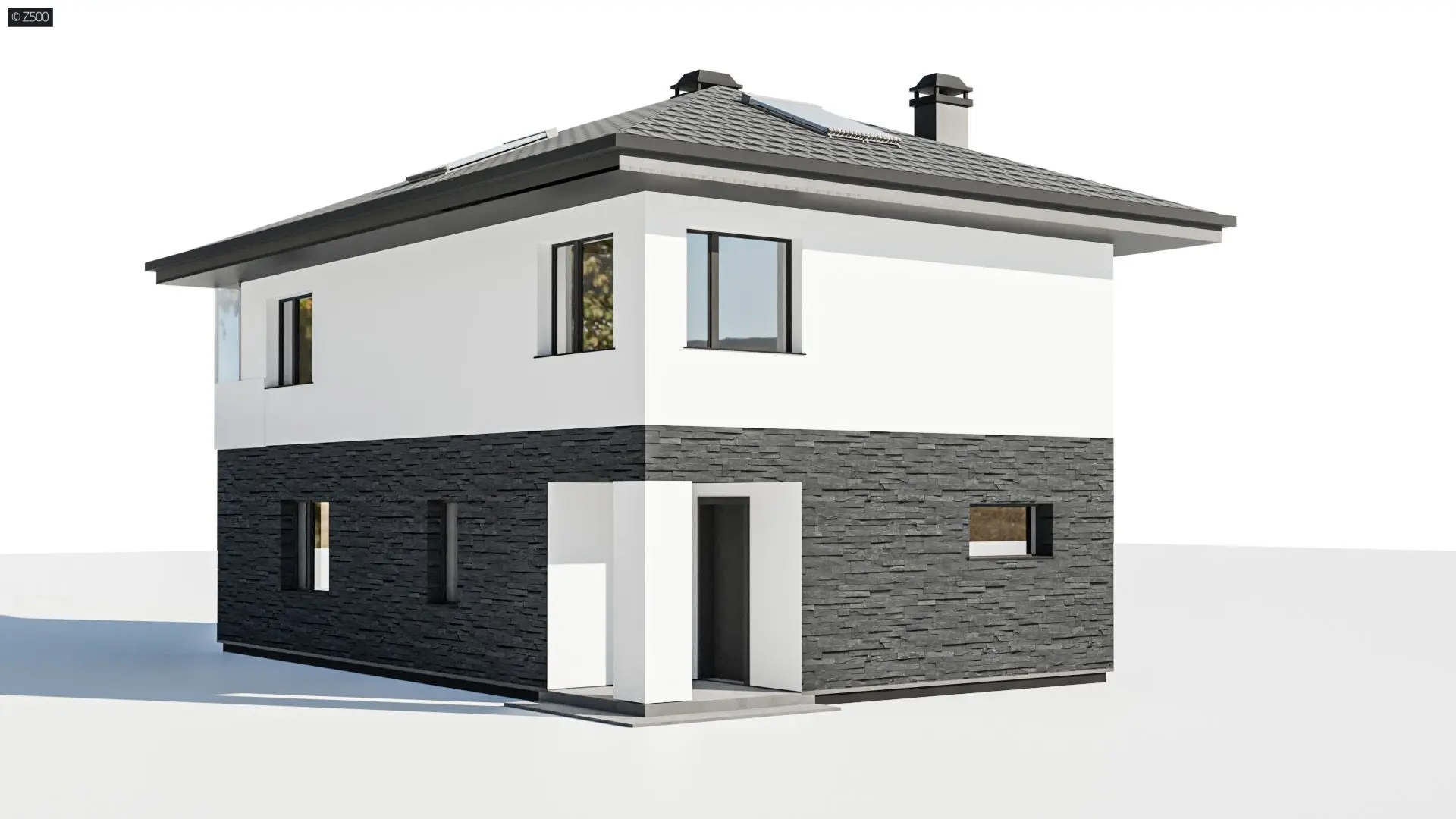 Z295 + to ciekawa propozycja domu nie tylko na wąską działkę. Wejście w narożniku pozwala również na korzystną lokalizację obróconego budynku na działce – z kuchnią od frontu.