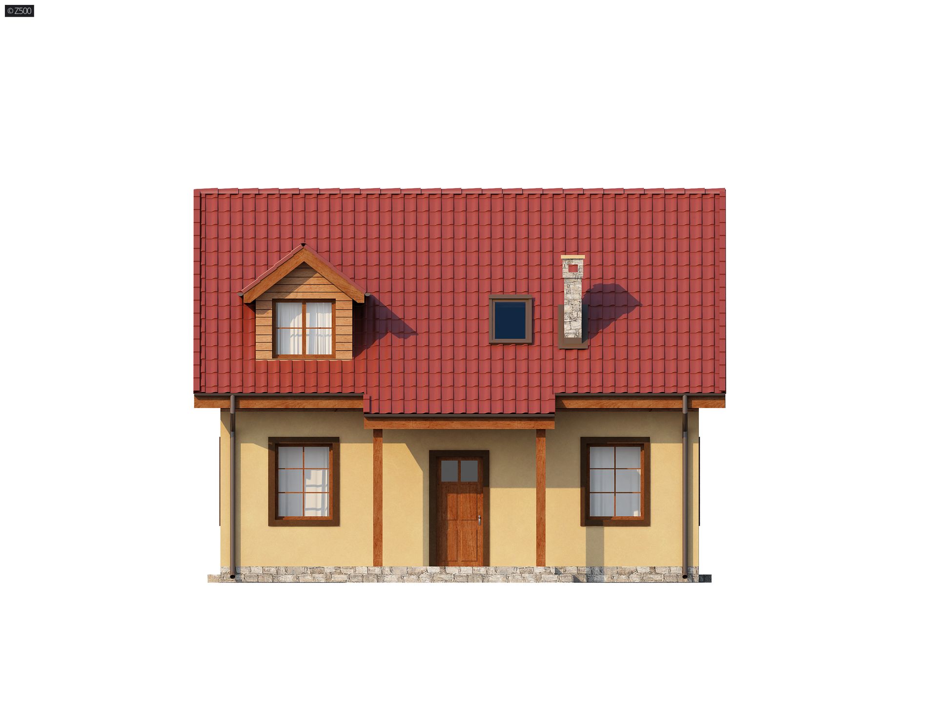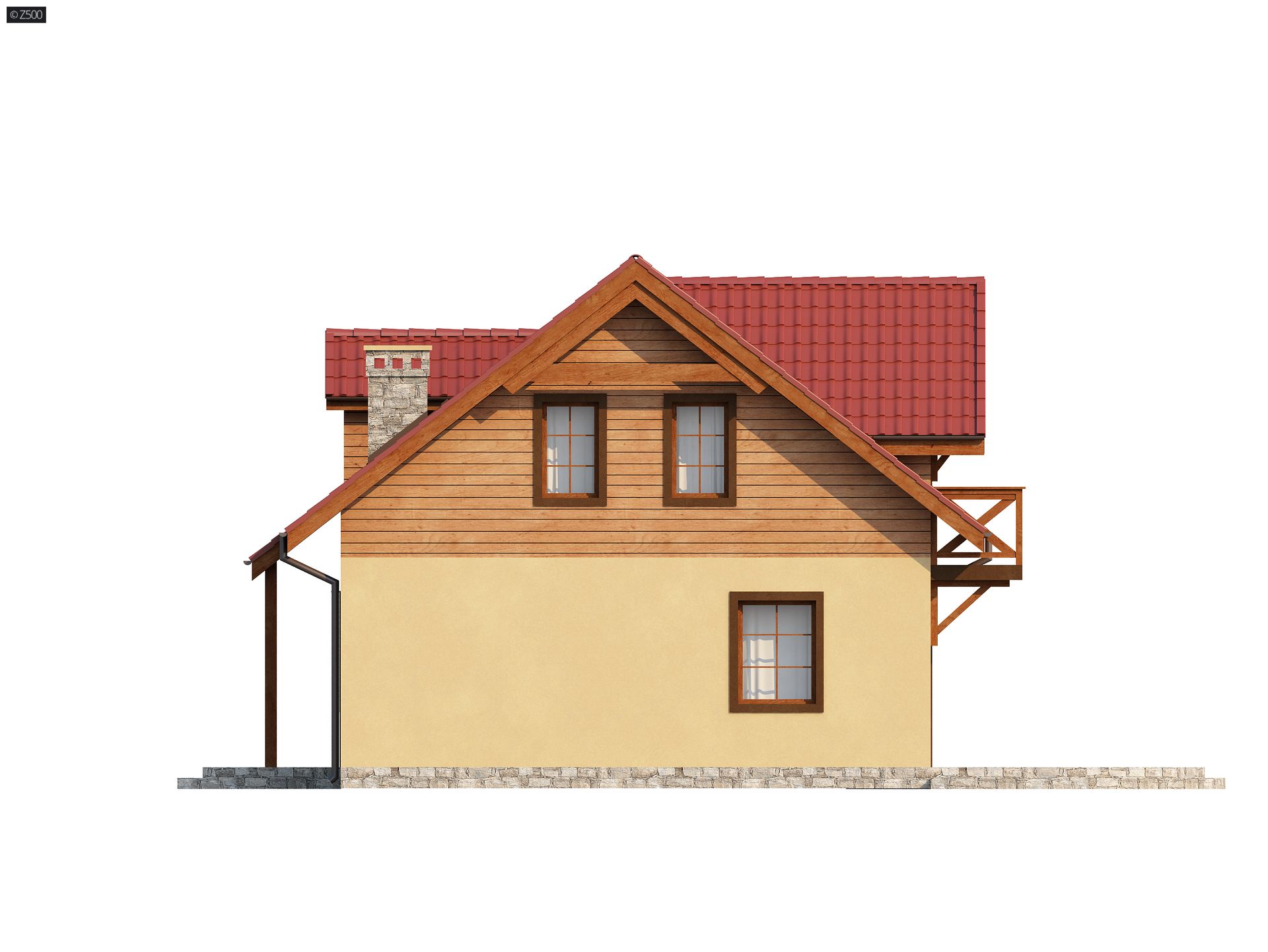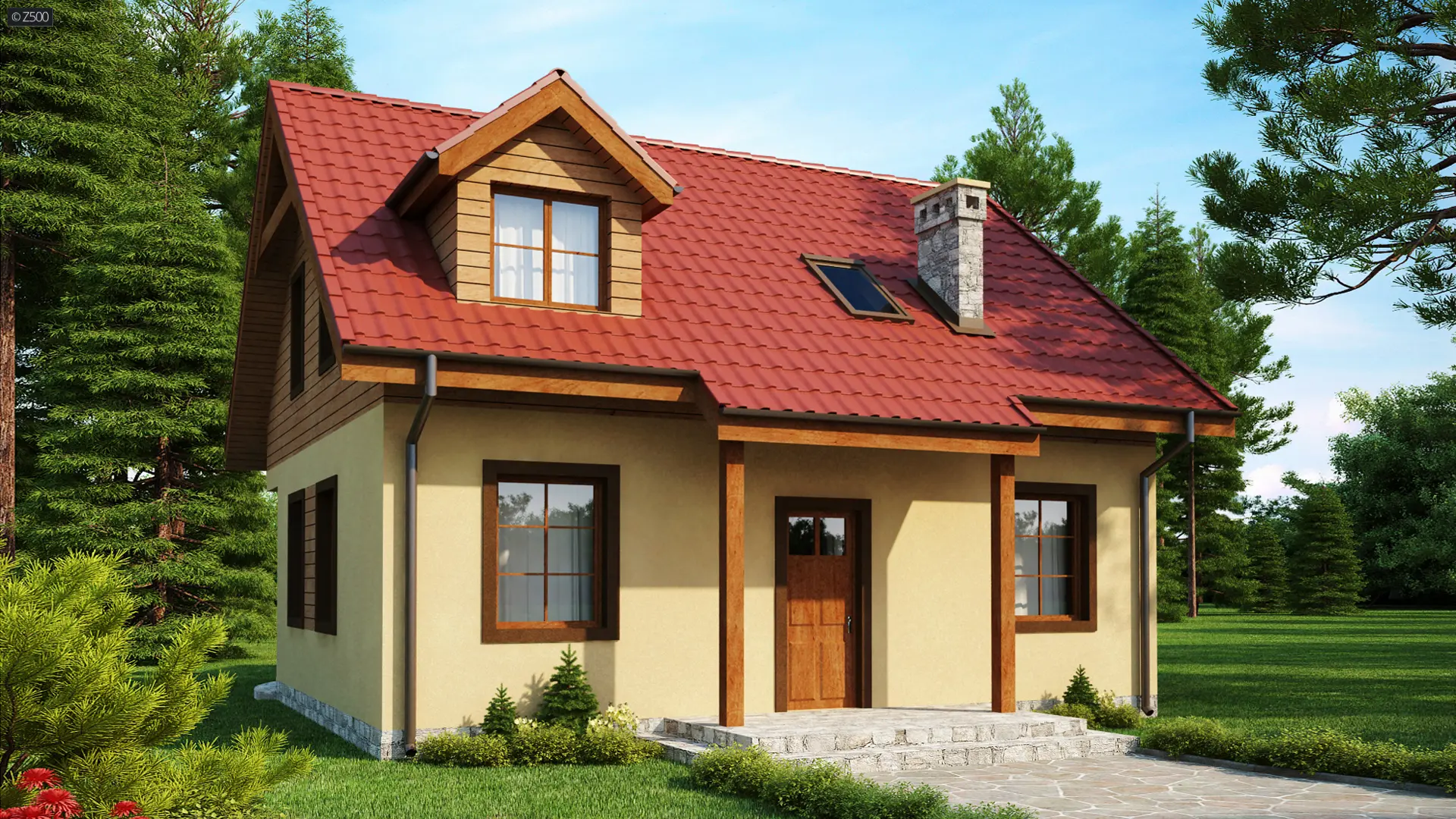 Projekt Z3 to niewielki ale wygodny dom o przyjemnym i ciepłym wyglądzie zewnętrznym, przeznaczony na działkę letniskową lub jako całoroczny dom mieszkalny. Na parterze zaprojektowano pokój dzienny z dwustronnym kominkiem, doskonale nadającym się na długie zimowe wieczory lub letnie „posiedzenia” na tarasie przy zadaszonym grillu. Widna kuchnia połączoną z jadalnią, spełni potrzeby każdej pani domu. W jadalni zmieści się całkiem spory stół. Na parterze przewidziano także praktyczne schowki i miejsca na szafy wnękowe oraz niezależne pomieszczenie gospodarcze.