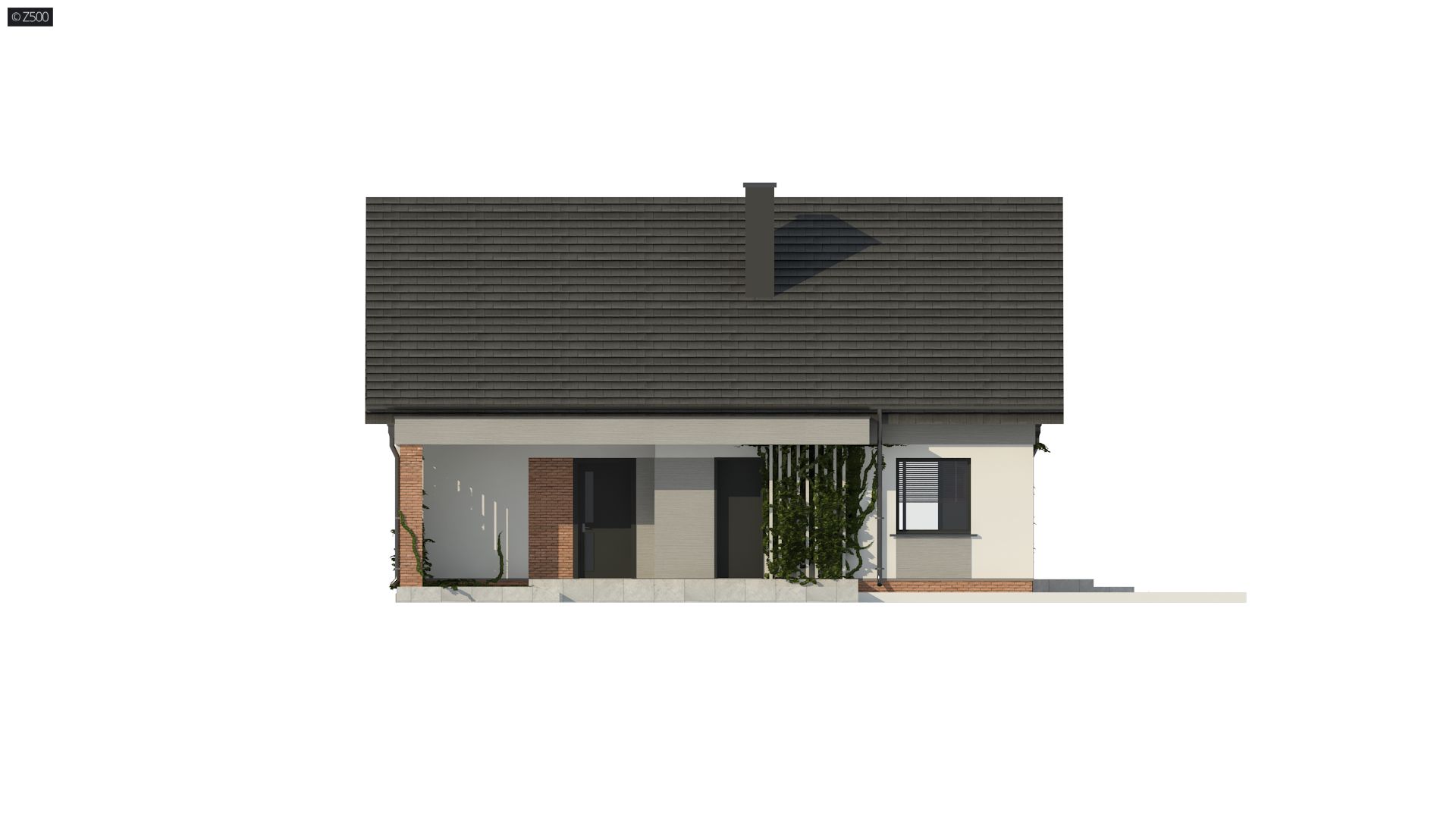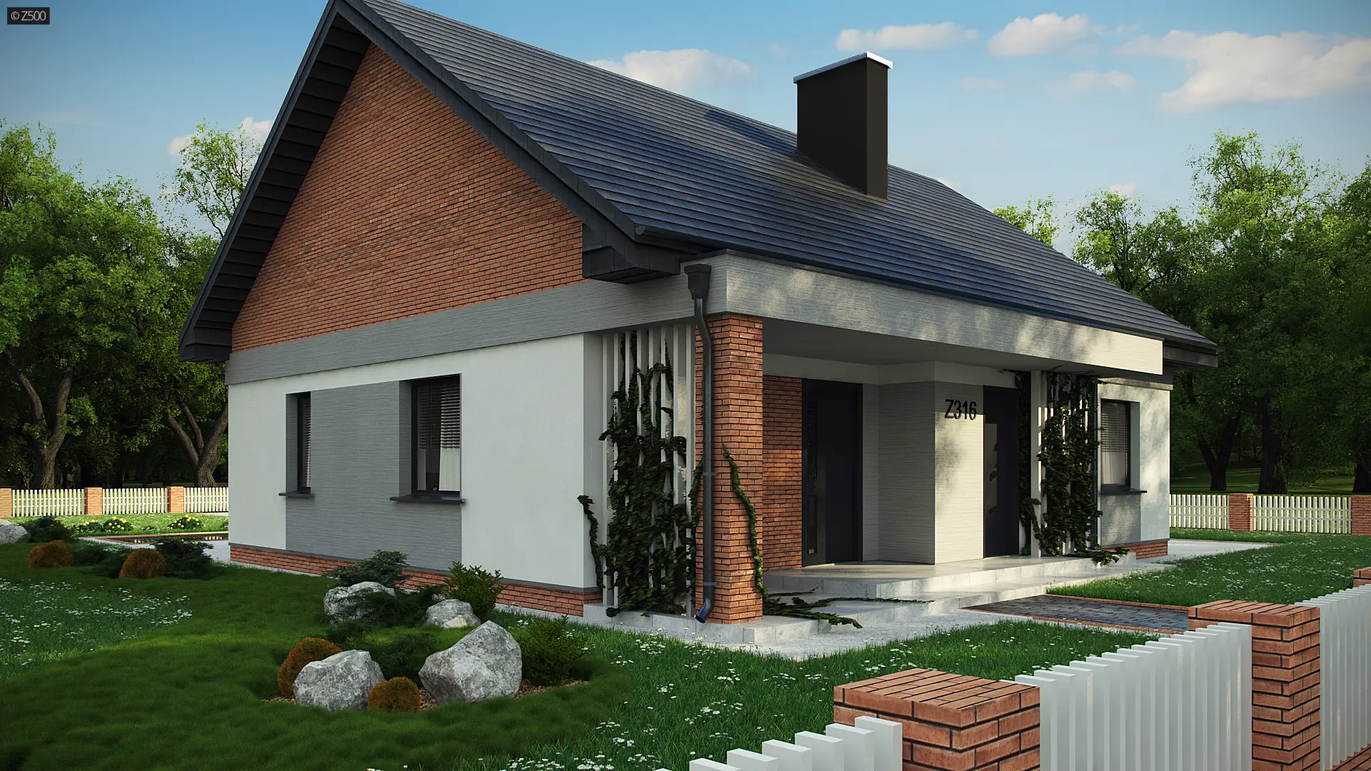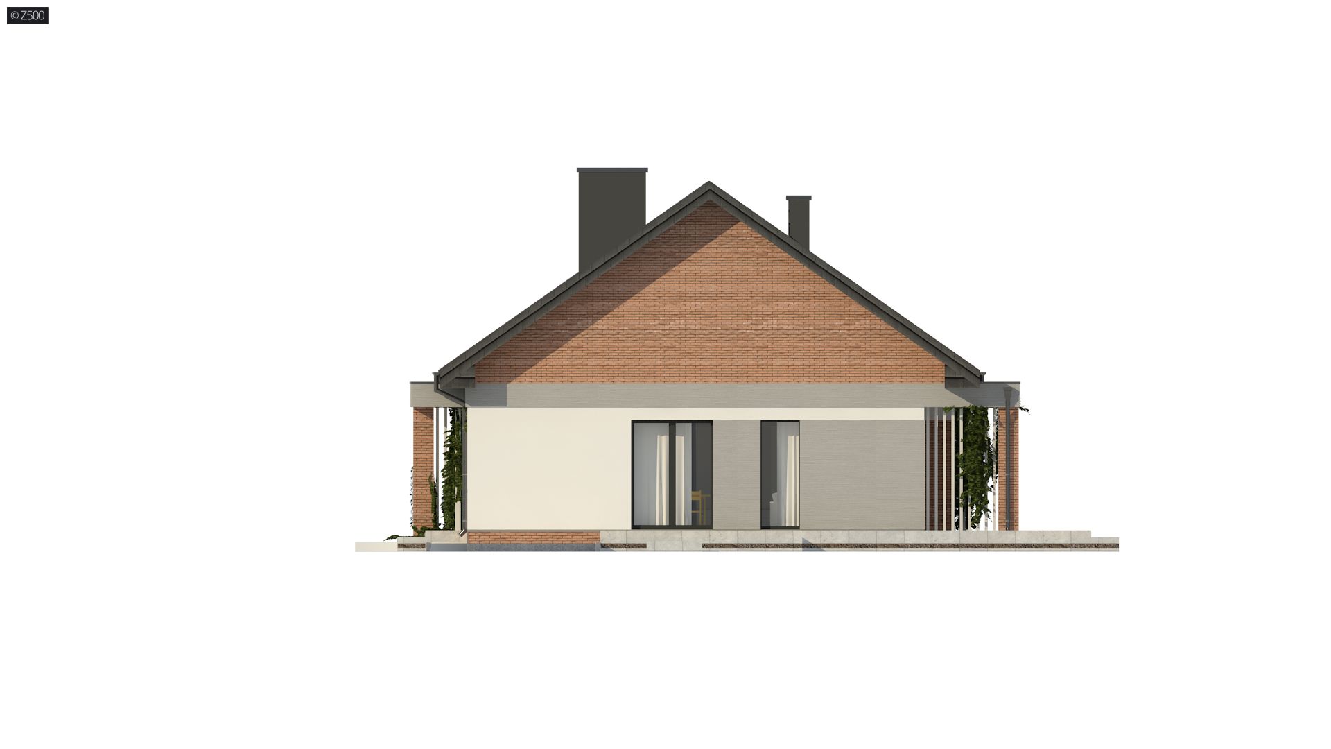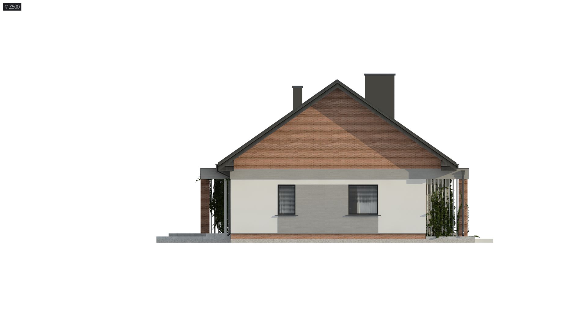 Projekt tradycyjnego domu parterowego z dachem dwuspadowym, ciepłą elewacją oraz gorącym wnętrzem. Duże przeszklenia stanowią domenę tylnej części domu. Elewację wykończono cegłą ewentualnie klinkierem oraz szarym tynkiem. W droższej wersji można użyć szarych płyt na białym podłożu. Całość urozmaicono pergolami, umieszczając je zarówno od strony frontowej, jak i ogrodowej.