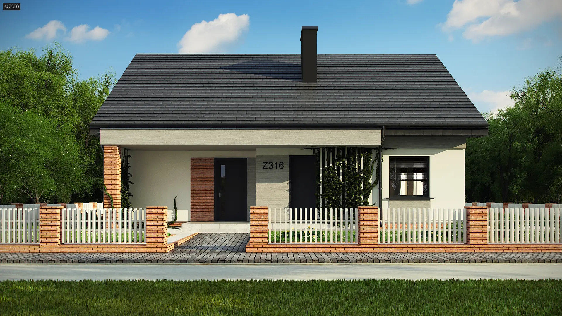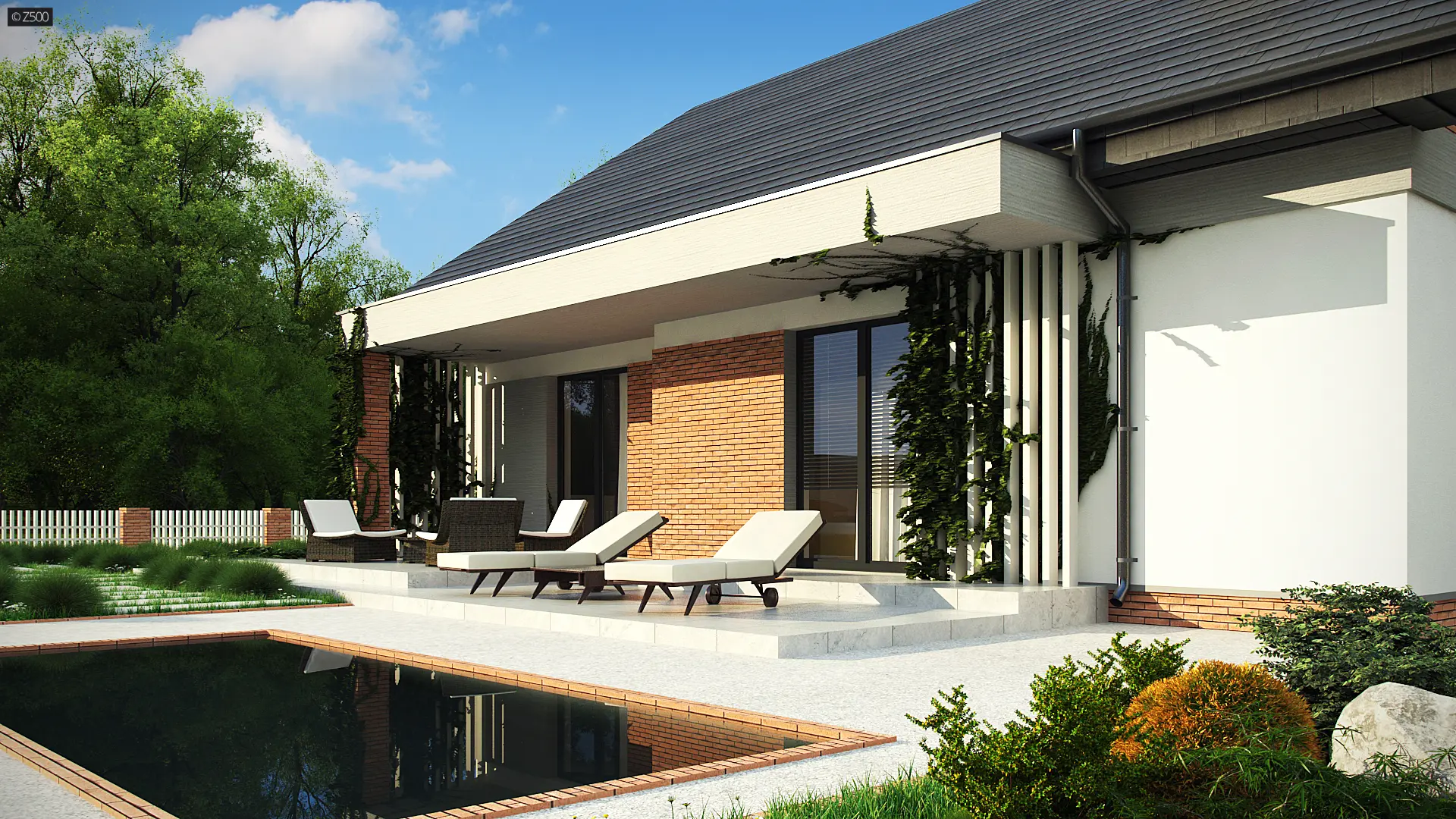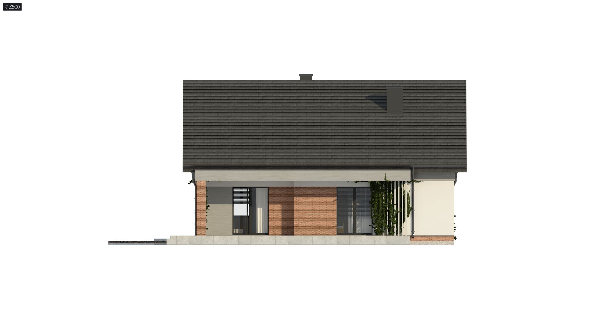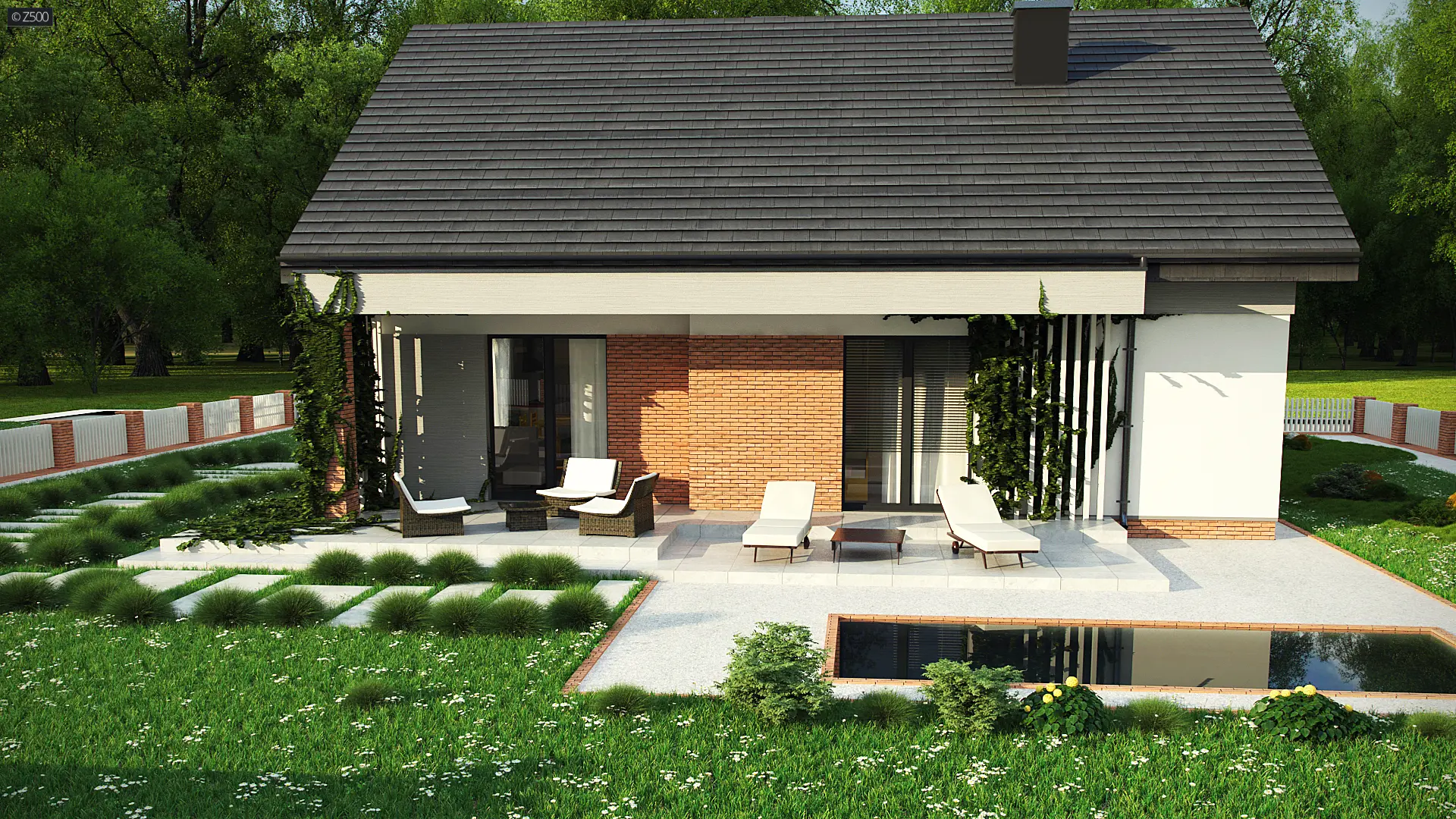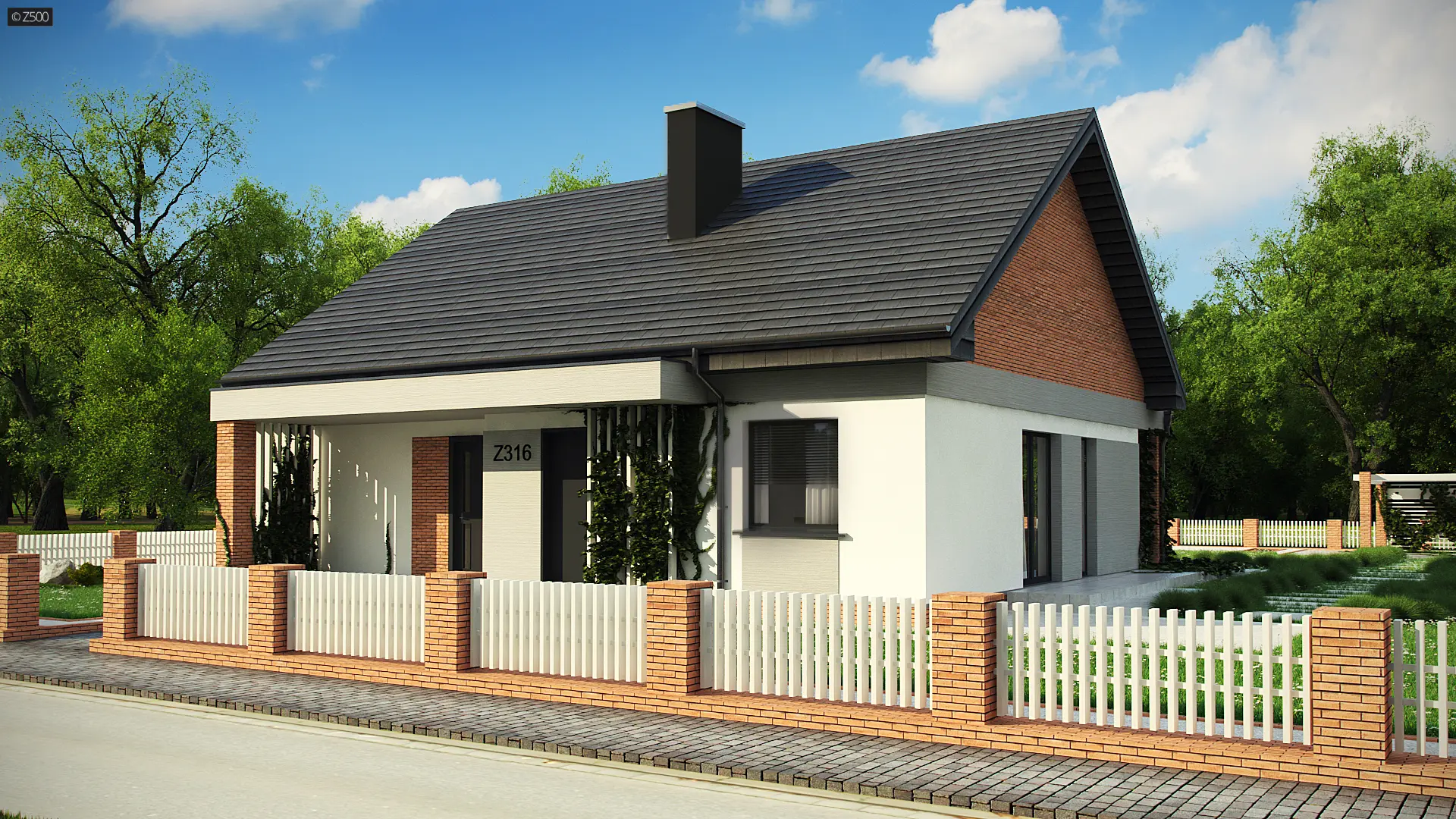 Projekt tradycyjnego domu parterowego z dachem dwuspadowym, ciepłą elewacją oraz gorącym wnętrzem. Duże przeszklenia stanowią domenę tylnej części domu. Elewację wykończono cegłą ewentualnie klinkierem oraz szarym tynkiem. W droższej wersji można użyć szarych płyt na białym podłożu. Całość urozmaicono pergolami, umieszczając je zarówno od strony frontowej, jak i ogrodowej.