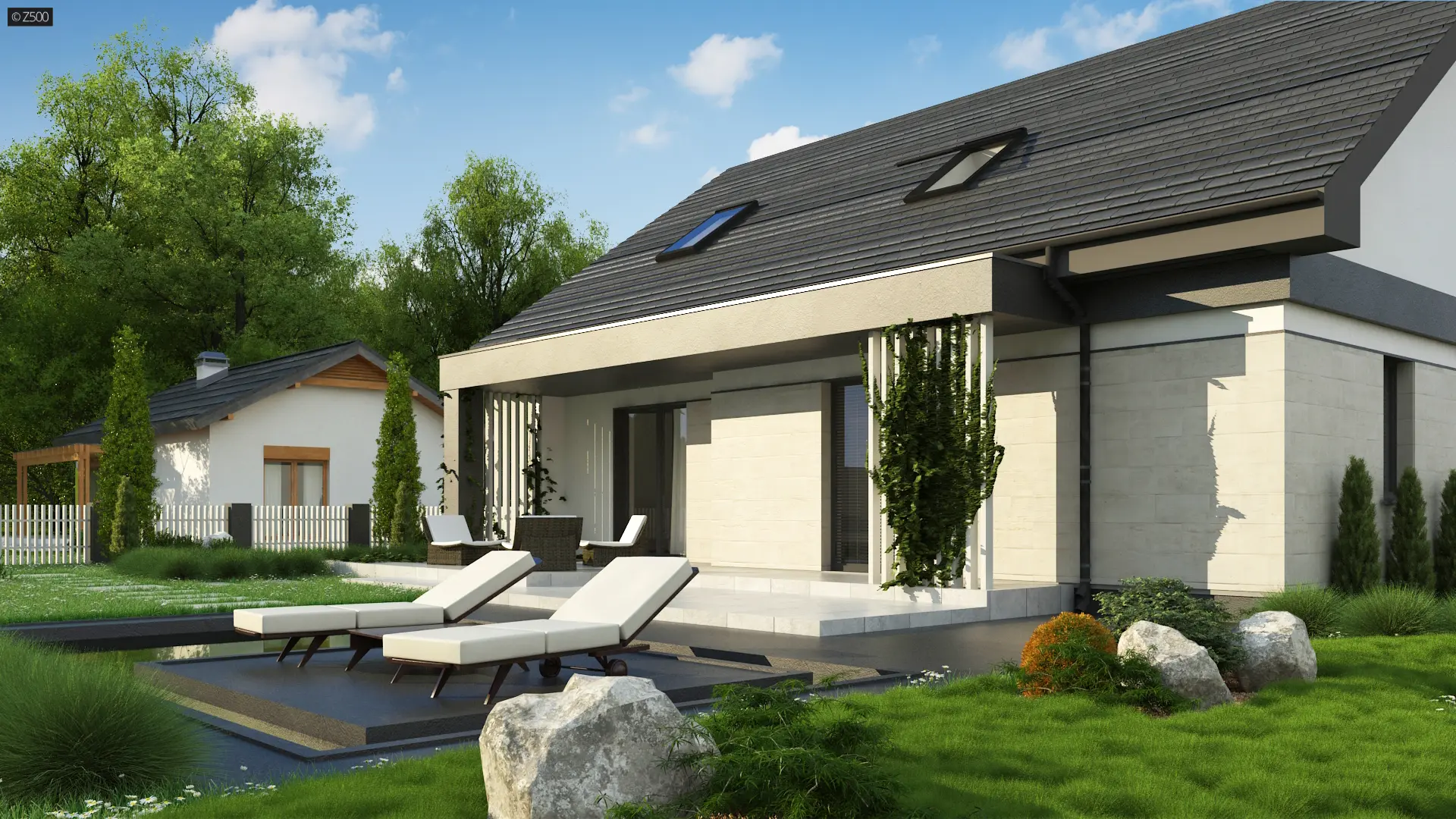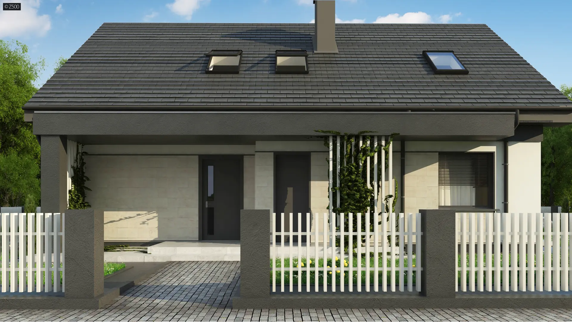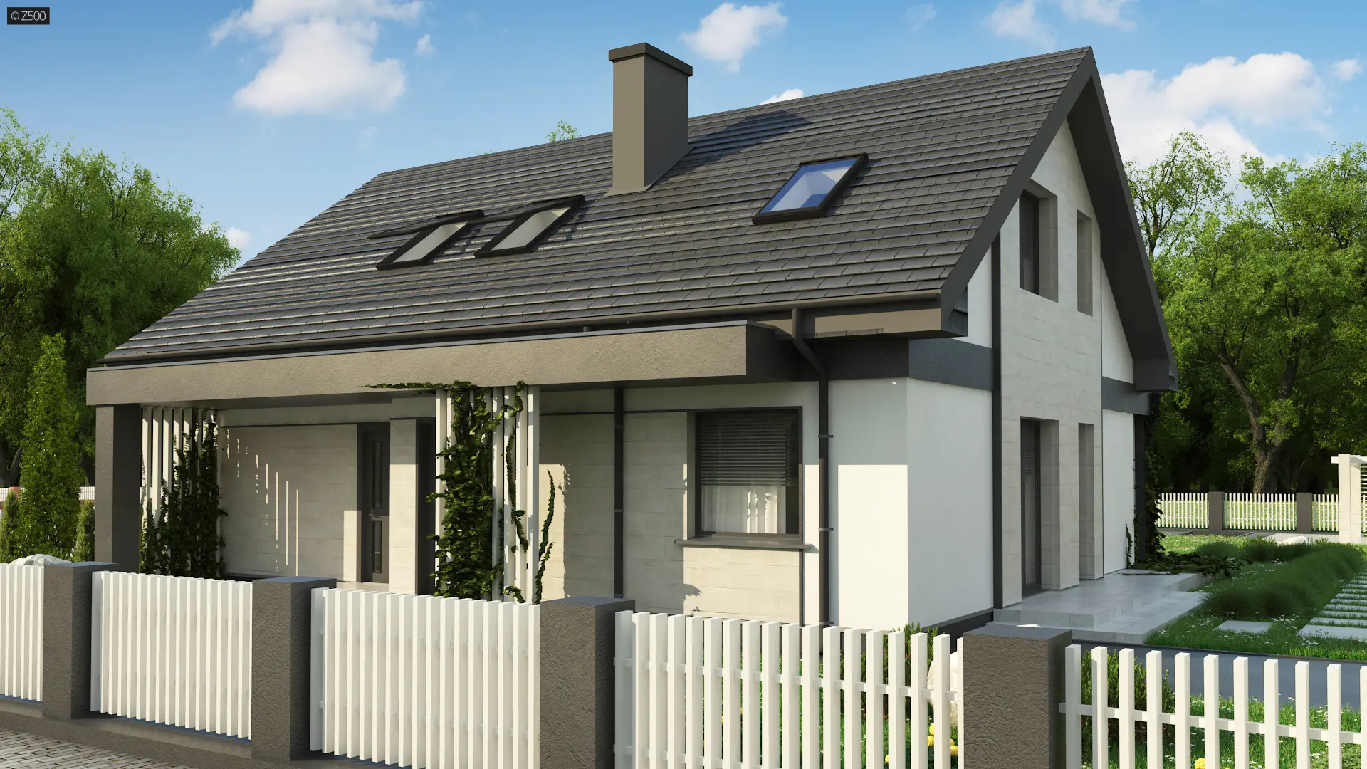 Projekt tradycyjnego domu parterowego z dachem dwuspadowym, ciepłą elewacją oraz gorącym wnętrzem. Duże przeszklenia stanowią domenę tylnej części domu. Elewację wykończono cegłą ewentualnie klinkierem oraz szarym tynkiem. Całość urozmaicono pergolami, umieszczając je zarówno od strony frontowej, jak i ogrodowej.