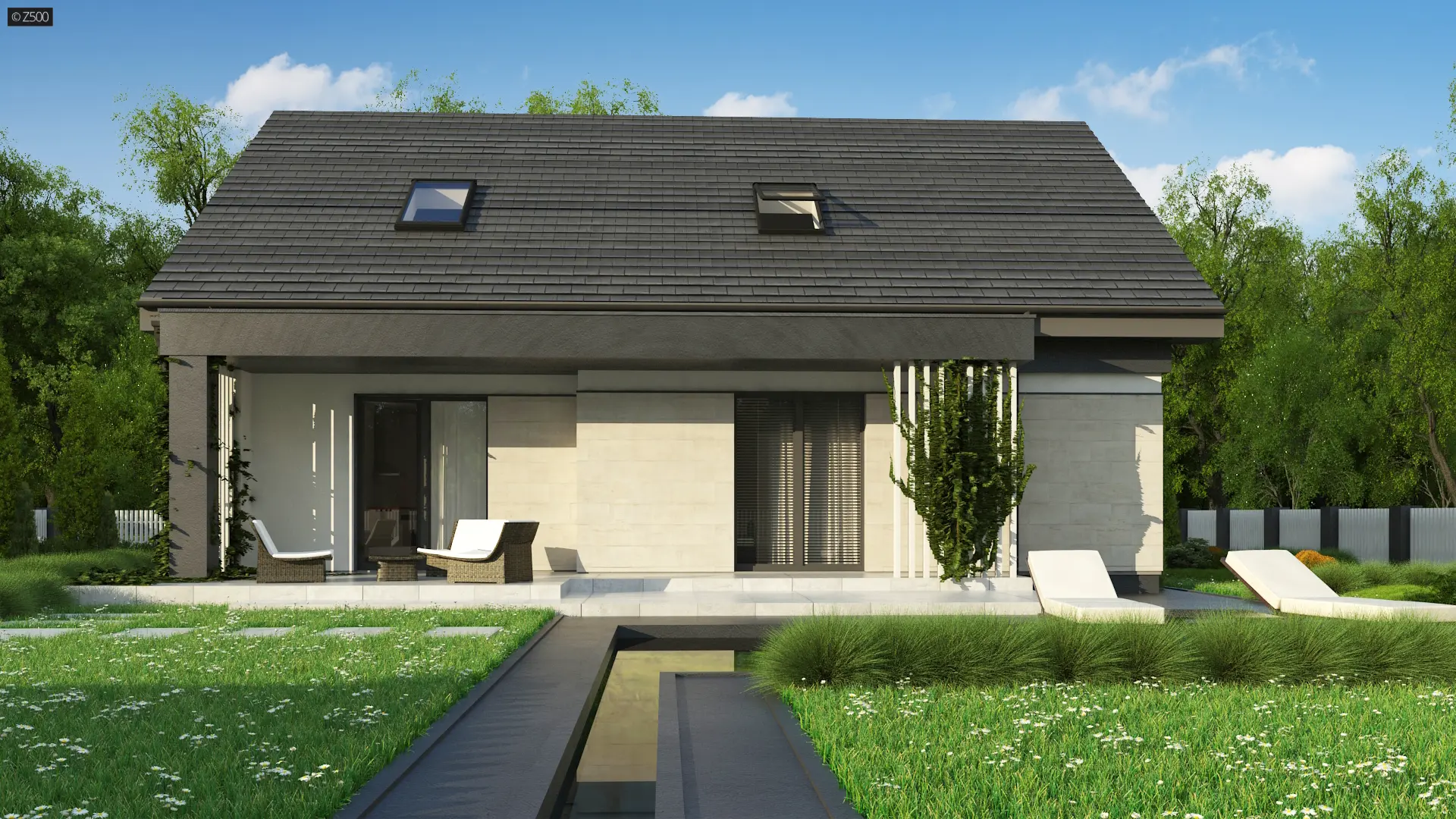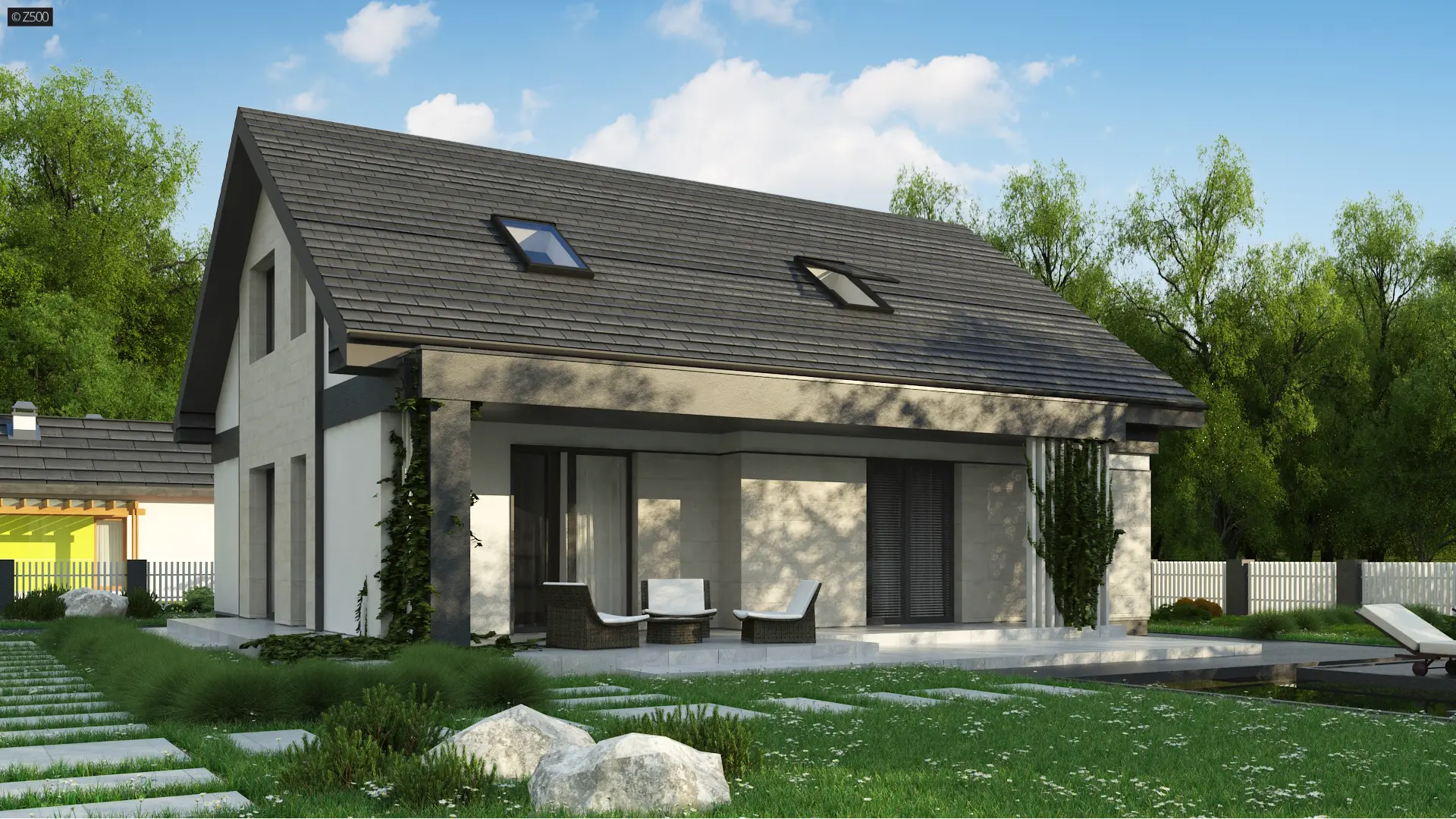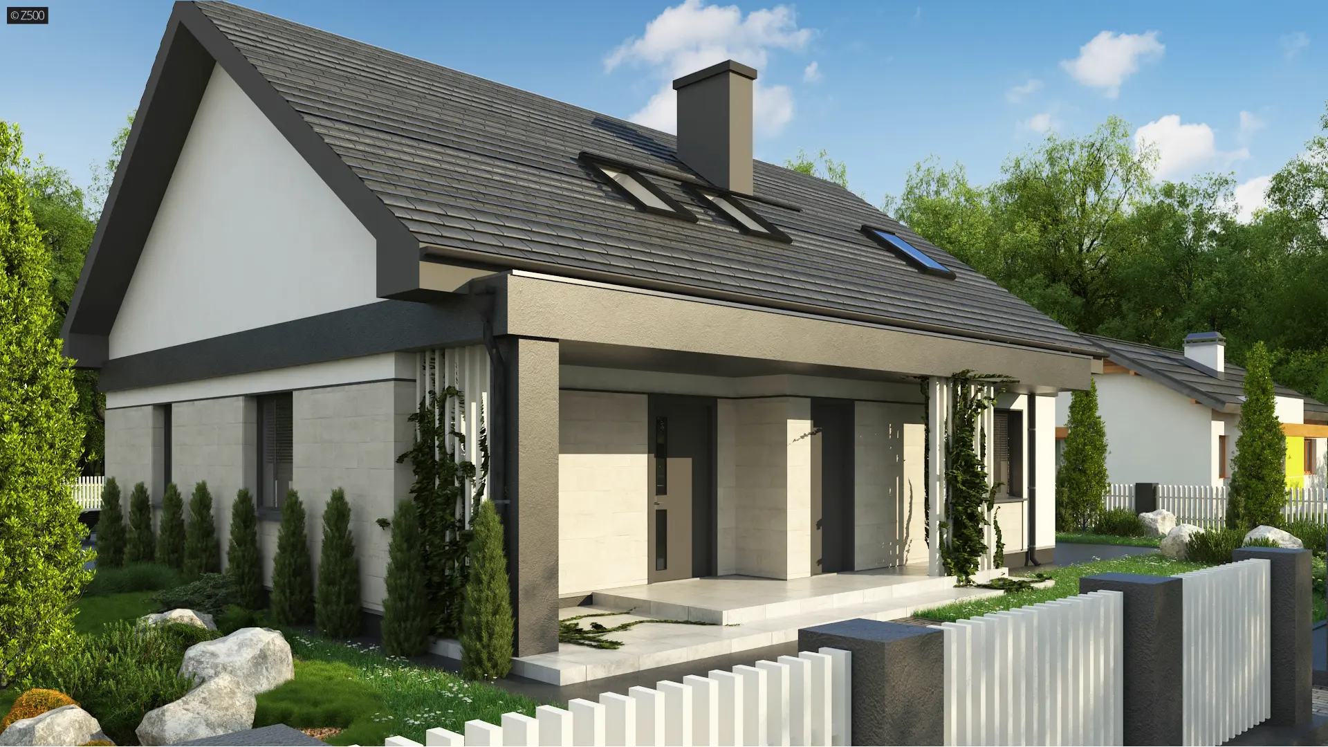 Projekt tradycyjnego domu parterowego z dachem dwuspadowym, ciepłą elewacją oraz gorącym wnętrzem. Duże przeszklenia stanowią domenę tylnej części domu. Elewację wykończono cegłą ewentualnie klinkierem oraz szarym tynkiem. Całość urozmaicono pergolami, umieszczając je zarówno od strony frontowej, jak i ogrodowej.