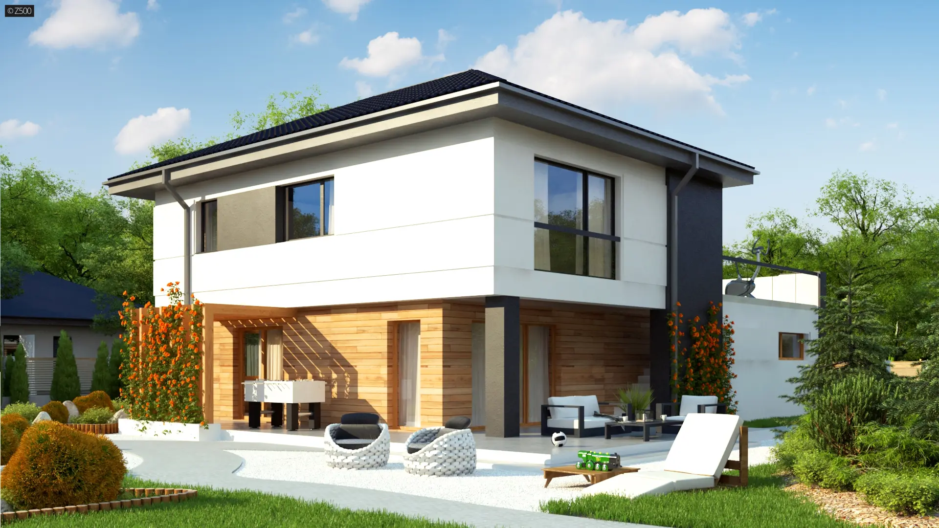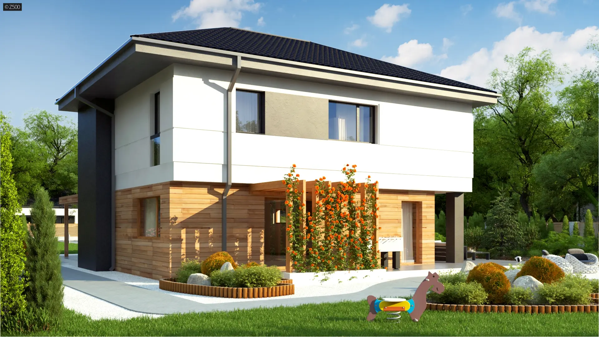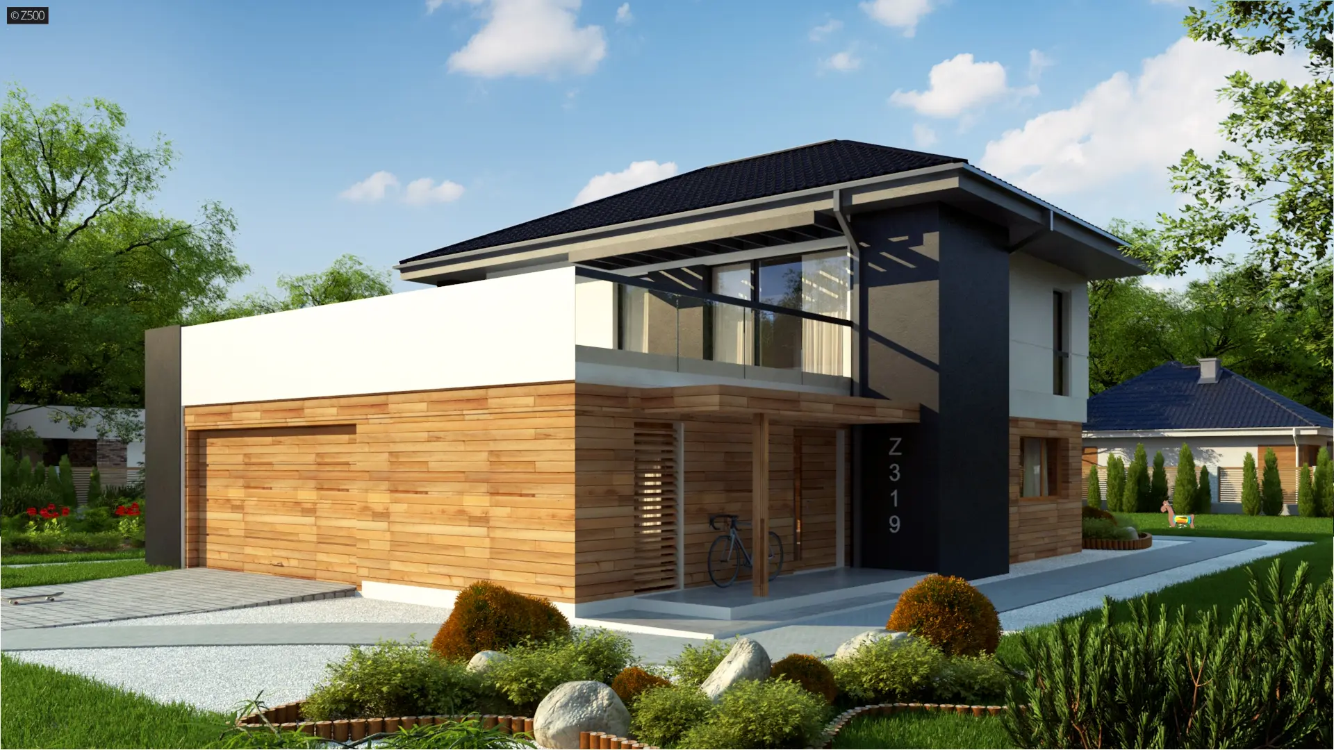 Z319 to funkcjonalny piętrowy dom w stylu współczesnym. Ciekawe elementy wykończenia elewacji nadają mu wyjątkowego charakteru. Projekt wyróżnia obszerny taras nad garażem, dostępny zarówno z poziomu piętra jak i z ogrodu.