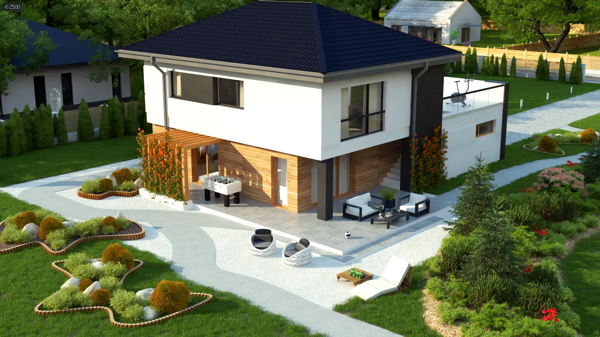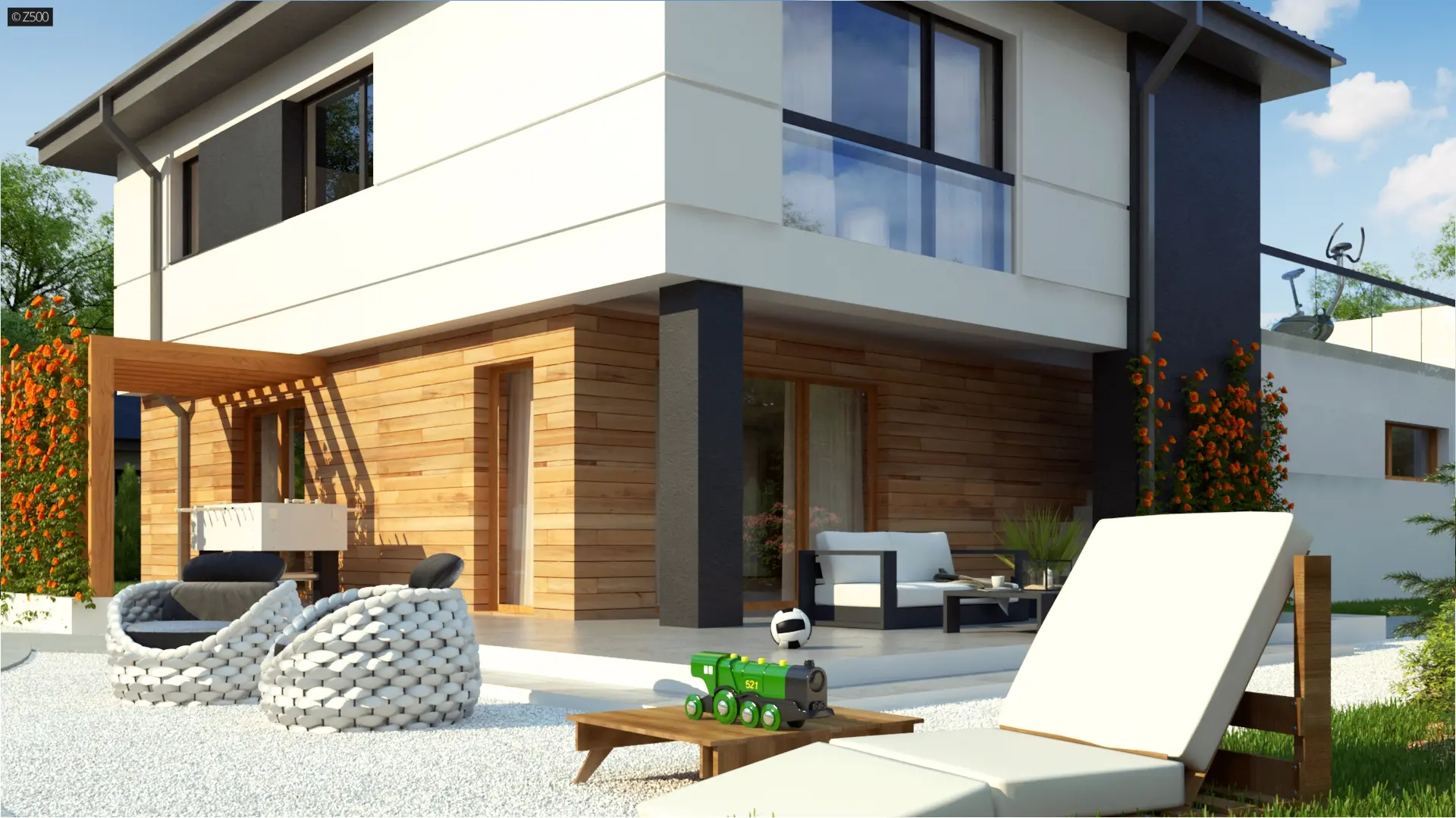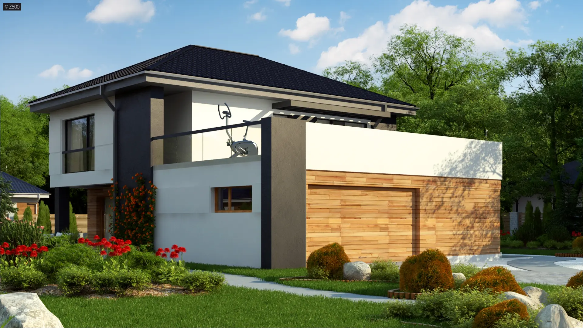 Z319 to funkcjonalny piętrowy dom w stylu współczesnym. Ciekawe elementy wykończenia elewacji nadają mu wyjątkowego charakteru. Projekt wyróżnia obszerny taras nad garażem, dostępny zarówno z poziomu piętra jak i z ogrodu.