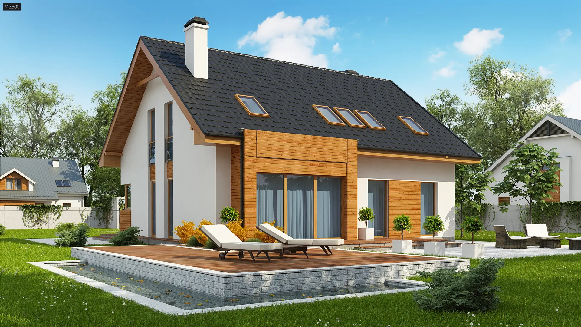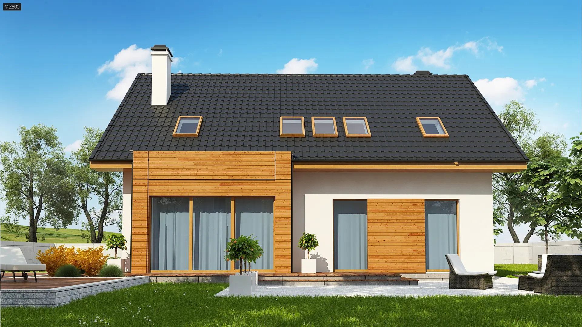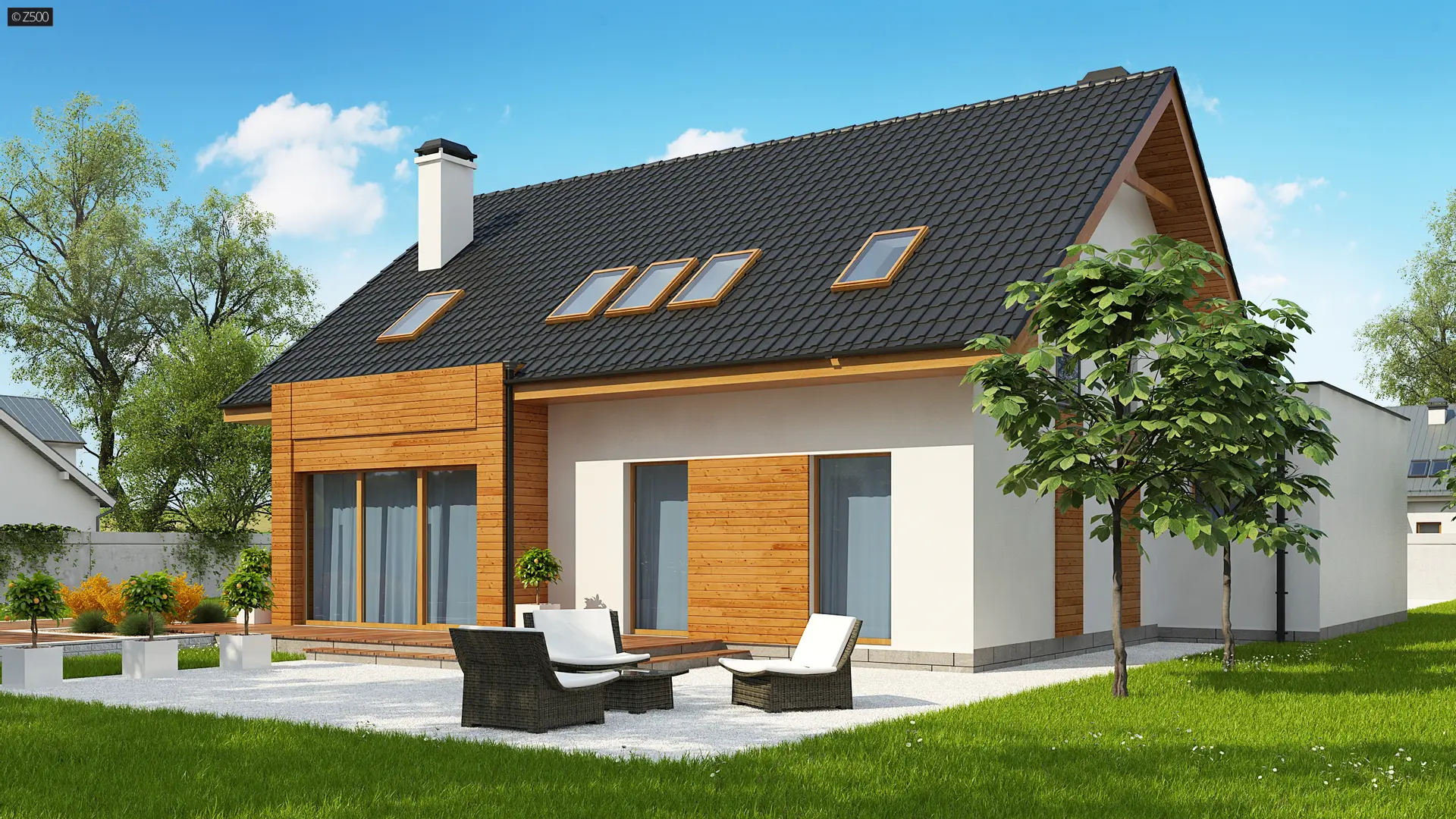 Połączenie białego tynku i drewna stanowi klasyczną elegancję elewacji zachęcając do stania się właścicielem tego oryginalnego domu.