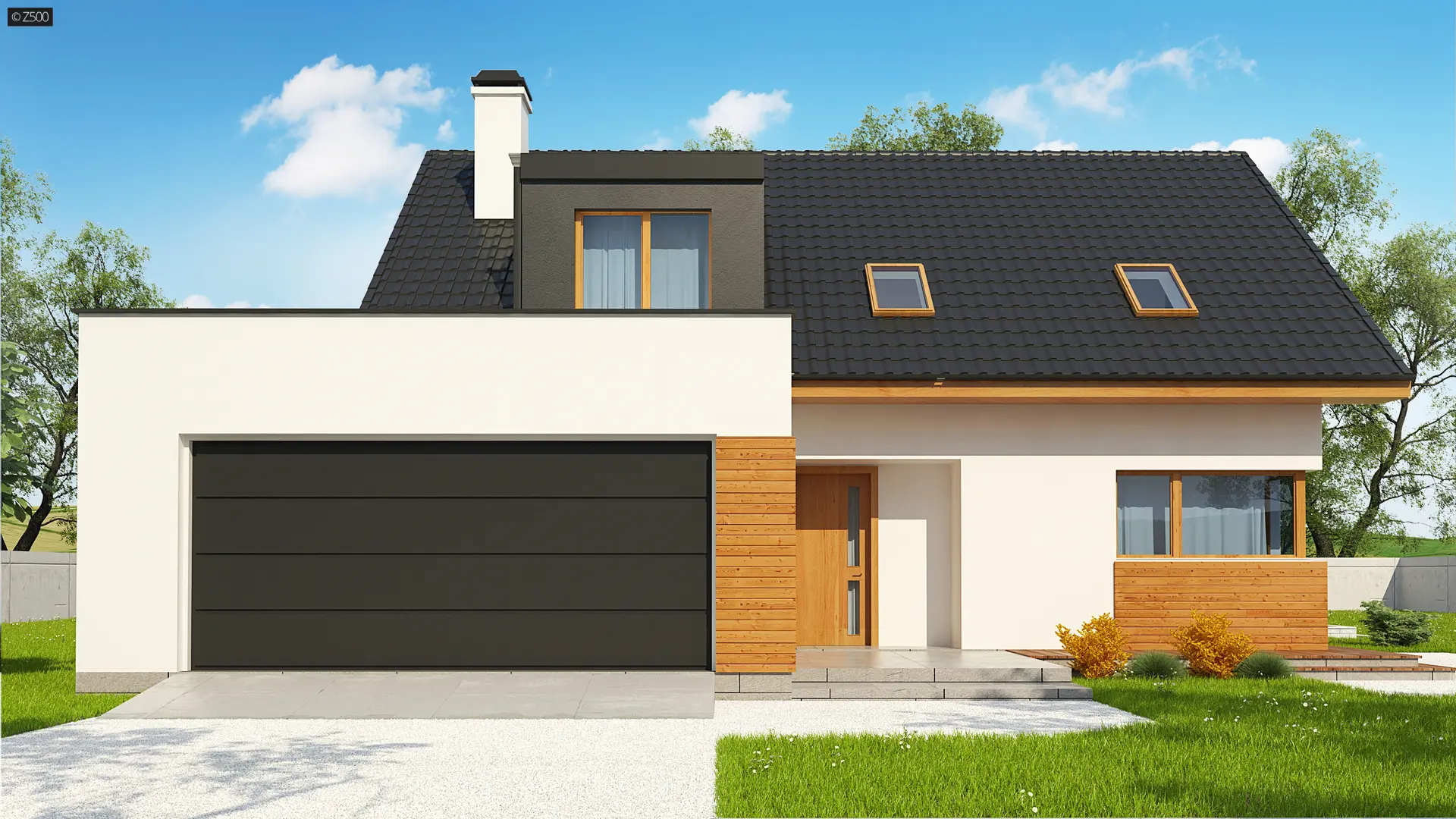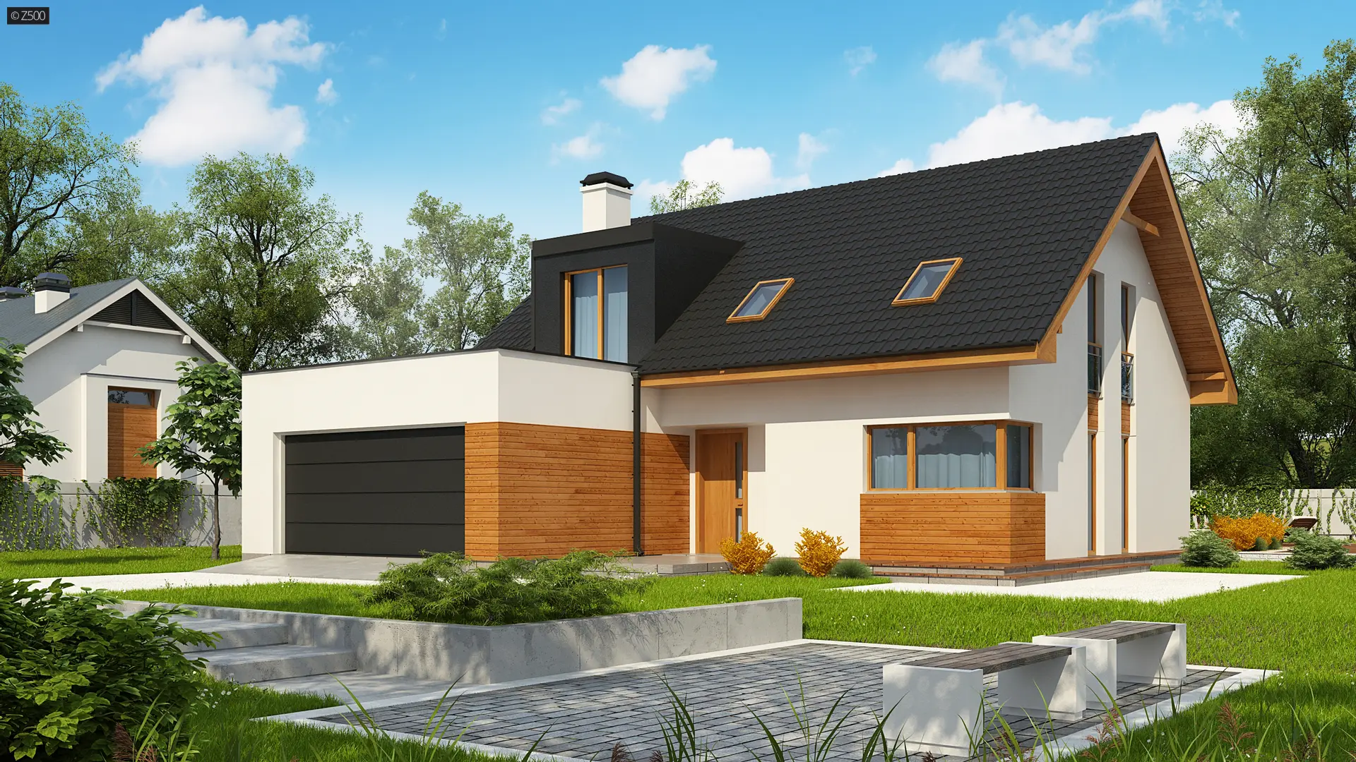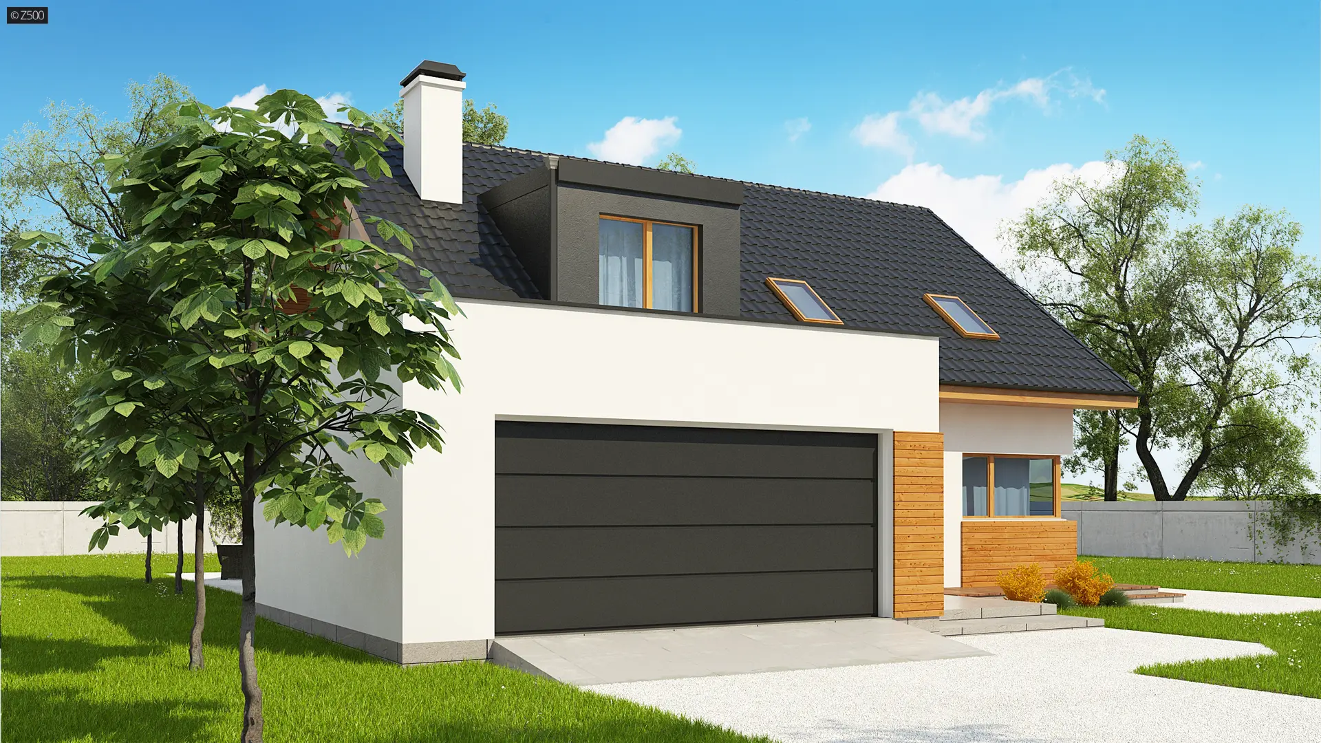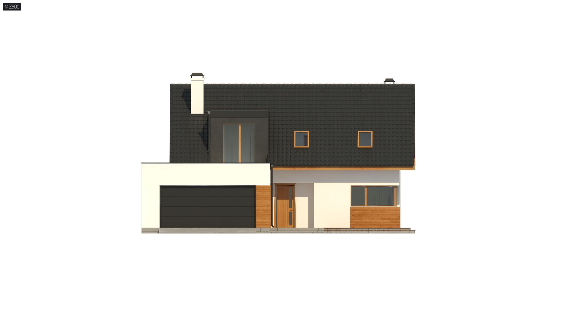 Projekt Z320 jest dużym, ok. 160 metrowym domem dwupoziomowym. Dwustanowiskowy garaż znajdujący się poza bryłą budynku został wysunięty od strony frontu tak, aby dzięki temu zajmował mniejszą szerokość działki. Nad garażem istnieje możliwość zrobienia tarasu, na który prowadzi wyjście z lukarny, natomiast z sieni mamy bezpośrednie wejście do garażu, by nie trzeba było go otwierać z zewnątrz aby dostać się do samochodu.