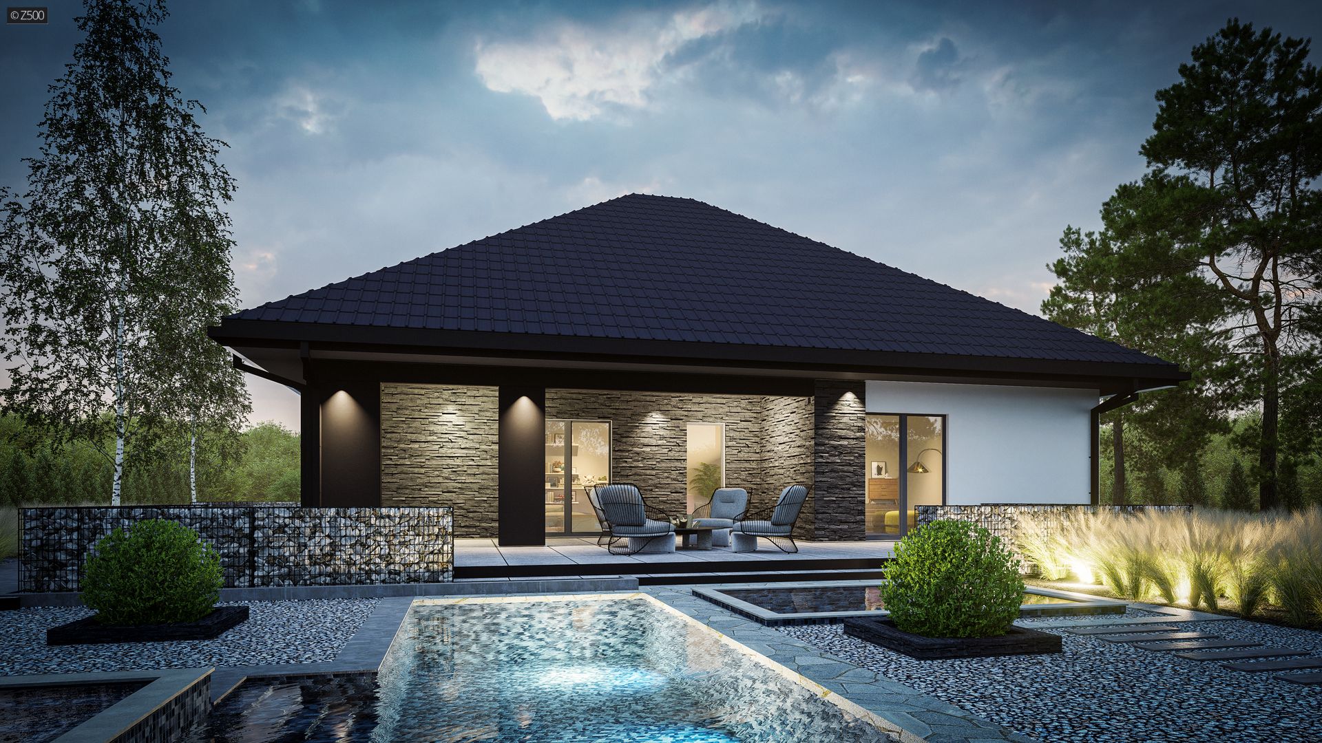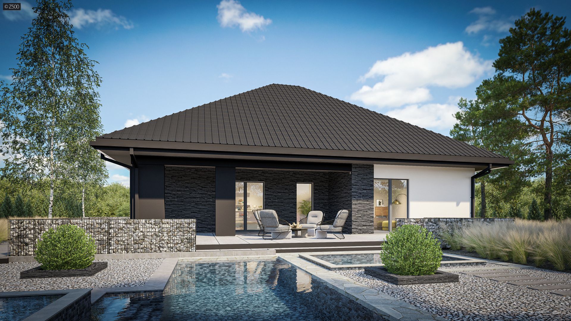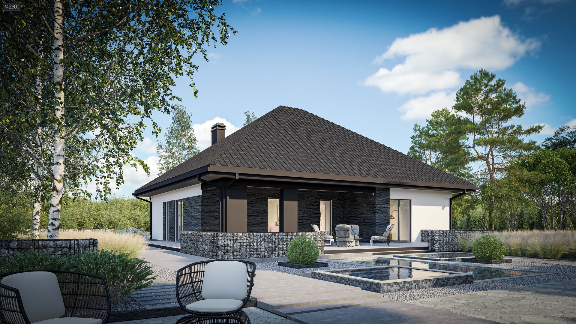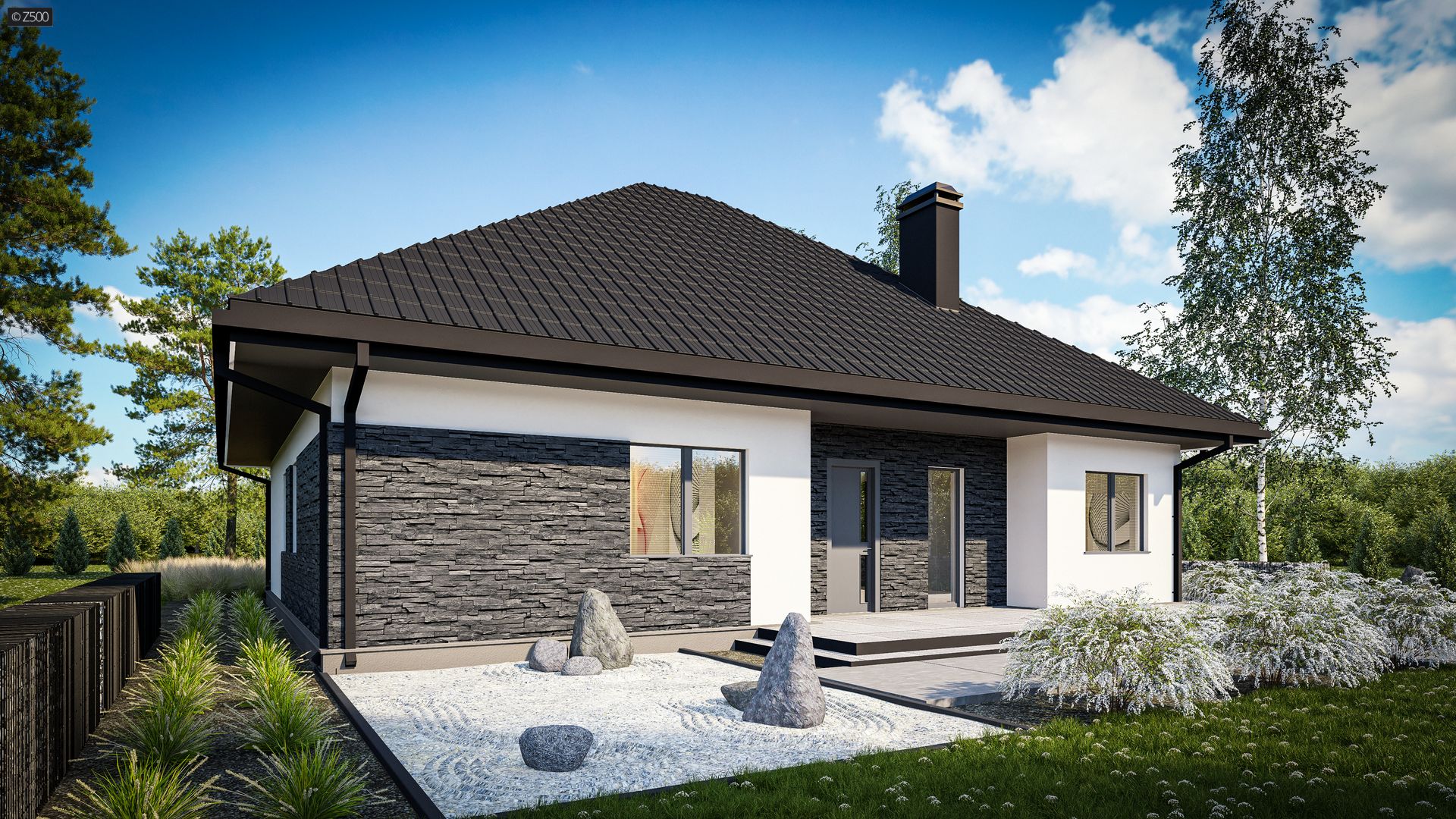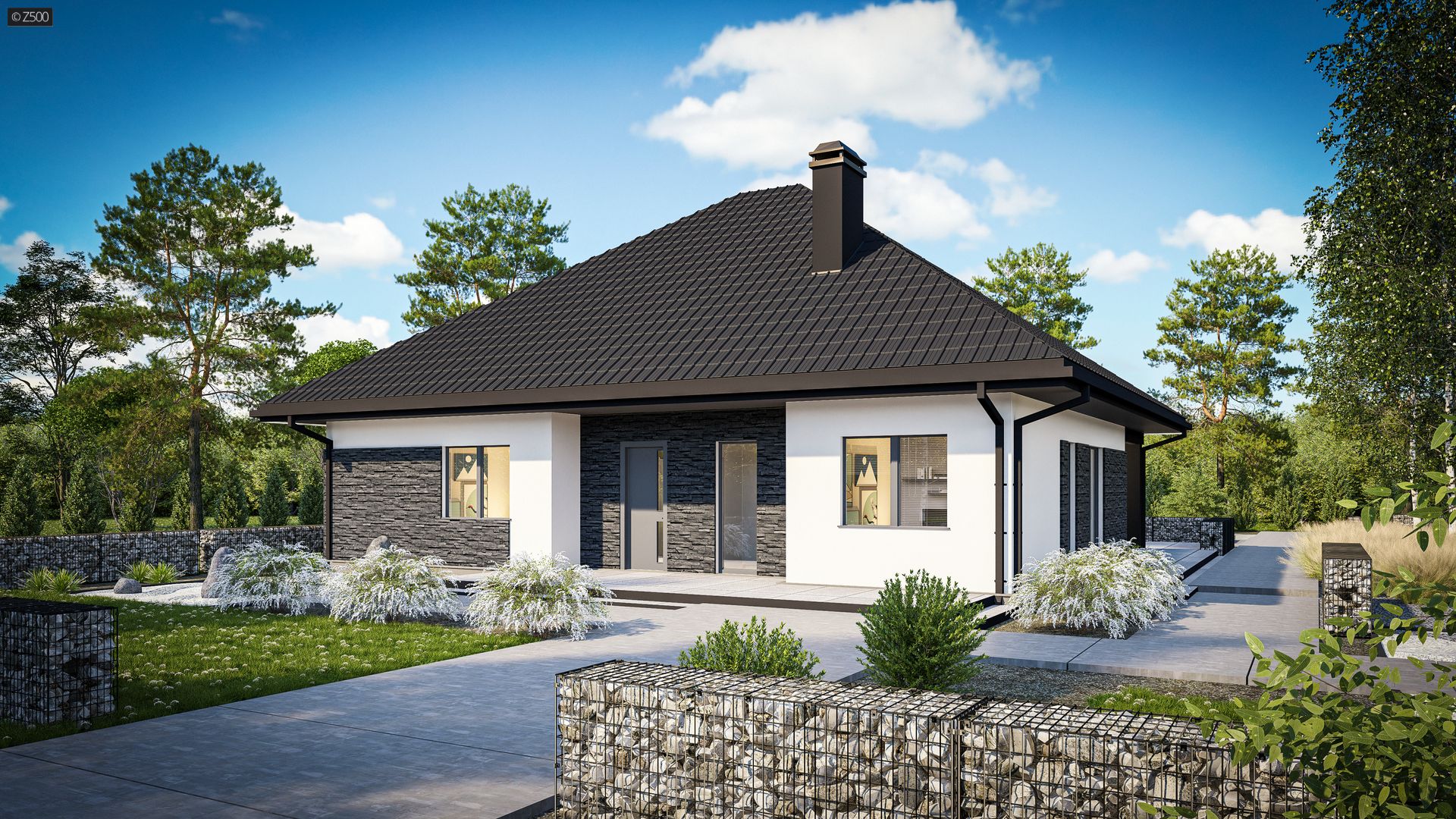 Klasyczny dom parterowy z dachem kopertowym, 4 pokojami oraz dużym salonem.