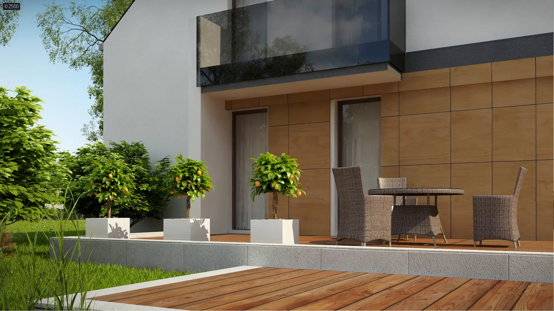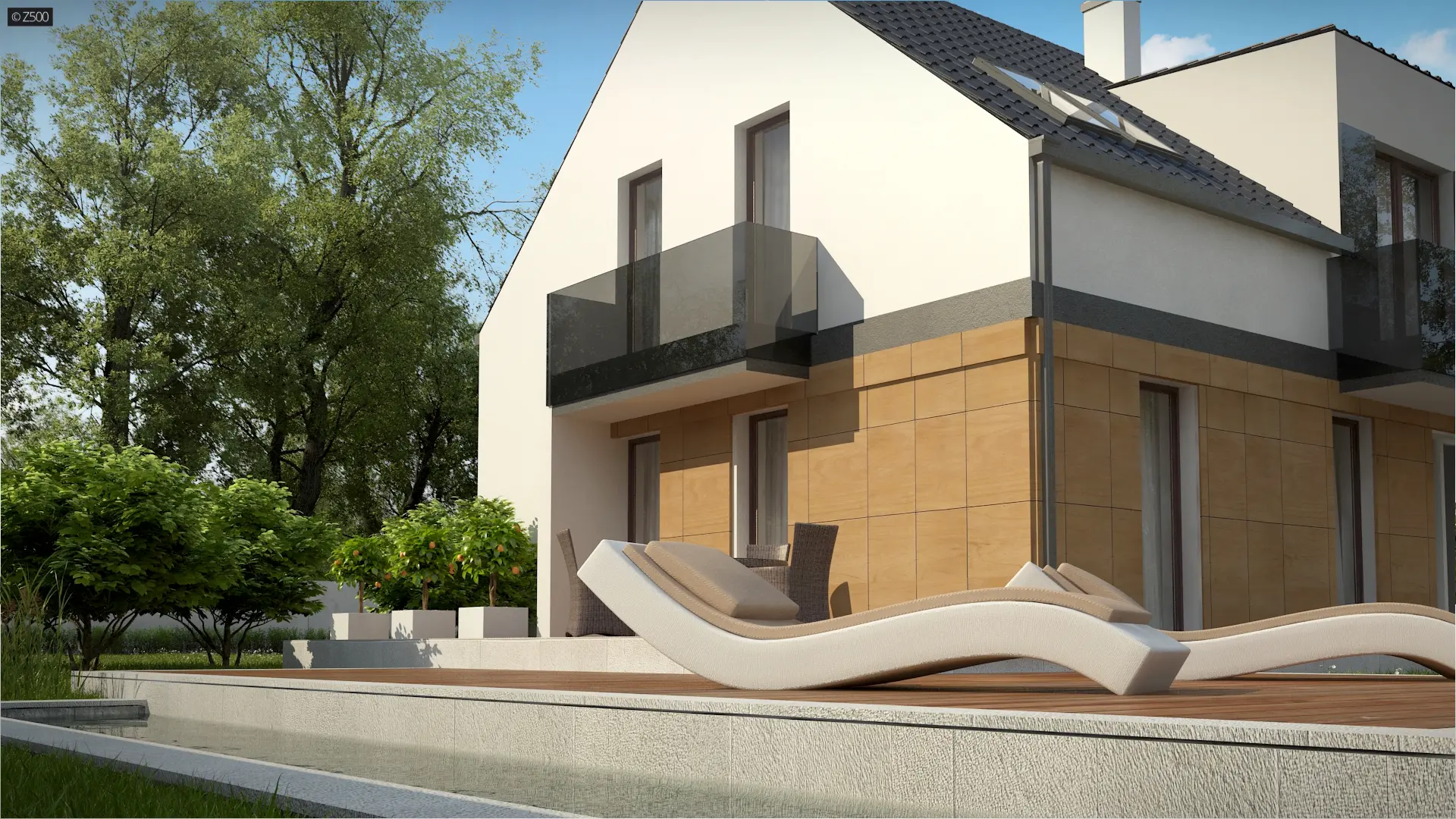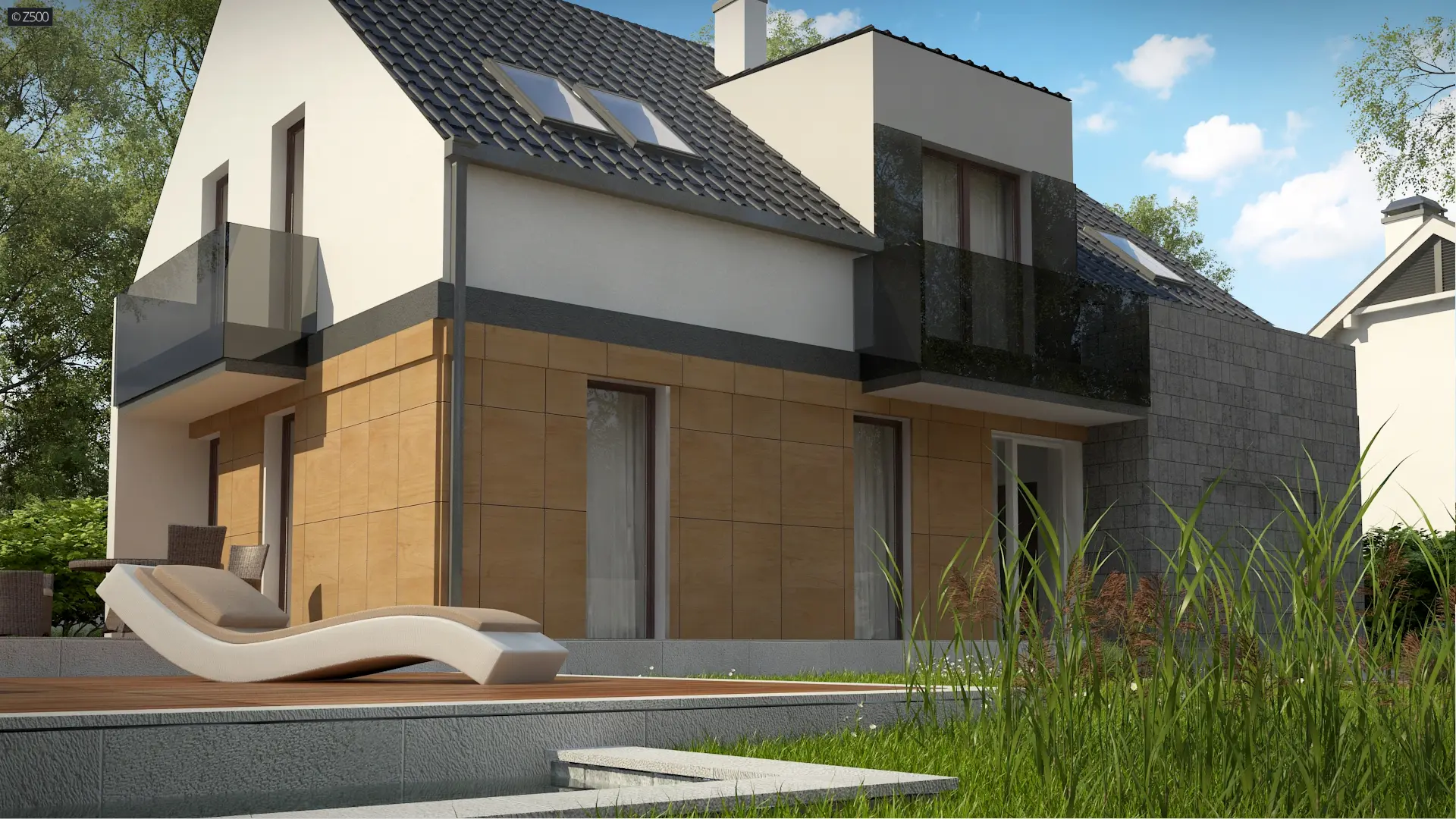 Połączenie bieli i brązu z szarością płytek elewacyjnych na wysuniętej bryle jednostanowiskowego garażu wyróżnia budynek spośród innych. Płaska dachówka stanowiąca rozwiązanie, które cechuje prostota wykonania, funkcjonalność, a także wysoka jakość produktu oraz balkon wykończony przyciemnianym szkłem, nadają wyrafinowanego i osobliwego smaku temu domowi.