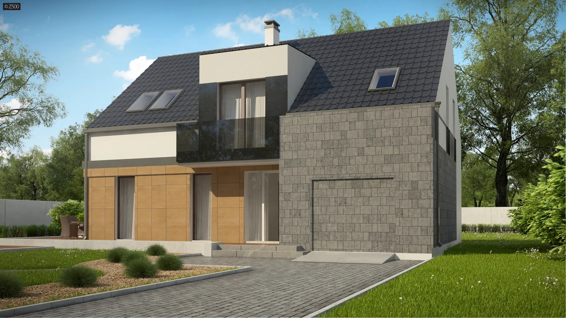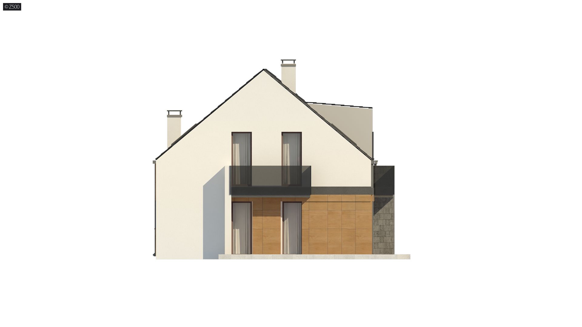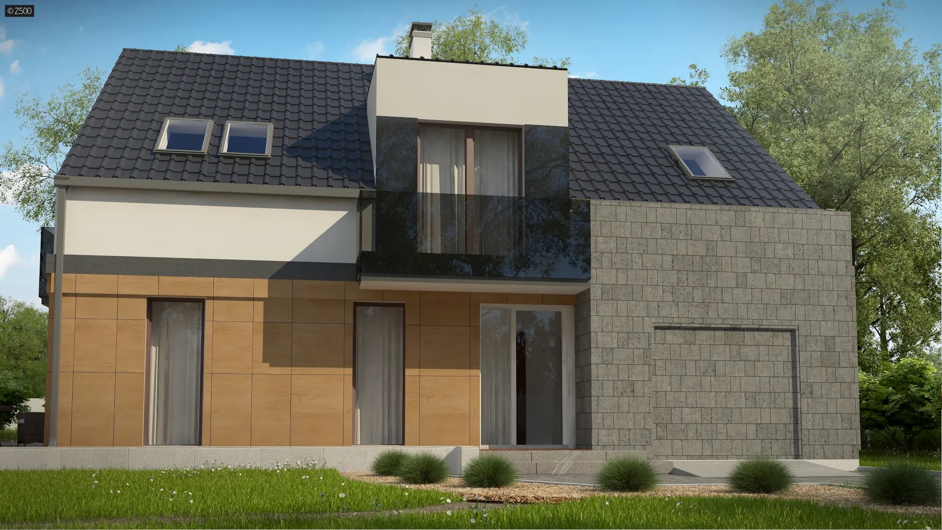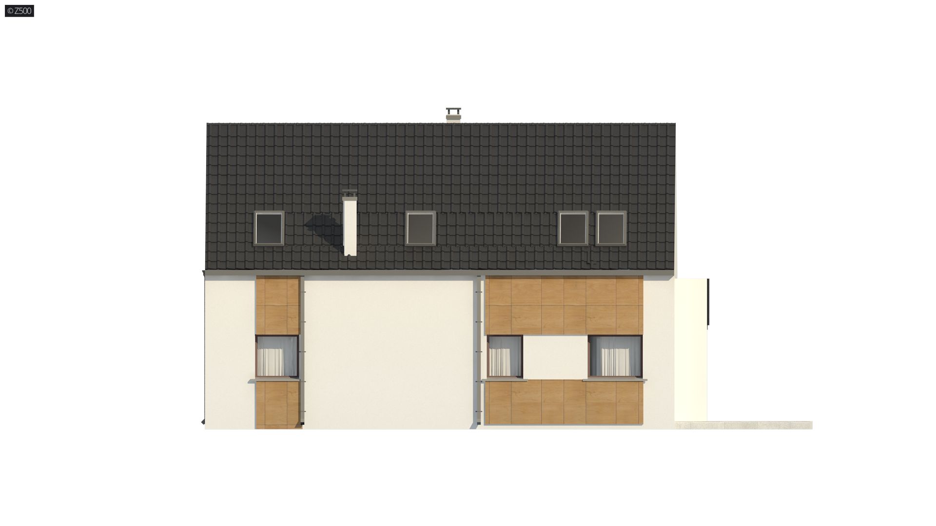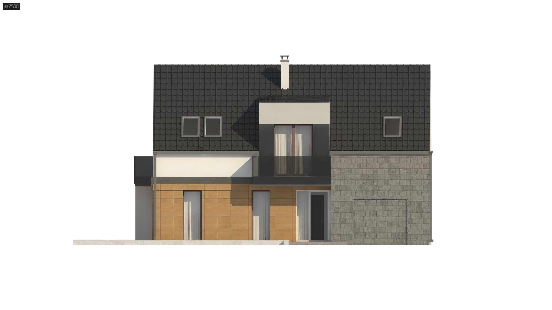 Dom z poddaszem użytkowym z garażem w bryle, salon od frontu z bocznym tarasem