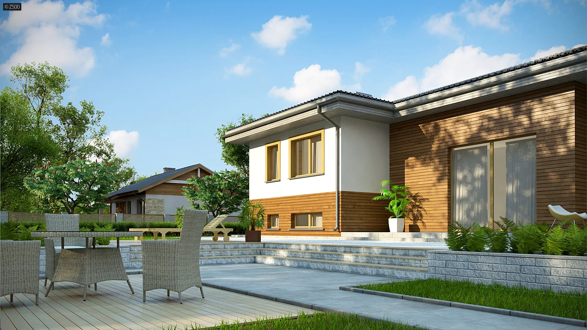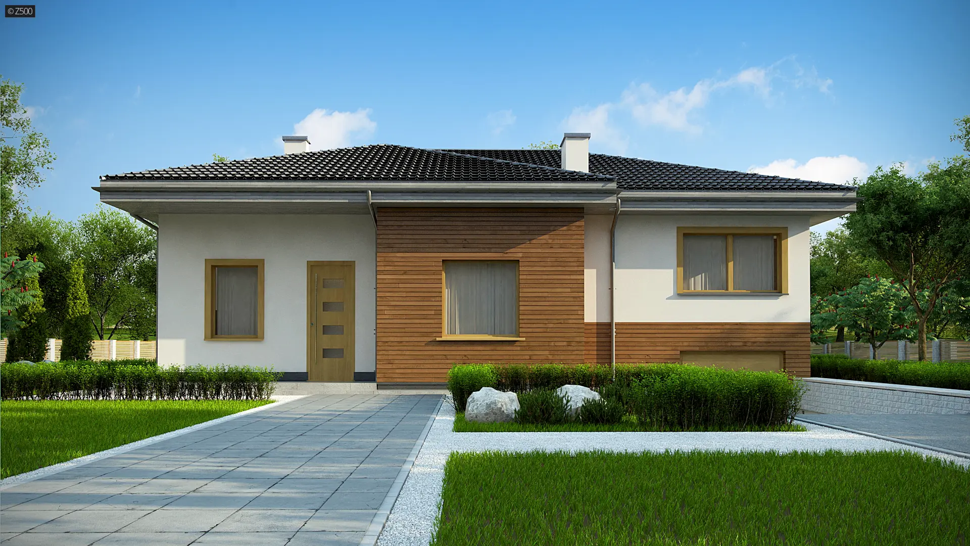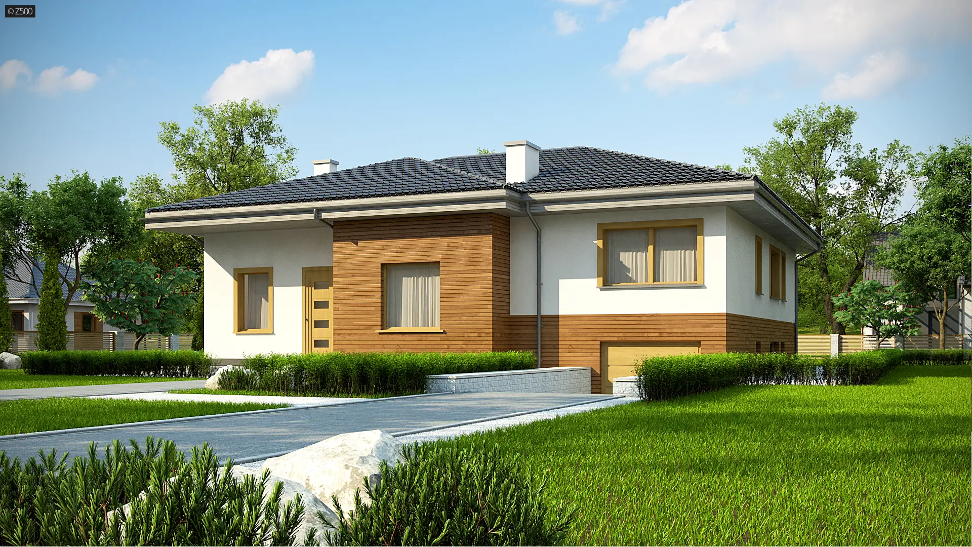 Jest kolejnym domem z serii Z500 z półpiętrem i dachem wielospadowym. Elewację można ozdobić białym tynkiem i brązową cegłą lub drewnem.