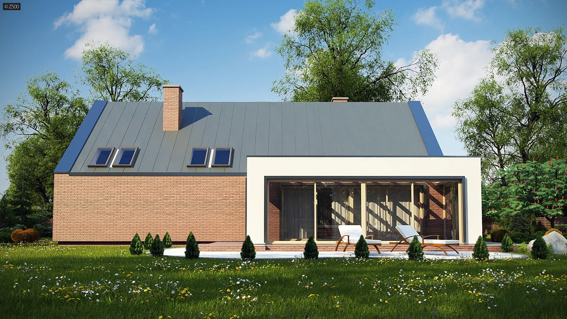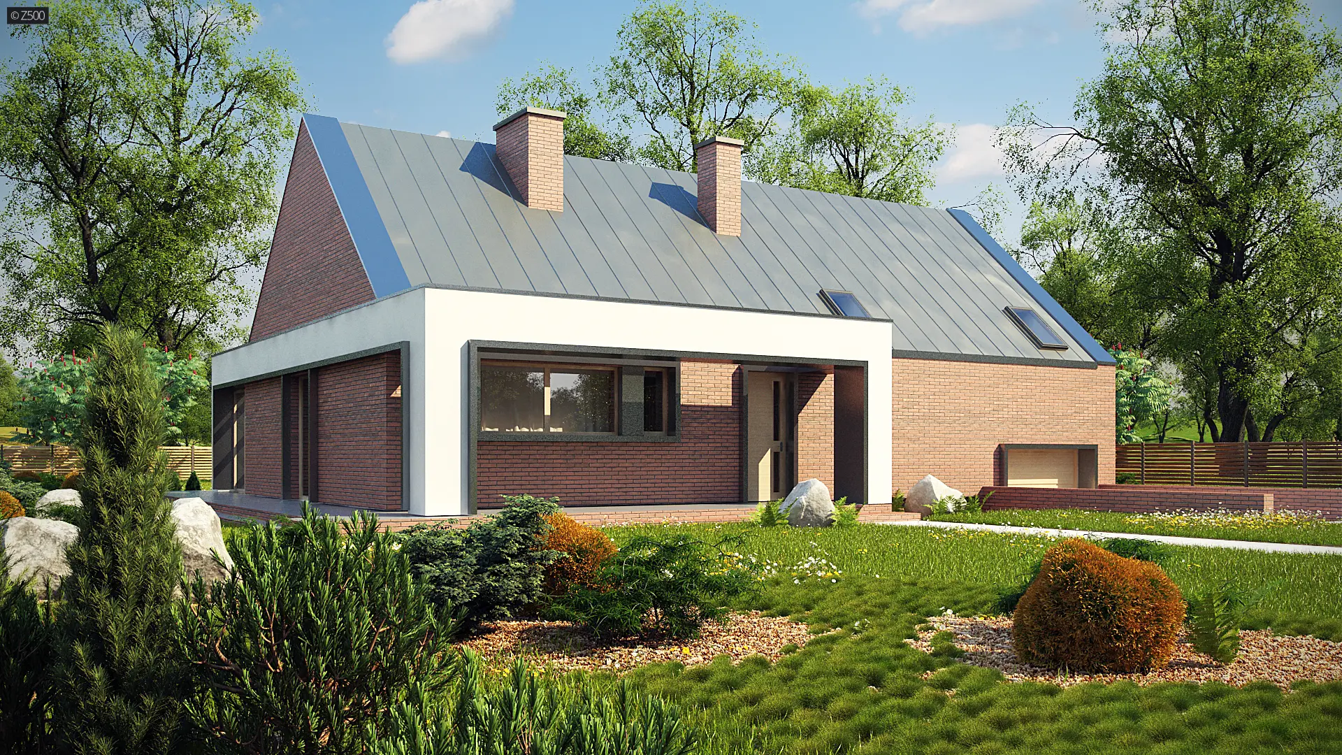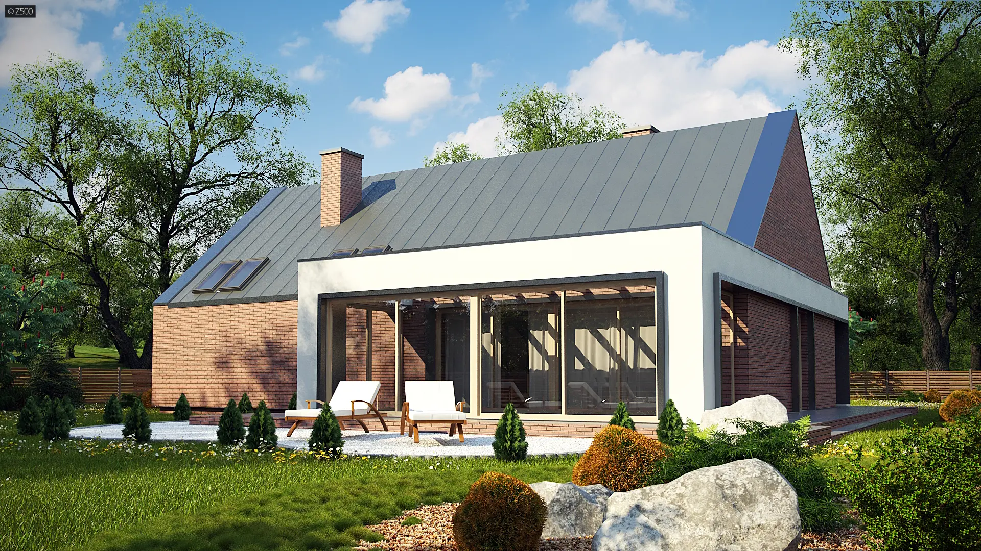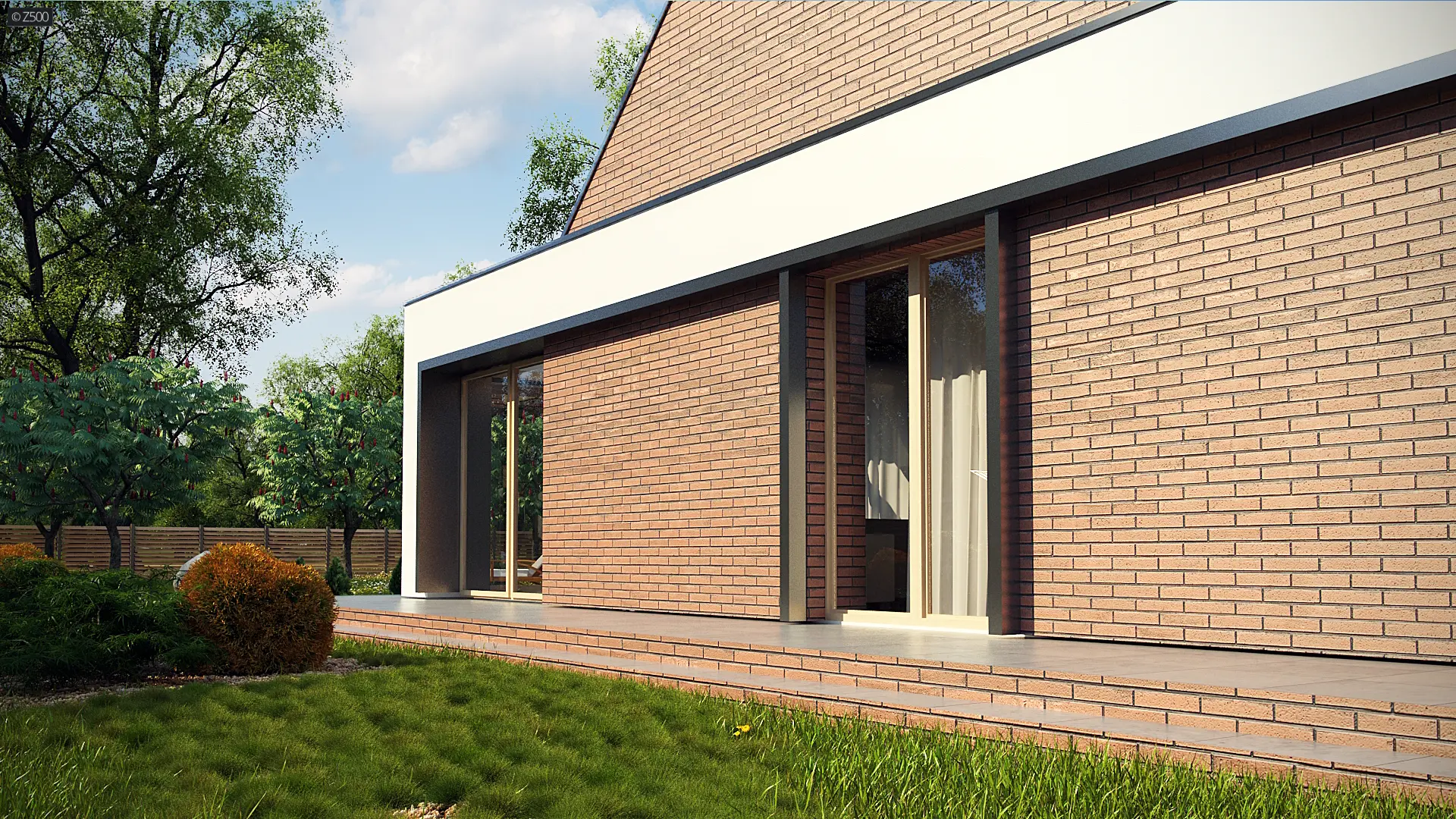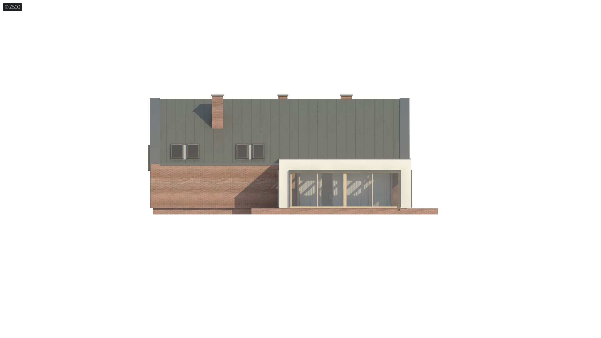Z339 to nowoczesny dom z tradycyjnym dachem dwuspadowym. Charakteryzuje go prosta bryła pokryta trwałą i elegancką cegłą klinkierową. Animuszu dodają mu duże salonowe przeszklenia będące oknem naszego bajkowego ogrodu zimowego.