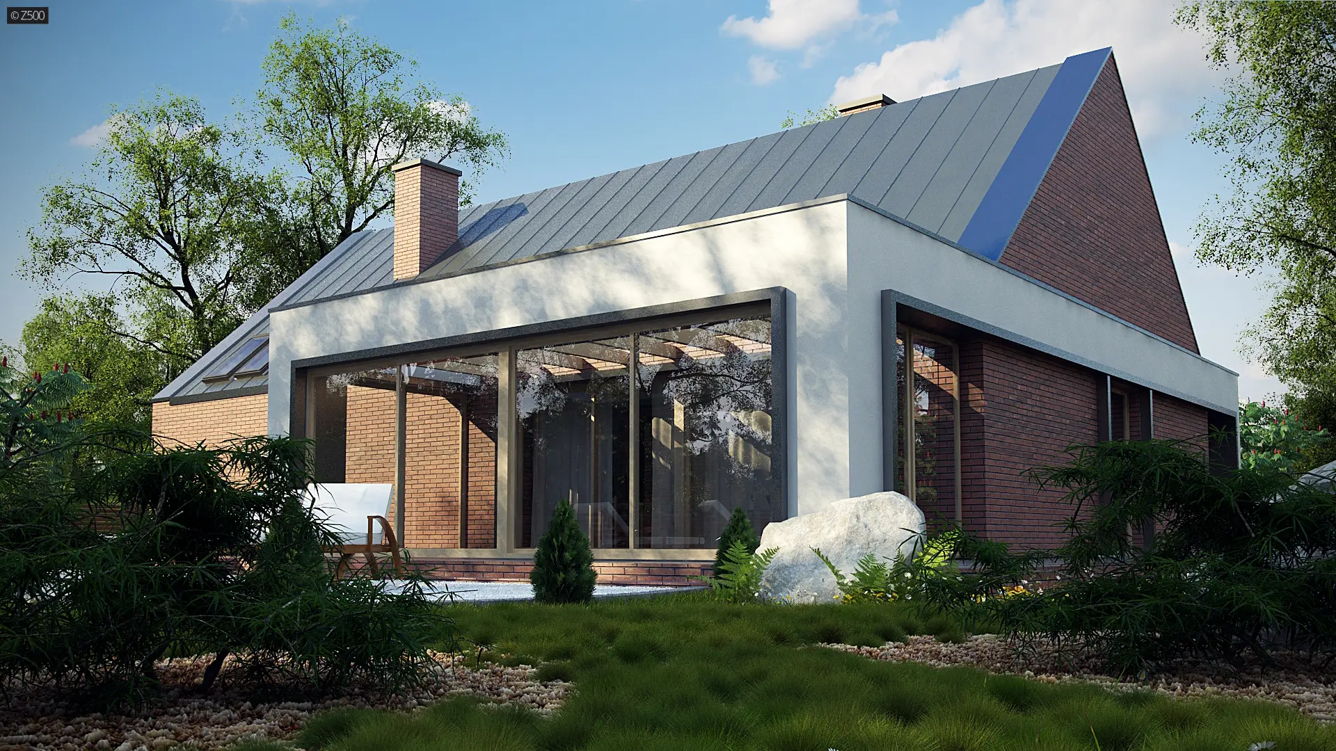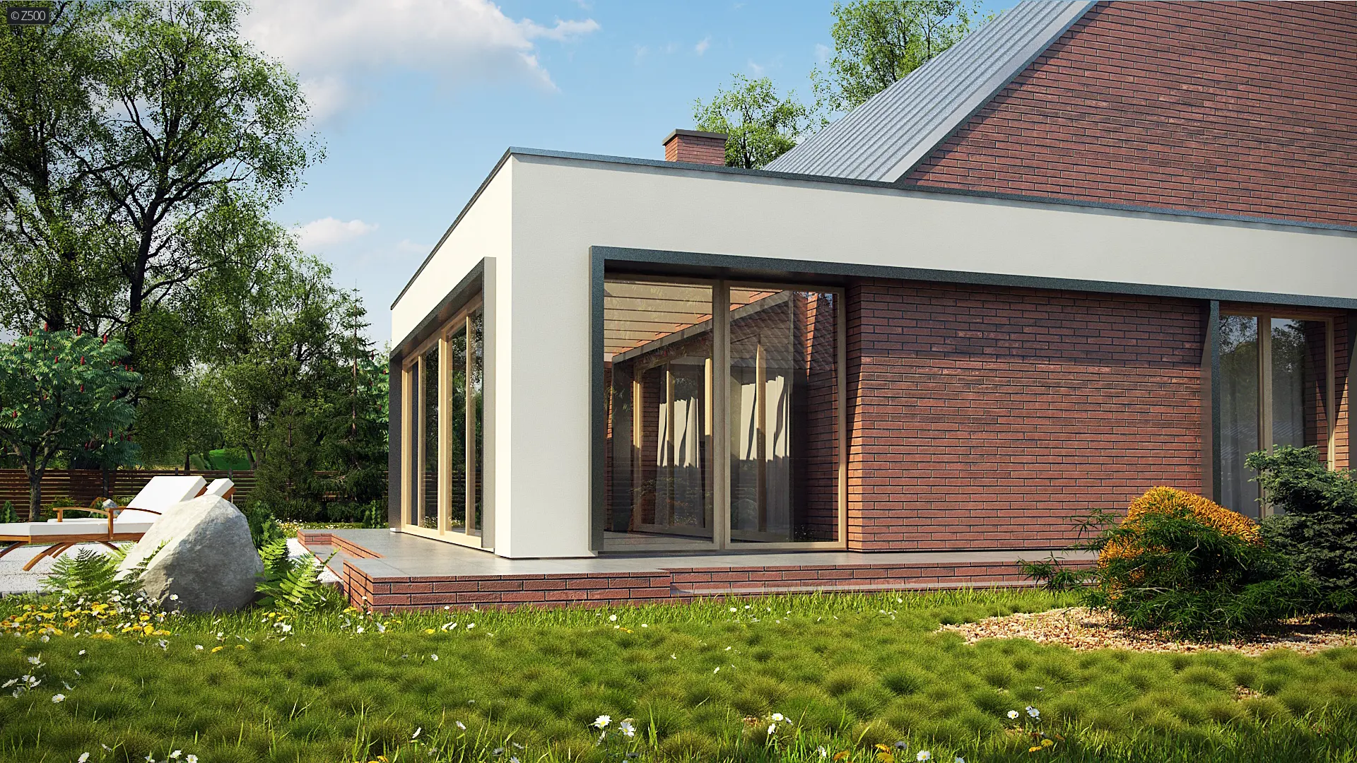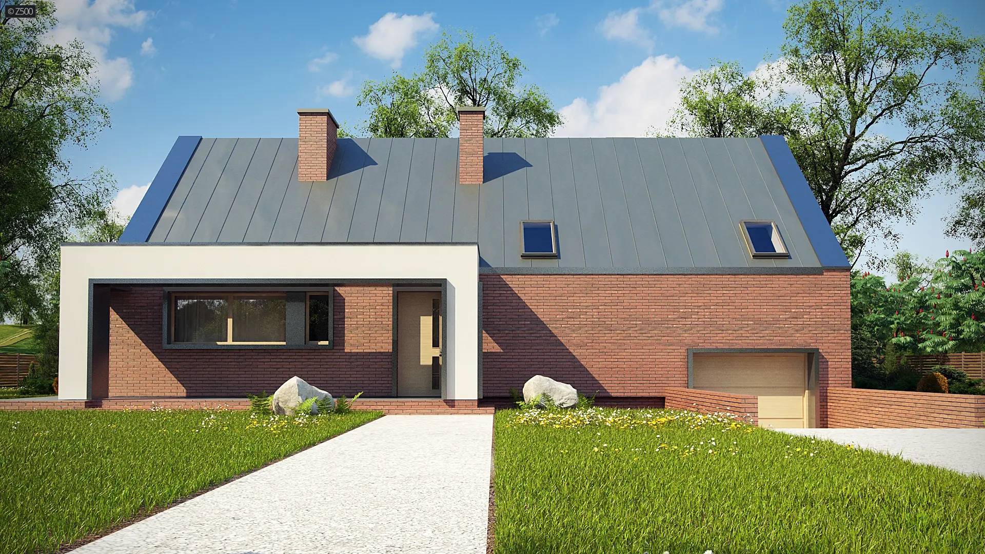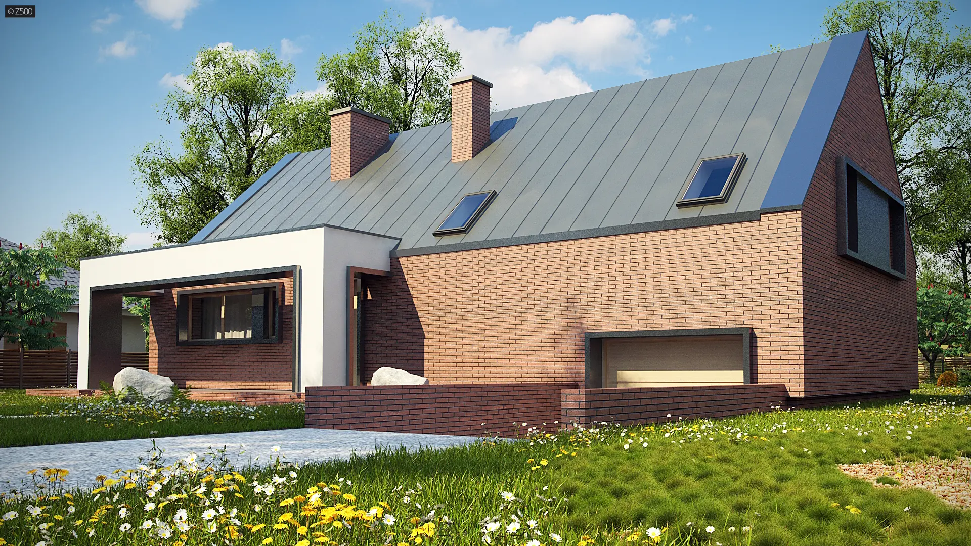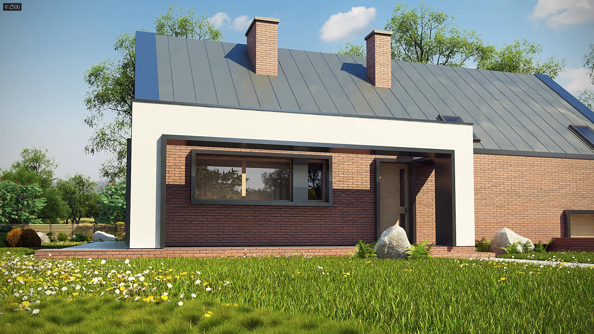 Z339 to nowoczesny dom z tradycyjnym dachem dwuspadowym. Charakteryzuje go prosta bryła pokryta trwałą i elegancką cegłą klinkierową. Animuszu dodają mu duże salonowe przeszklenia będące oknem naszego bajkowego ogrodu zimowego.