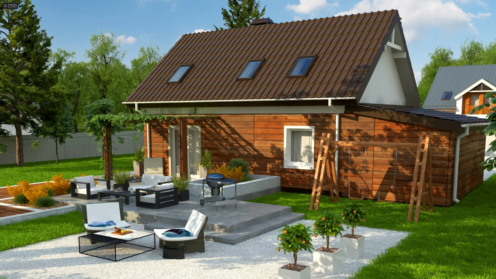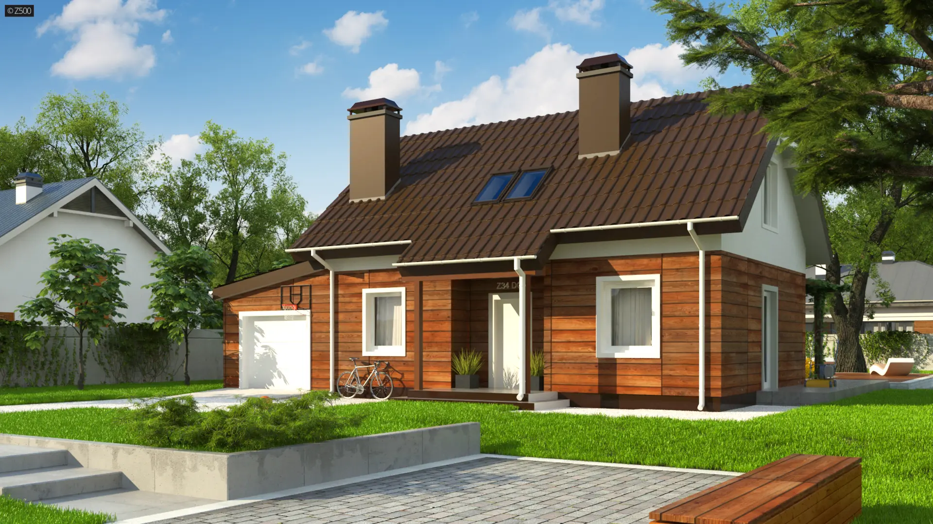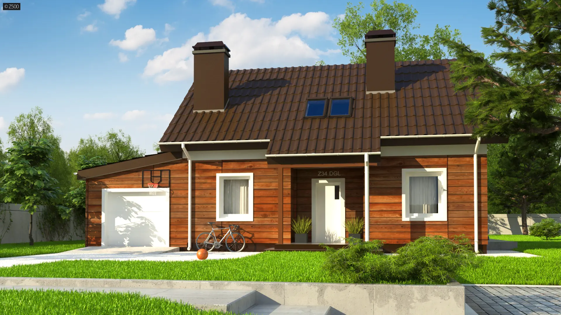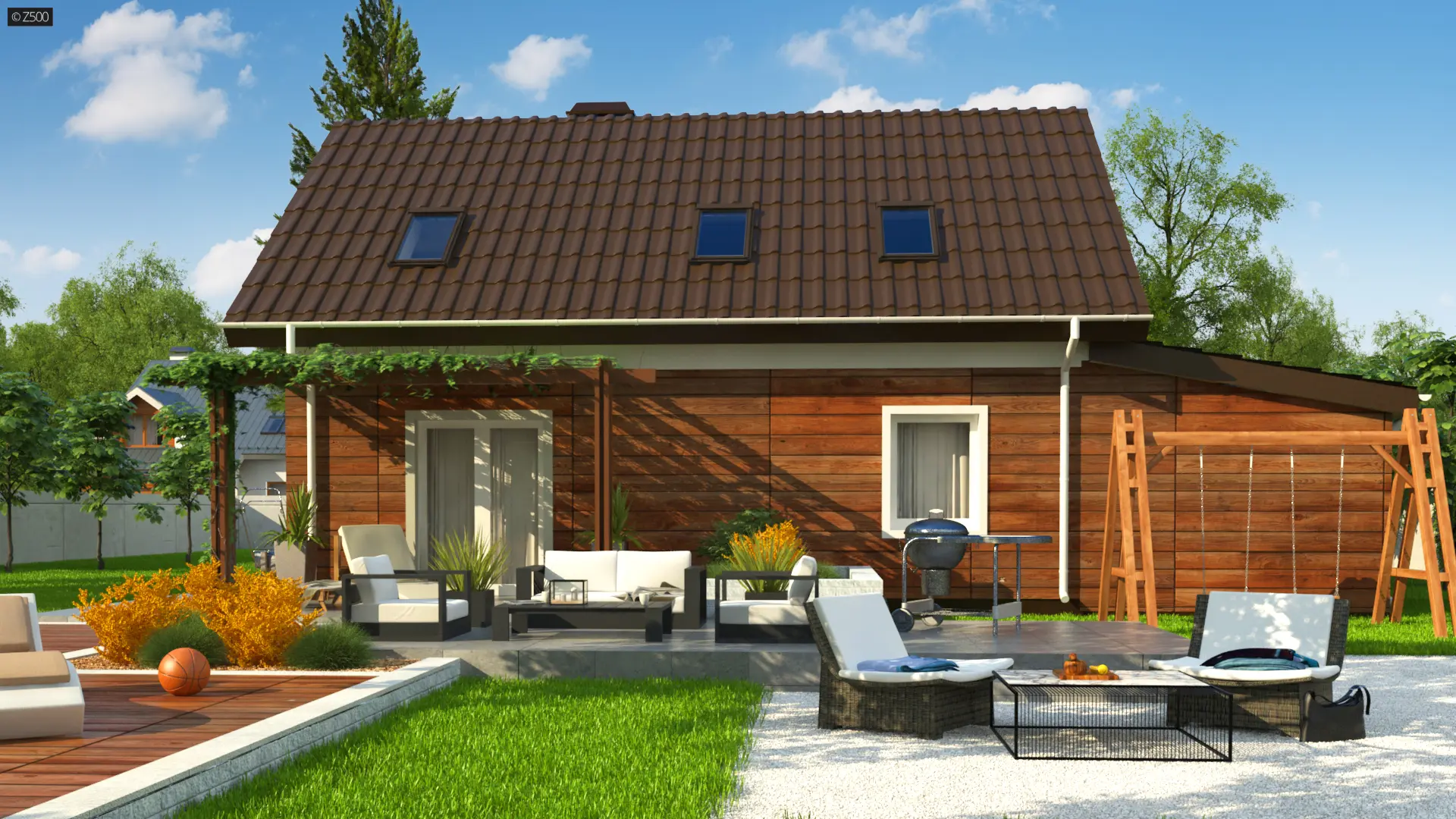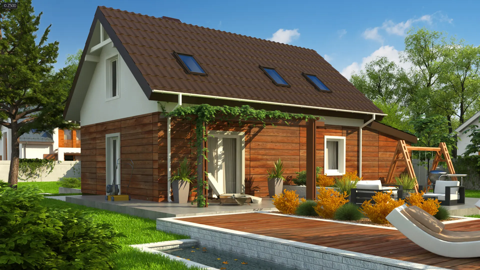 Funkcjonalny drewniany dom z poddaszem, garażem i trzema pokojami